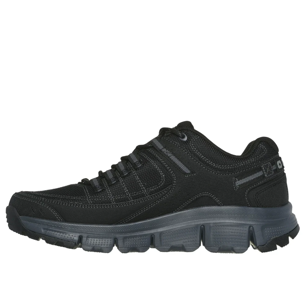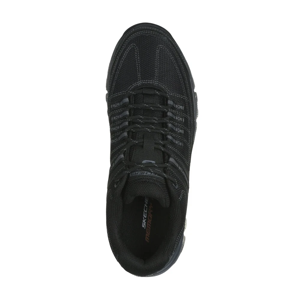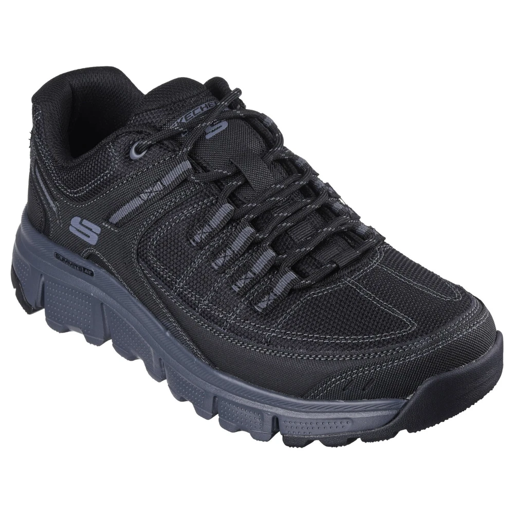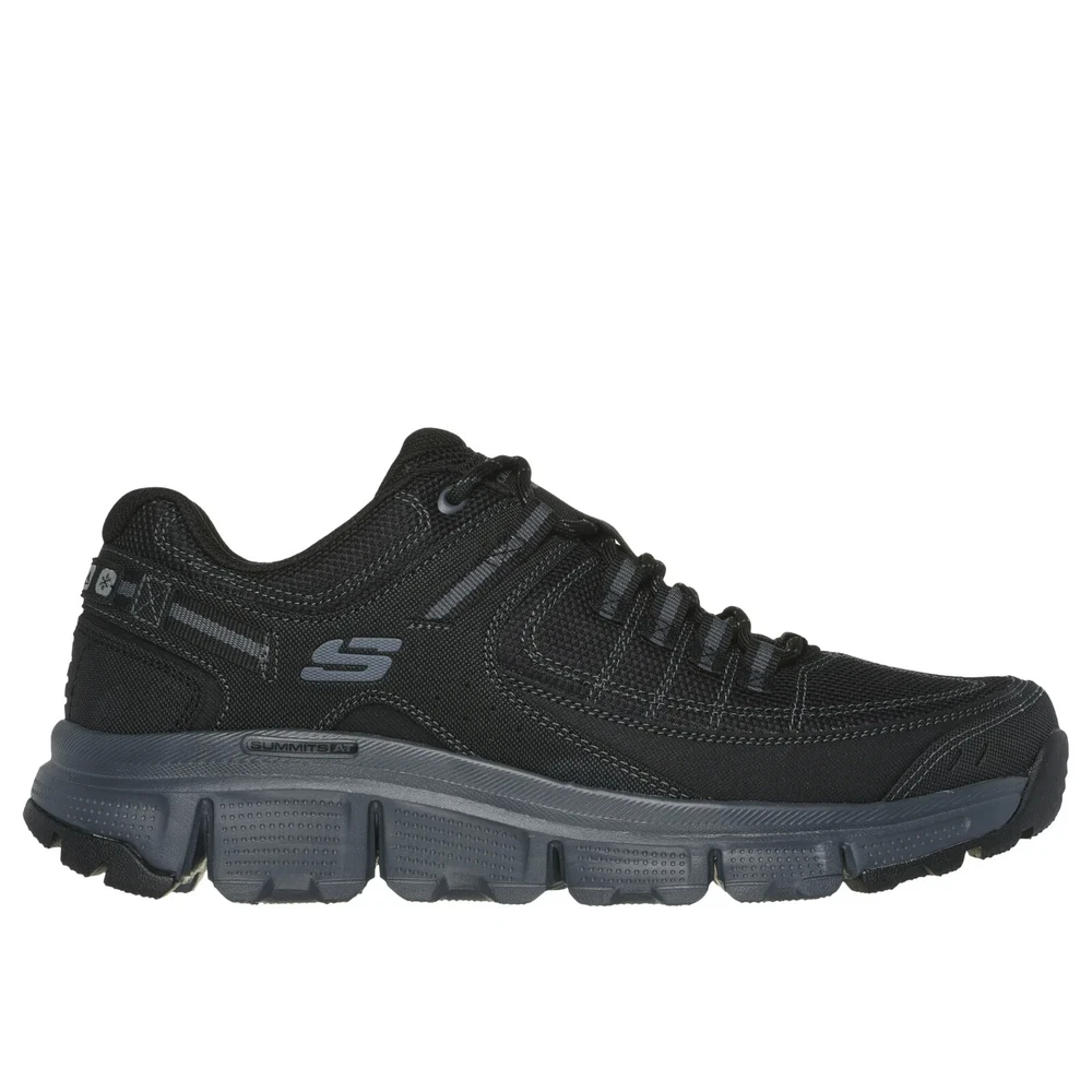 Sporty casual athleisure lace up Skechers Summits AT with a black synthetic mesh upper with cushioned memory foam and a quarter overlay. air cooled memory foam insole synthetic mesh and leather overalys flexible traction outsole relaxed fit *************************************************************************************************************************
