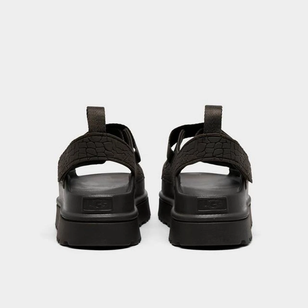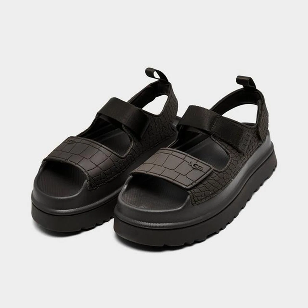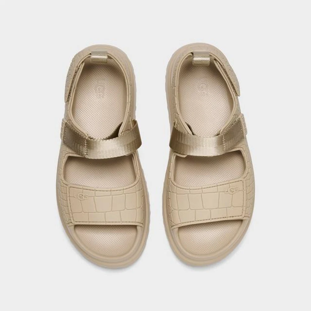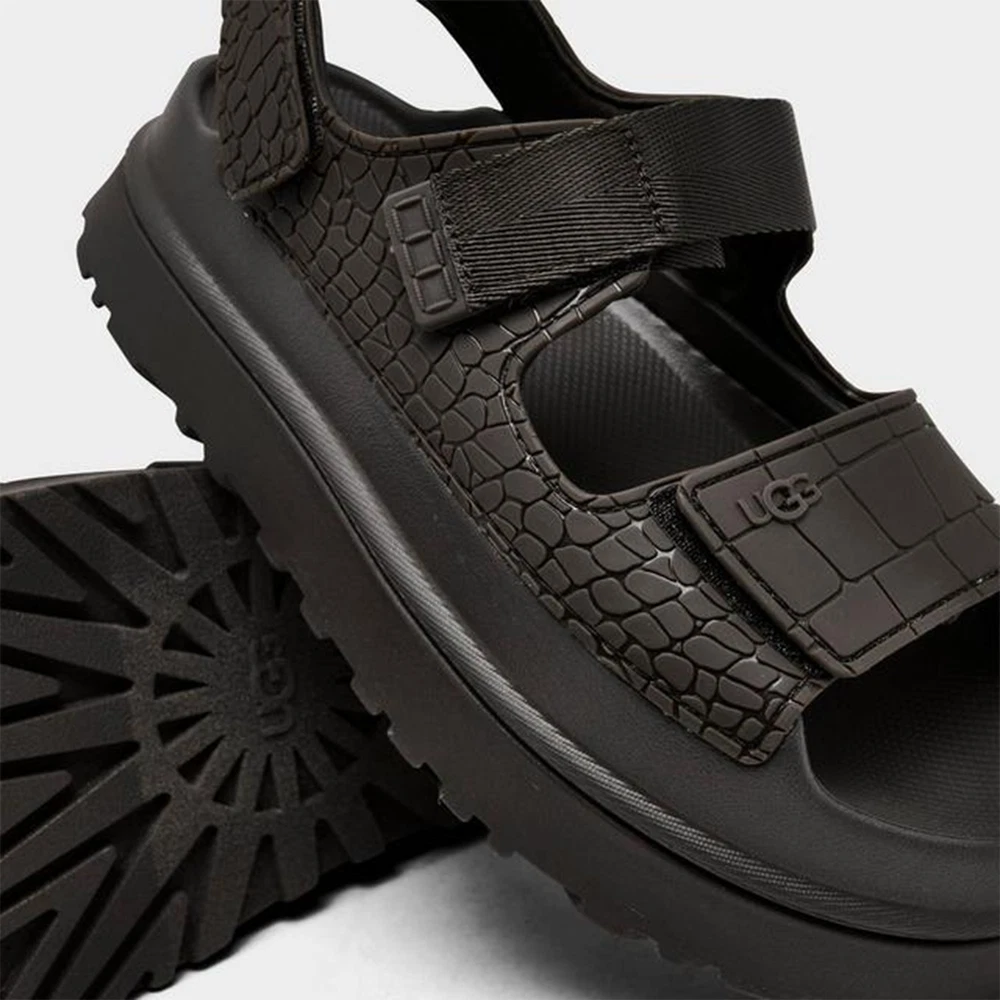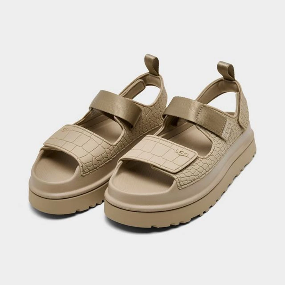 Made from Sustainable Materials Straps are made with about 100% recycled Polyester fibers Upper lining is made from about 100% recycled Polyester fibers Product Features TPU upper with all-over, embossed croc-print pattern Everyday, versatile slides with heat-embossed UGG® logo for distinctive style UGG-branded TPU hook-and-loop triple-strap closure with heel pull tab for a gently locked-in fit Sugarcane EVA midsole and EVA outsole for reliable grip across all surfaces The UGG GoldenGlow Embossed is imported. Roam about in reptilian-inspired comfort after slipping into these Women's UGG GoldenGlow Embossed Slide Sandals. Crafted from a TPU upper with an all-over croc-embossed print, this summer-ready slide silhouette is equipped with a triple-strap hook-and-loop closure, a rear pull tab, an ultralight sugarcane EVA midsole and outsole, and heat-embossed UGG® brand sign-offs.