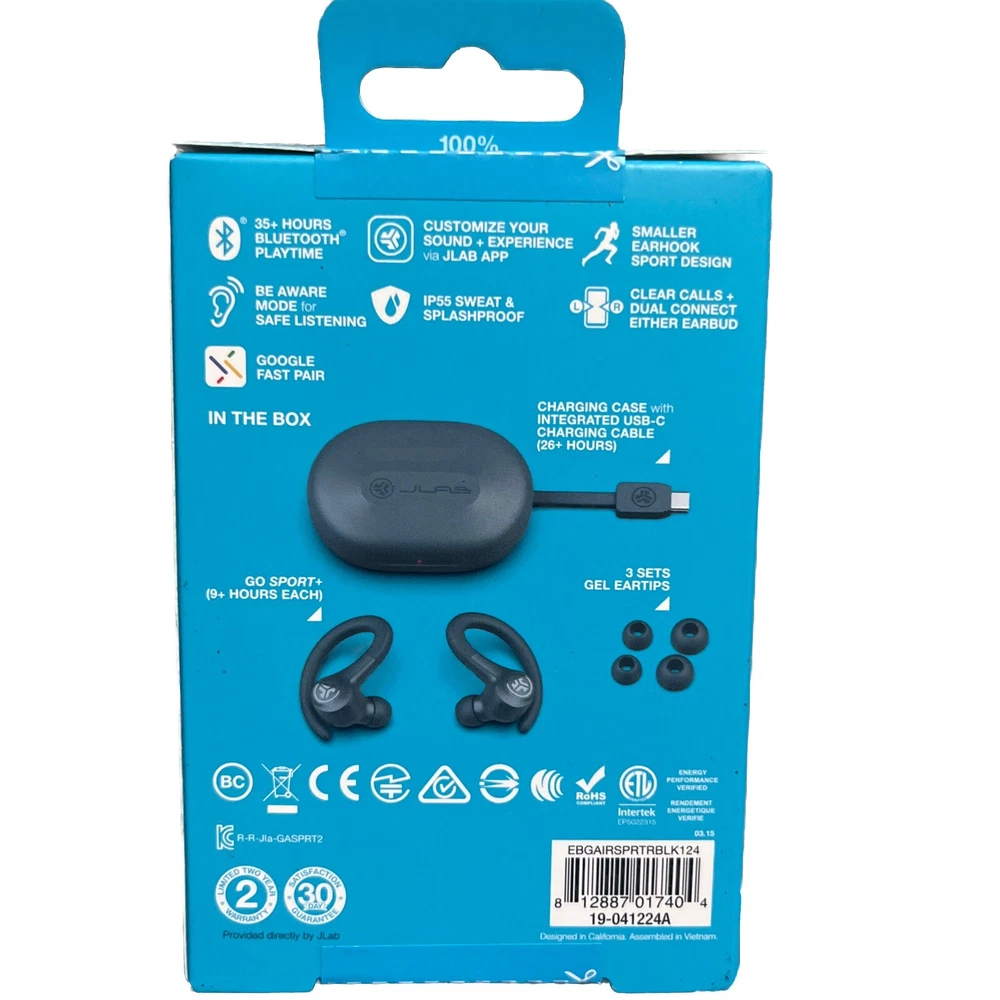 These are JLab GO SPORT+ true wireless Bluetooth earbuds with a charging case. They have an ear-hook form factor, with a graphite color and a double earpiece design. The earbuds feature built-in microphone and wireless connectivity via Bluetooth. The model is GO SPORT+.