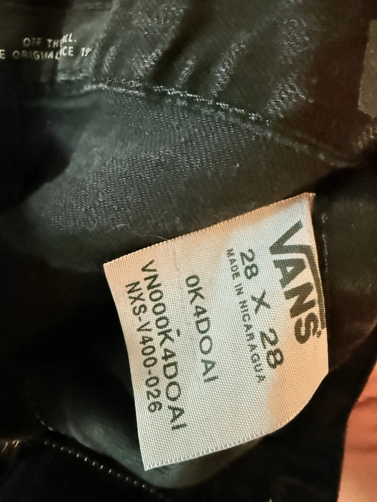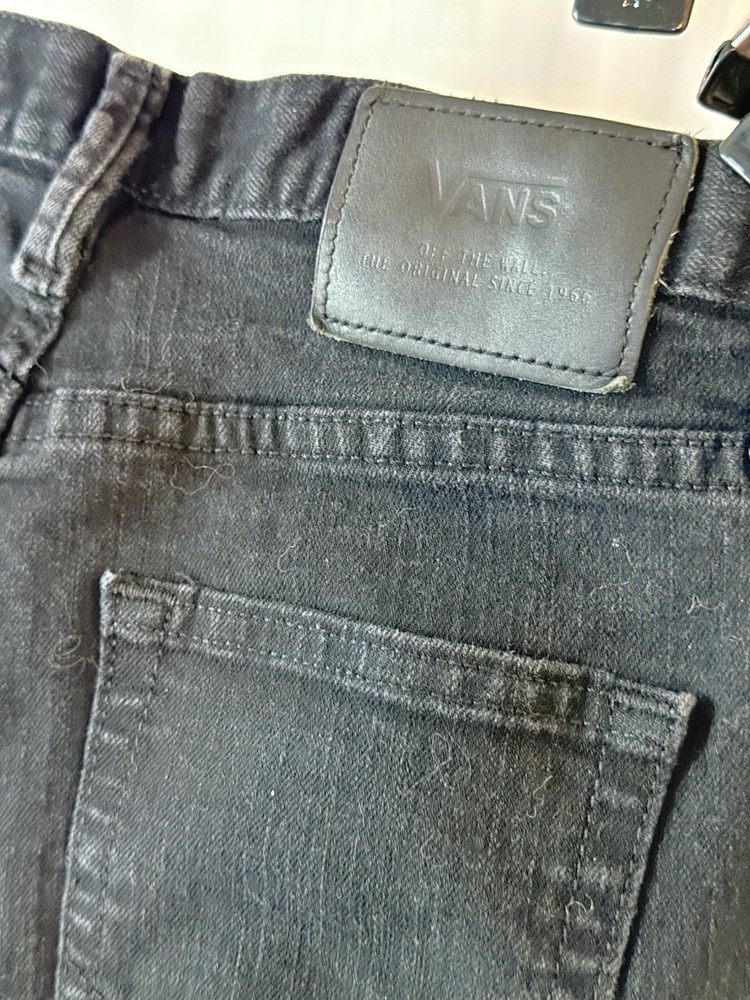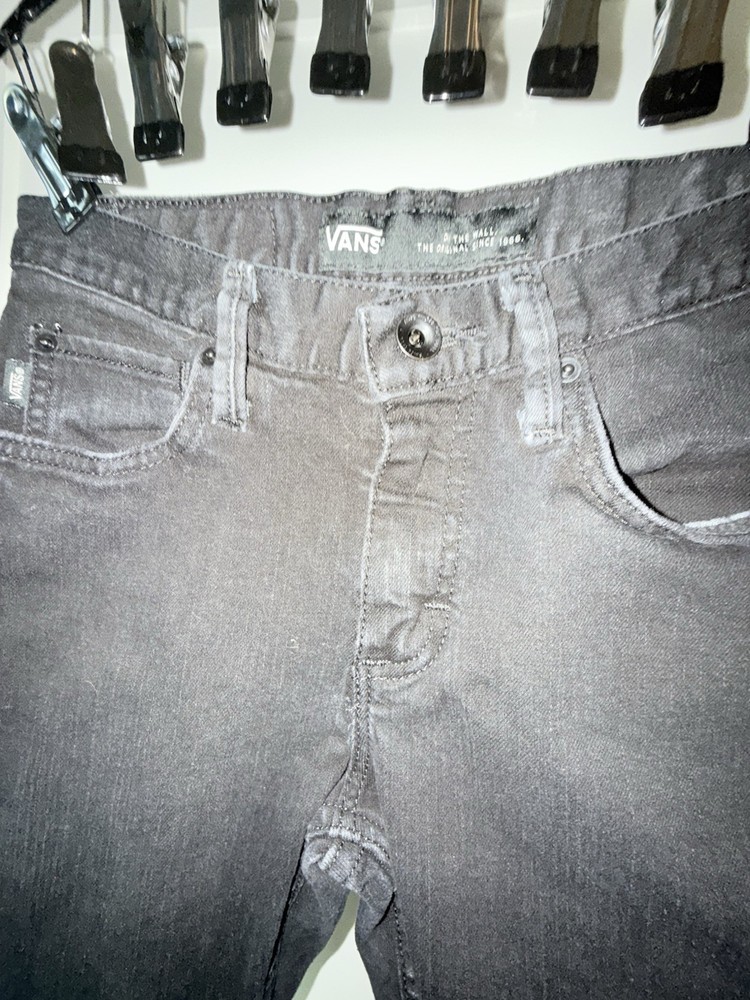 The product is a pair of VANS black jeans for men, with a classic fit and skinny style. The size is 28x28 inches, featuring a grunge theme that is perfect for those embracing a skater-inspired look. These jeans are a stylish addition to any wardrobe, offering both comfort and a trendy design that can be dressed up or down for various occasions.