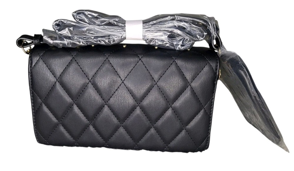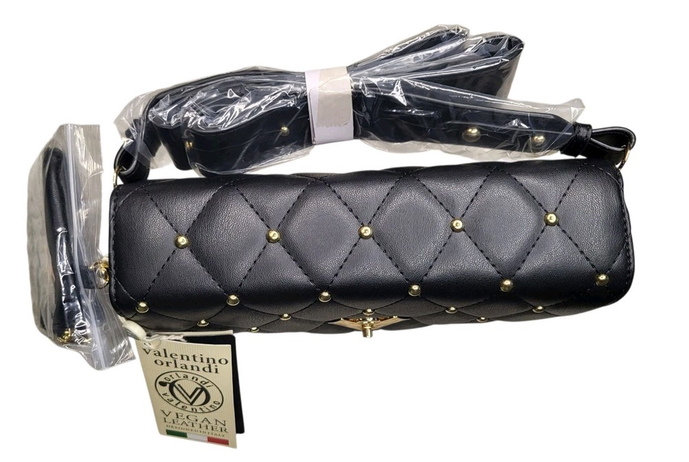 Valentino Orlandi Black Quilted Women's Crossbody Bag With Coin Purse Shipping only Sold as - no returns New with tags MSRP$380 Approximate measurements: L 9" x H 5 1/2" x W 3" Gold hardware, detachable leather crossbody strap, twist lock closure, zipper coin purse Chic vegan leather black crossbody bag with striking gold studs. Features signature Valentino Orlandi design. Perfect for stylish outings.