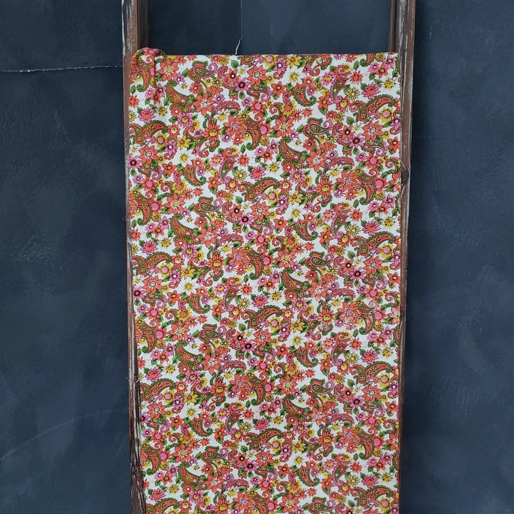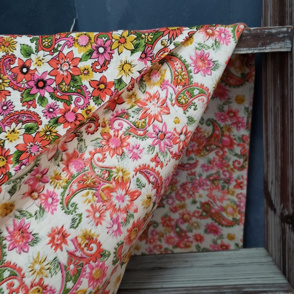 Vintage mid-century lightweight cotton fabric remnant, 17" X 86" in excellent condition. This is a long, narrow piece of fabric, no flaws that I can find, no evidence that it was used previously. The pattern is a colorful floral and paisley print, the retro design reminds me of my fabrics from the 40s and 50s. This is from an old seamstress stash. It would make amazing additions to patchwork creations, up-cycled clothing, apron/apron dress or top, short curtains, etc. 17" X 86"