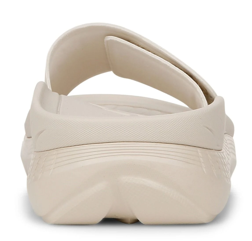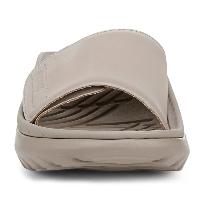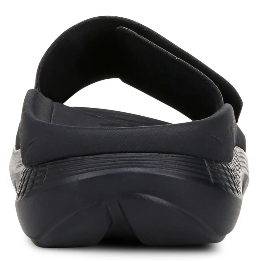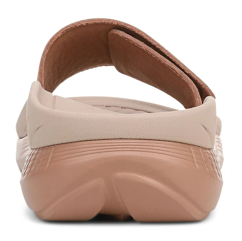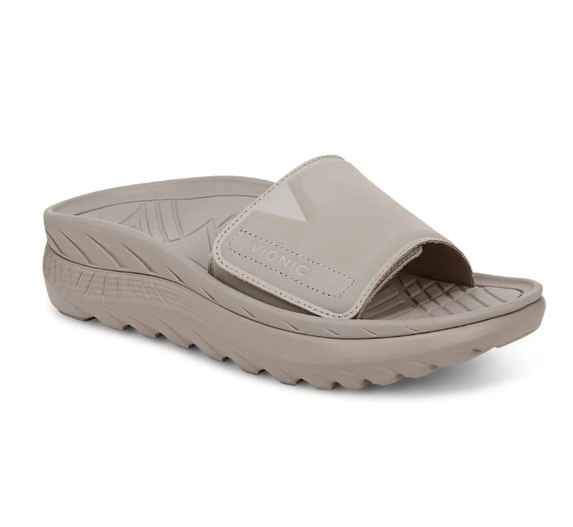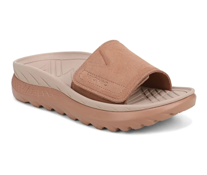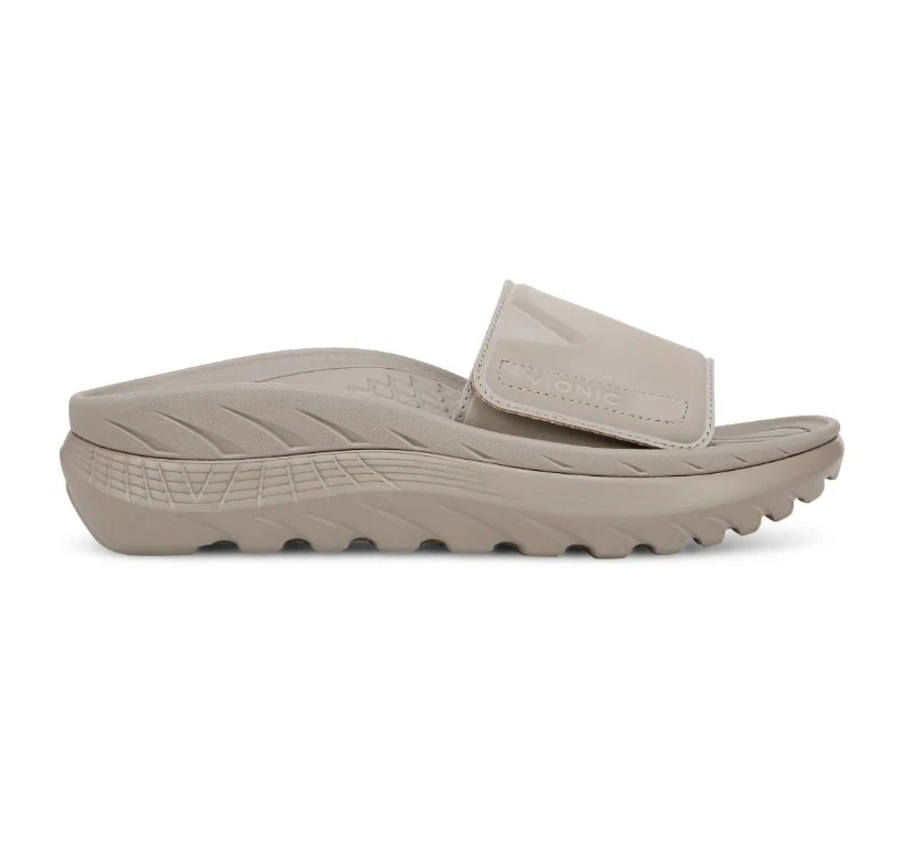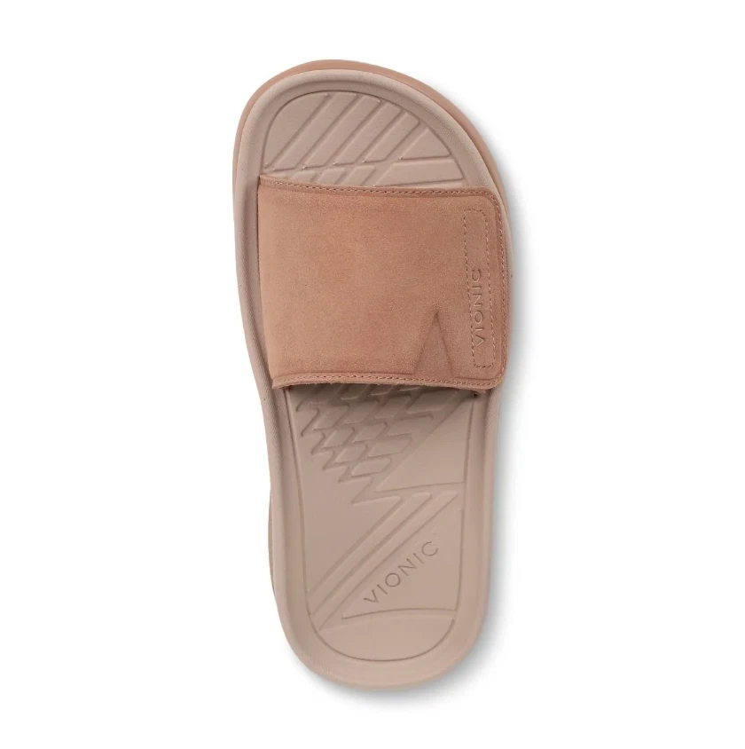 Description Show your feet some love in this recovery slide featuring adjustable straps, textured footbeds and dual-density cushioning. Details Tested by Heeluxe: The footwear industry gold standard, Heeluxe uses patented technology to analyze comfort and performance against competitive styles, in conditions that duplicate real-world wear. Superior dynamic stability and propulsion. Superior foot contact & pressure distribution for maximum recovery. Molded EVA footbed with oversized sidewall and deep heel cup. Uppers: Suede or synthetic nubuck. Dual-density midsole balancing cushion. Texturized footbed for massaging comfort. Adjustable cushioned upper. Outsole: EVA. Heel height: 2.0 inches. Received APMA Seal of Acceptance. Fit & Care Women's whole sizes 5 to 14 Men's half sizes 7.5 to 12.5 If you are between sizes, we recommend going up to the nearest size. Fits medium widths. For the greatest comfort, we recommend wearing your new Vionic footwear or orthotics for just a few hours for the first few days to allow your feet to adjust to the new level of orthotic comfort and support. Within one to two weeks you should find the product completely comfortable and supportive. To preserve the appearance of your Vionic shoes, we recommend that you clean the uppers, if needed, using a dry, cotton cloth to wipe away dirt or dust. If your shoes or sandals become wet, please allow them to dry naturally. We recommend that you test any cleaning product by applying a small amount to a discreet area and allowing it to dry. Do not use cleaners which contain acid or detergents, as they may damage and prematurely age the leather.