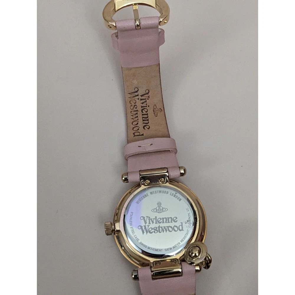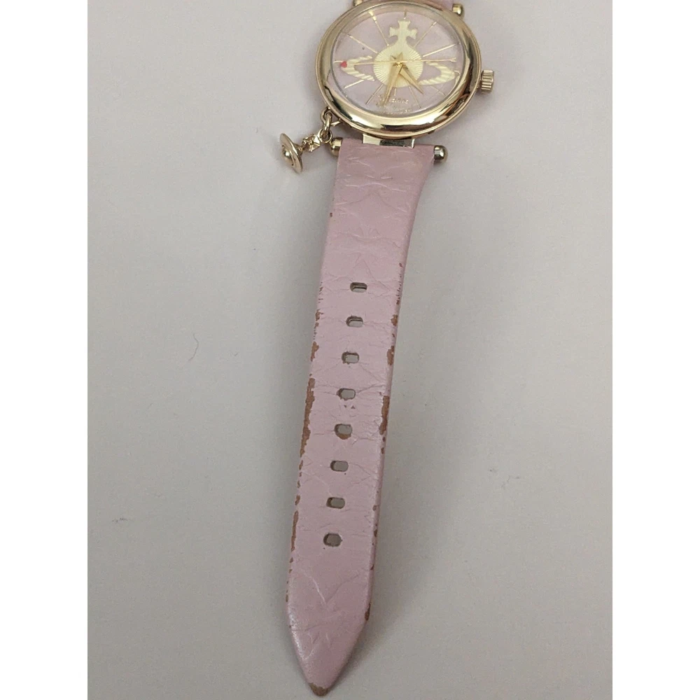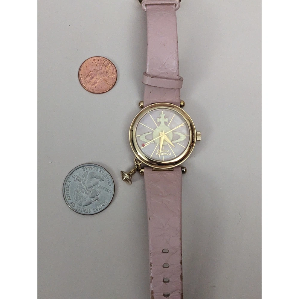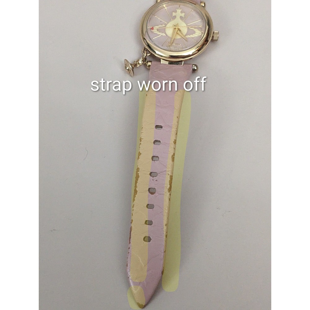 Condition: Average** The strap is worn off and parts of the pink is coming off. Length: 5.75in - 7.5in Case (does not include crown): 31mm Brand: Vivienne Westwood The battery has been replaced and the watch is ticking. The watch has not been tested for accuracy. *Bangle watches have a fixed size but can accommodate various wrists. The closer you are to the stated length, the closer the ends come together and looser it feels. *Model has 6.5in wrist. *Approximate measurements are provided & may be off by a margin. *These pieces are pre-owned, vintage, antique or estate pieces and will show signs of wear including scratches, scuffs, dirt marks. Please refer to the photos. RETURN POLICY Buyers are responsible for return shipping costs. If the item is not returned in its original condition, any loss in value will be deducted. INTERNATIONAL POLICY Shipping fees will be automatically calculated. Buyer will be responsible for additional costs including carrier charges, fees, taxes, or duties that may incur.