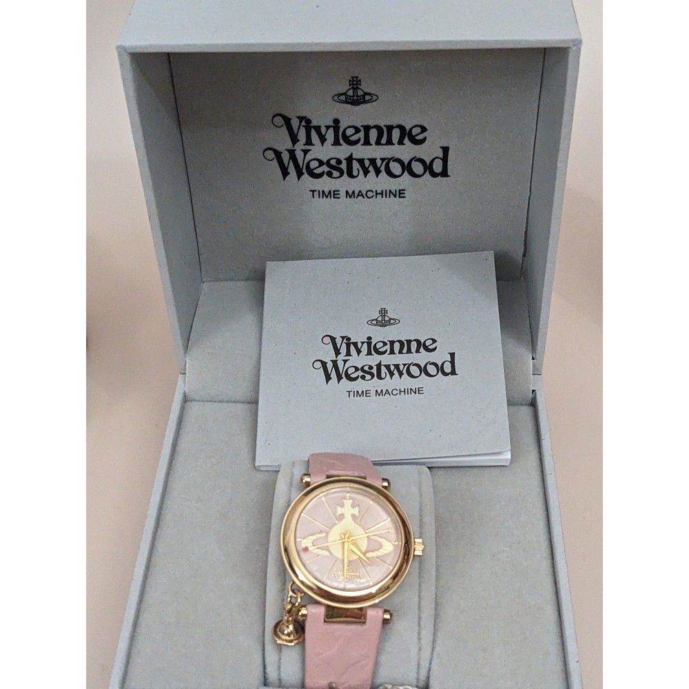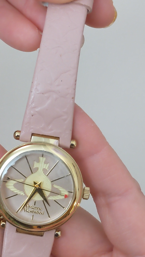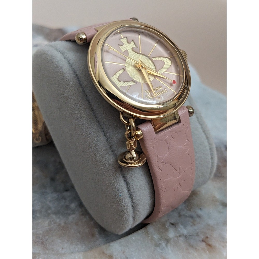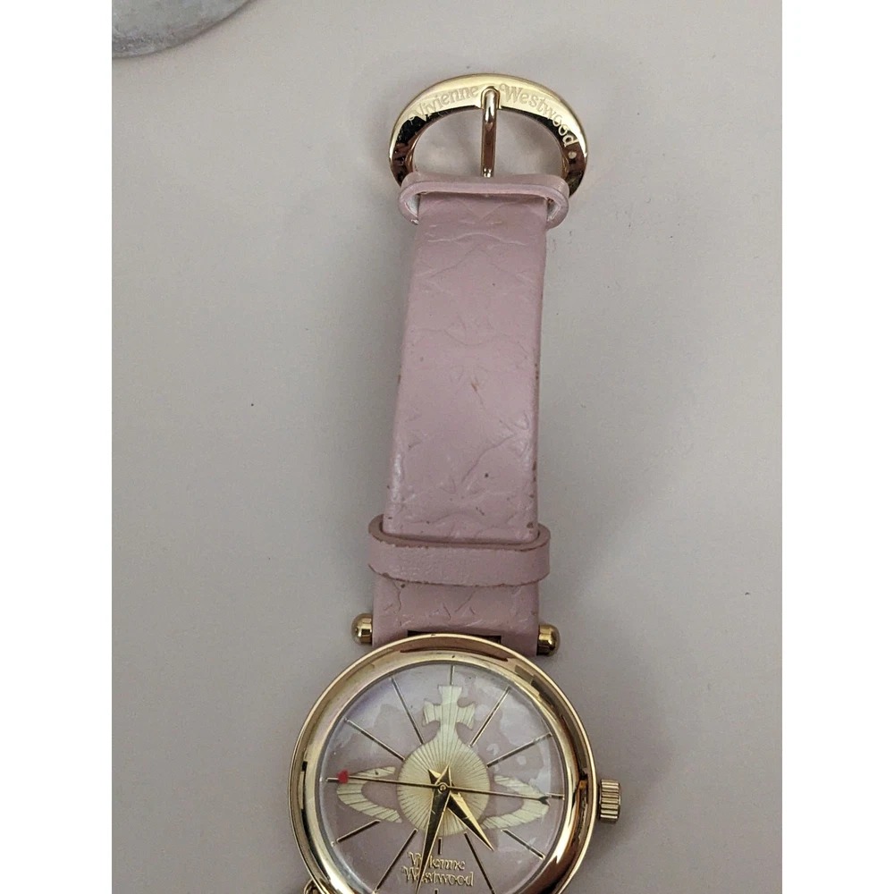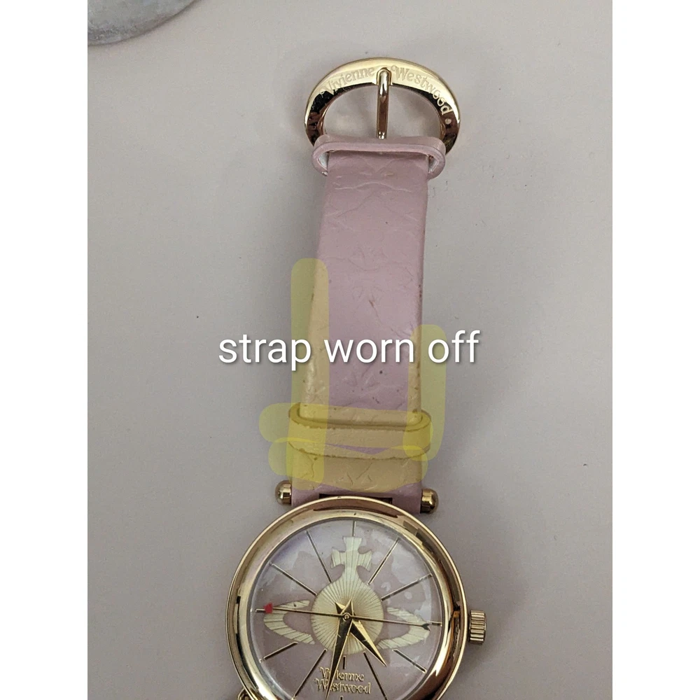 Condition: Average** The strap is worn off and parts of the pink is coming off. Length: 5.75in - 7.5in Case (does not include crown): 31mm Brand: Vivienne Westwood The battery has been replaced and the watch is ticking. The watch has not been tested for accuracy. *Bangle watches have a fixed size but can accommodate various wrists. The closer you are to the stated length, the closer the ends come together and looser it feels. *Model has 6.5in wrist. *Approximate measurements are provided & may be off by a margin. *These pieces are pre-owned, vintage, antique or estate pieces and will show signs of wear including scratches, scuffs, dirt marks. Please refer to the photos. RETURN POLICY Buyers are responsible for return shipping costs. If the item is not returned in its original condition, any loss in value will be deducted. INTERNATIONAL POLICY Shipping fees will be automatically calculated. Buyer will be responsible for additional costs including carrier charges, fees, taxes, or duties that may incur.
