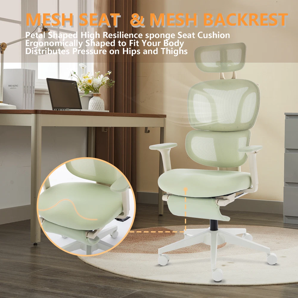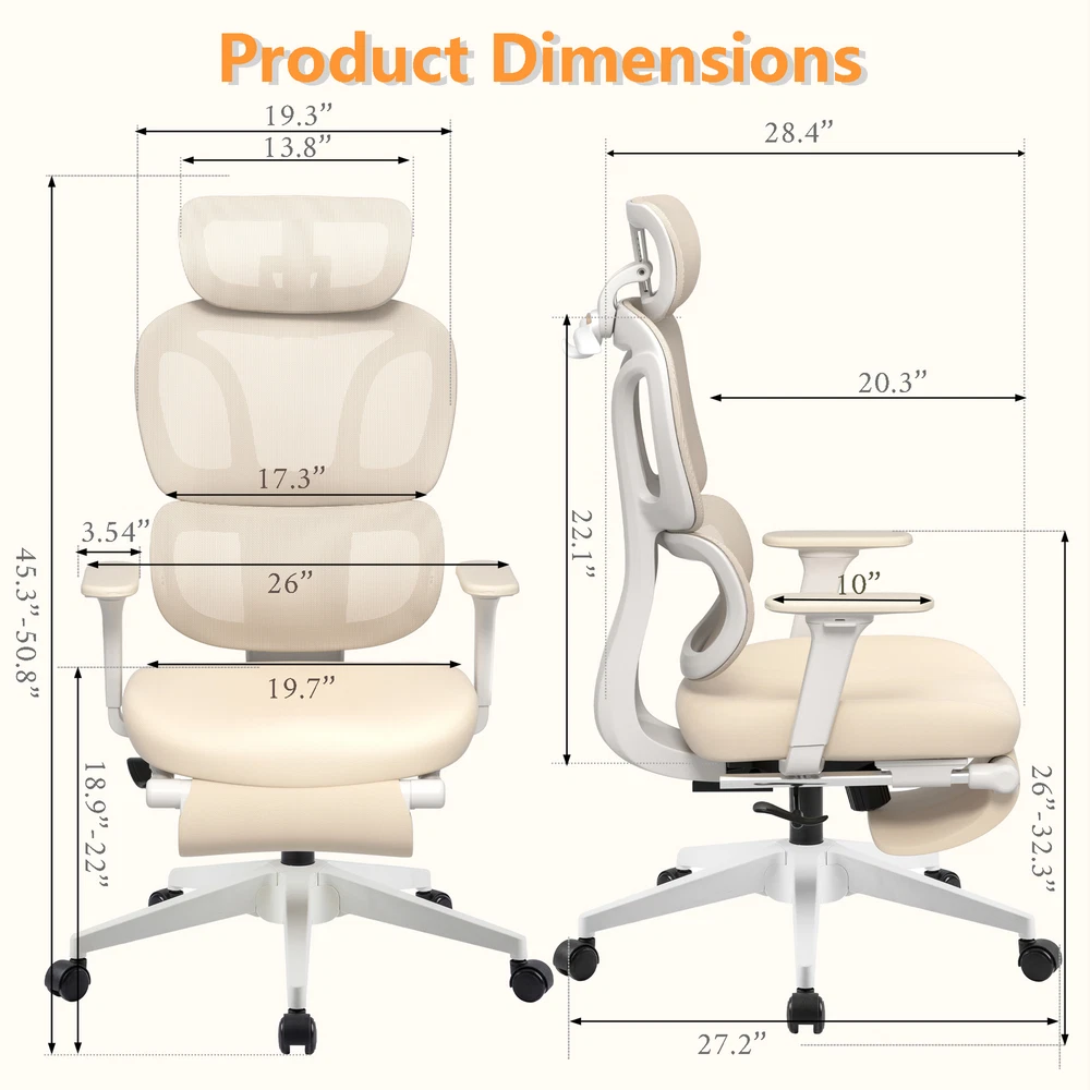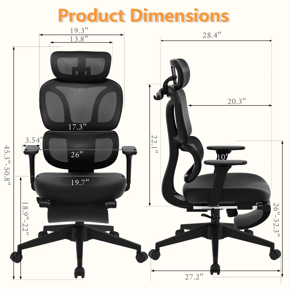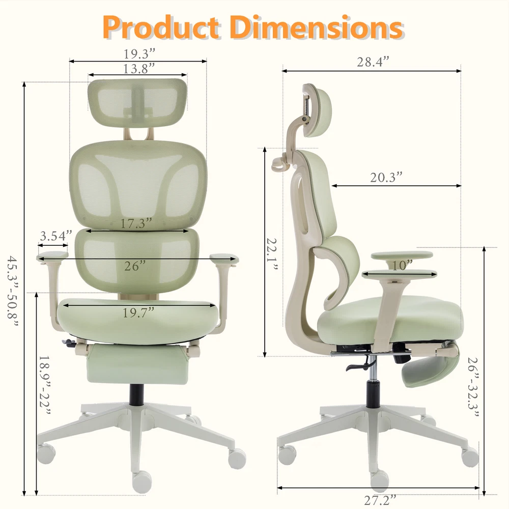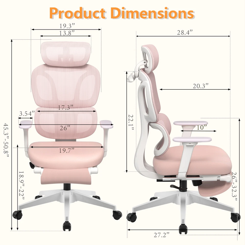 【 Customizable Comfort 】Featuring adjustable seat depth (20.8"-22"), height (20.1"-22.4"), and tilt functions to ensure a perfect fit for users between 5'1" and 6'2". 【 Enhanced Ergonomics 】 Dynamic lumbar support, 5-level adjustable back, a 3D adjustable headrest, nap footrest and tilt provide superior back and neck support for long hours. 【 3D Armrests 】Fully adjustable armrests (height, forward/back, and swivel) allow for precise positioning to reduce arm strain during extended use. 【 Breathable & Durable Design 】Choose between a mesh seat for cooling airflow or a cushioned foam seat for cradled support, with premium materials & class 4 gas lift built to last. 【 Optional Footrest 】Retractable footrest available for added relaxation—perfect for breaks or reclined seating, paired with a sleek modern design that suits any workspace. Details: Product Height: 43.7" - 52.4" Product Dimensions: 27.8" D× 27.8 " W× 52.4 "H Seat Depth: 20.8" - 22" Seat Width: 20.5" Adjustable Seat Height: 20.1" - 22.4" Weight: 38 lbs Weight Capacity: 400 lbs Features: 3D Headrest, 3D Armrests, Dynamic Height, Tilt Function, Adjustable Lumbar Support, Adjustable Seat Depth Lifting Mechanism: Gas Spring Seat Material: Mesh Frame Material: Nylon On Feb 10, 2025 at 00:38:50 PST, seller added the following information: