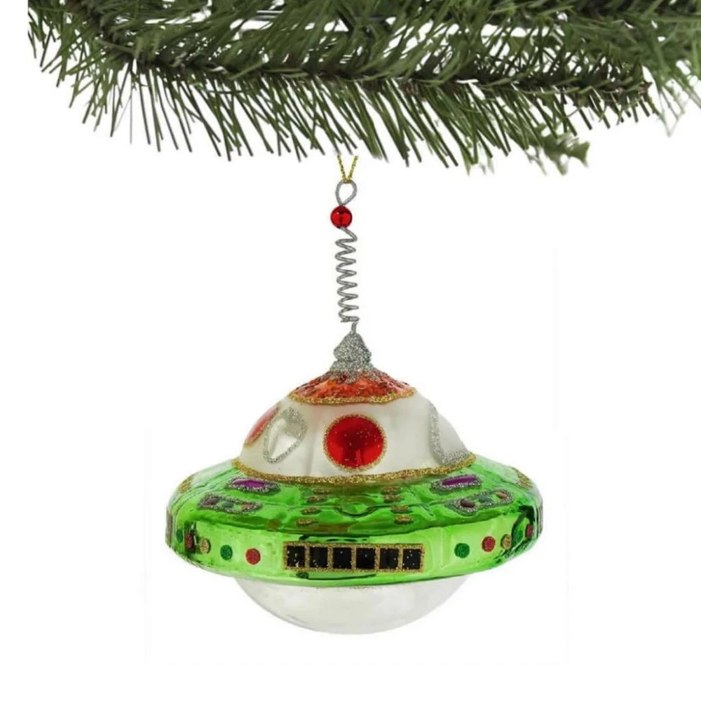 Glass Christmas Ornament Glass Christmas Ornament Description This 'retro style' blown glass ornament is sure to add a delightful touch to your tree and bring a smile to all who see it. It's ready to hang and perfect for holiday or year-round decoration! Details CONDITION: BRAND NEW DESIGN: Flying Saucer MATERIAL : Glass and Glitter SIZE : Approx. 4.5" x 4" x 4" SEE OUR ENTIRE SELECTION OF DELIGHTFUL ORNAMENTS IN THE CHRISTMAS ORNAMENT SECTION OF OUR STORE. Click images to enlarge Shipping FREE SHIPPING within the United States International Buyers International shipping charges are calculated to location in the 'Shipping and Payments' tab near the top of this page. Import duties, taxes, and charges are not included in the item price or shipping cost. These charges are the buyer's responsibility. Please check with your country's customs office to determine what these additional costs will be prior to bidding or buying. 'International First Class Mail' can take up to 6 business weeks for delivery depending on destination country, destination customs, and local or origin peak holiday shipping season. Faster 'International Priority Mail' shipping options are also available at checkout for most items. About Us The Tiny Dragon is a U.S. owned and operated 'e-retail' company. Our mission is to provide unique and affordable items of quality, promptly delivered to your complete satisfaction. Our items are shipped directly to you from our headquarters in beautiful Portland, Oregon USA. View our entire inventory at: At 'The Tiny Dragon' you are a valued customer and it is always our pleasure to serve you.