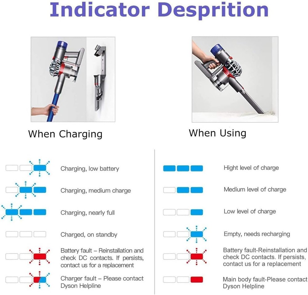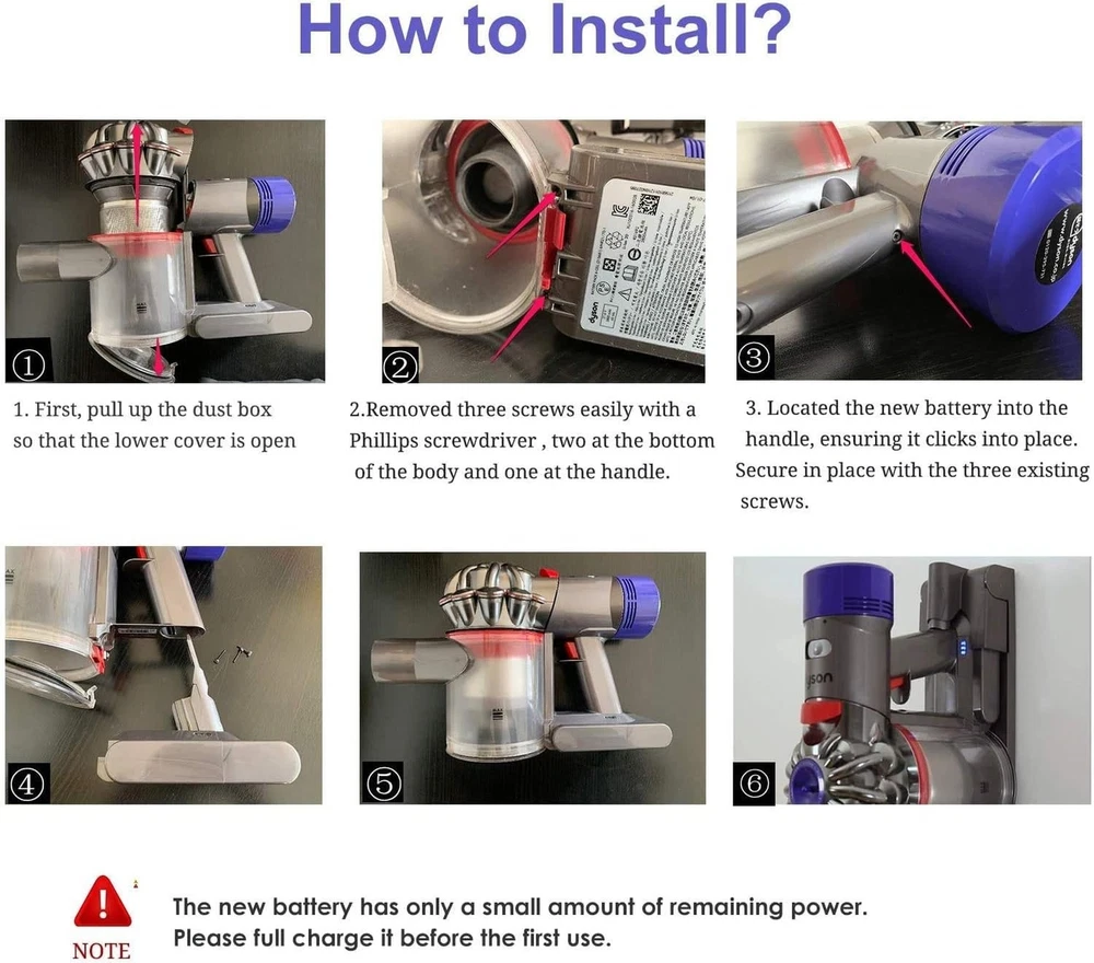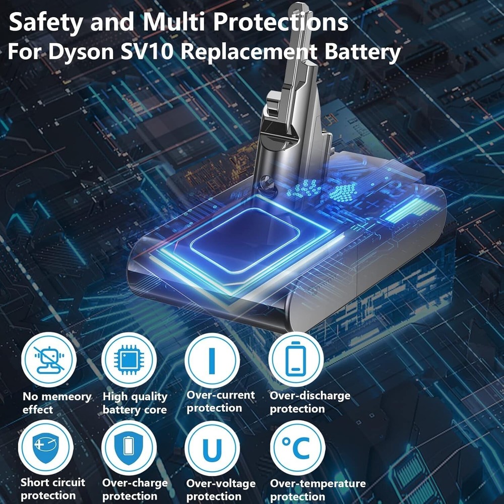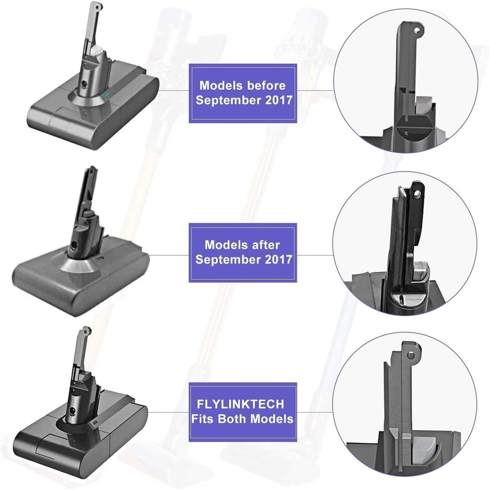 FLYLINKTECH V8 Battery 6000mAh Replacment 21.6V Li-ion Battery 215681 967834 05 for V8 SV10 Absolute Fluffy Animal Cord-Free Handheld Vacuum Cleaner with 2 Pack Filters+Cleaning Brush+Screwdriver Product Details Size: 1 Count (Pack of 1) Brand: FLYLINKTECH MPN: V8 EAN: 6941260458962 UPC: Does not apply Brand: FLYLINKTECH Filter Type: Cartridge, Foam Included Components: 2 Filters, Cleaning Brush Is Cordless?: Yes Runtime: 40 minutes Brand: FLYLINKTECH Filter Type: Cartridge, Foam Included Components: 2 Filters, Cleaning Brush Is Cordless?: Yes Runtime: 40 minutes Charging Time: 3.5 Hours Recommended Uses For Product: Vacuum Cleaner Form Factor: Handheld Color: Gray Model Name: V8 Battery Description: Lithium-Ion Amperage: 6 Amps Battery Life: 5 years Manufacturer: FLYLINKTECH Number of Items: 1 Controller Type: Push Button Portable: Yes Number of Power Levels: 2 Indoor/Outdoor Usage: Indoor Product Dimensions: 3.23 x 5.98 x 4.8 inches Item Weight: 1.01 pounds Item model number: V8 Batteries: 1 Lithium Ion batteries required. (included) Date First Available: May 12, 2021 UPGRADED 6.0Ah CAPACITY Capacity:6000mAh Battery Voltage:21.6V Watt:129.6Wh Working Time: about 40 minutes in the normal mode Battery Type: Lithium-ion Applicable models:Design for Dyson v8 battery. Same as the original function. FLYLINKTECH V8 battery is made with premium imported lithium battery cell which complys with FCC RoHS CE UN38.1 security testing standards COMPATIBLE WITH V8 VACUUM V8 Battery Replacement supports all the wall charger / stand unit. Widely application in the V8 Absolute Vacuum, V8 Animal Vacuum, V8 Fluffy Vacuum, V8 Motorhead Vacuum, V8 Hand-held Series Vacuum Cleaner, V8 SV10 967834-02 96783402 Vacuum Cleaner, V8 Animal Cordless Stick Vacuum Cleaner High-Performance Battery Packs Battery Cells 20700. Made with high-quality cells for V8 series vacuum cleaner & last 48% longer duration than originals. FLYLINKTECH Battery charge and discharge use more than 1300 times. Providing up to 30% more power and a fast charging time of 3.5 hours, 3X times faster than other batteries SMART CHARGER PROTECTION Built-in multiple circuit protection (over-charging, short-circuit, high-temperature, and over current protection) and fire-resistant construction, 1000 times tested by manufacturer to match OEM products, No Memory effect and Virtually no Self-discharge EASY 6-STEPS INSTALL V8 battery's size and function are the same as the OEM battery. Only 6 steps for installation.Steady blue means charging, flashing red means error occurred.NOTE:Don't charge immediately after the battery runs out. Let the battery cool down 10-20 minutes befor charging, especially used MAX mode and the battery is hot.No memory effect,can be charged or discharged as needed without loss of capacity