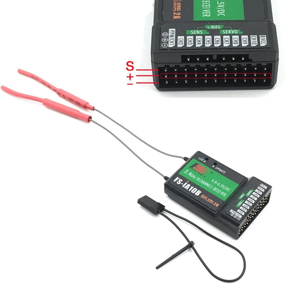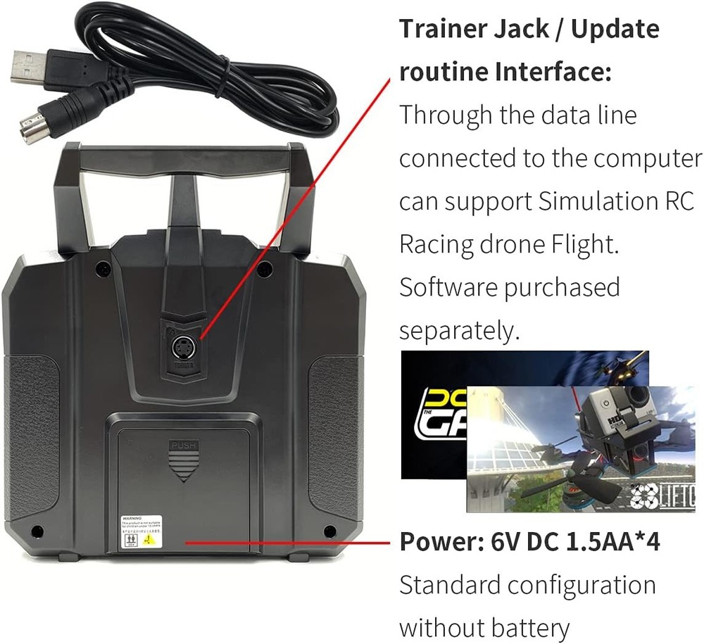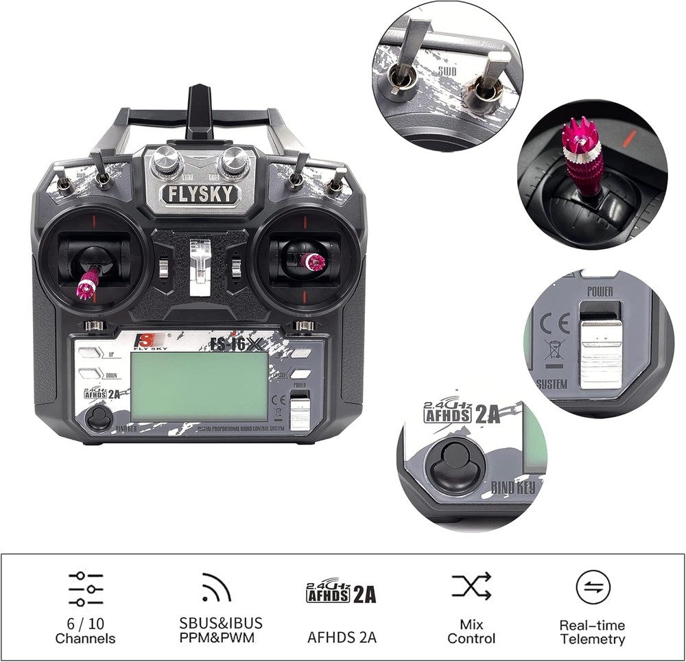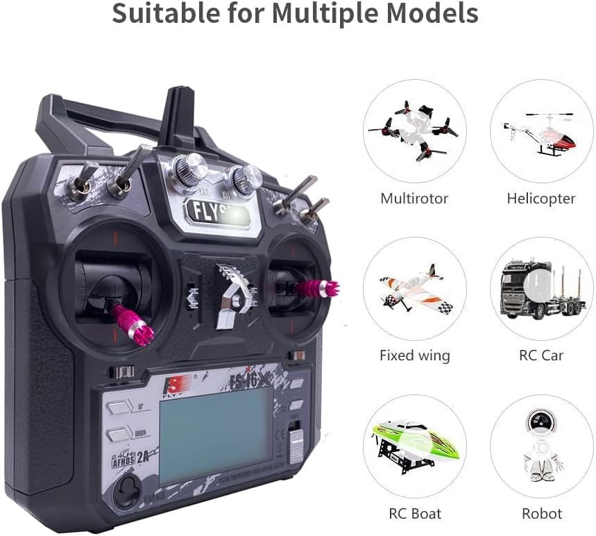 FLYSKY FS-i6X 10CH 2.4GHz RC Transmitter Controller w/FS-iA10B Receiver Upgrade Cable for RC Helicopter Plane Quadcopter Glider (Mode_2) Product Details Product Dimensions: 7.48 x 6.85 x 3.5 inches Item Weight: 1.5 pounds Item model number: FS-i6X ia10b Manufacturer recommended age: 15 years and up Batteries: 4 AA batteries required. Is Discontinued By Manufacturer: Yes Manufacturer: Shenzhen FLYSKY Technology Co.,Ltd Multi-channel Hopping Frequency --- This system bandwidth ranges from 2.408GHz to 2.475GHz. This is divided in 135 channels. Each transmitter hops between 16 channels (32 for Japanese and Korean version) in order to reduce interference from other transmitters. FLYSKY Omni-directional Gain Antenna --- The high efficiency Omni-directional high gain antenna cuts down on interference, while using less power and maintaining a strong reliable connection. Low Power Consumption --- The system is built using highly sensitive low power consumption components, maintaining high receiver sensitivity, while consuming as little as one tenth the power of a standard FM system, dramatically extending battery life. Bidirectional Communication Capable of sending and receiving data, each transmitter is capable of receiving data from temperature, altitude and many other types of sensors, servo calibration and i-BUS Support. Support practice simulator--Connected to PC via the supporting USB to PS/2 connection lead, compatible with some of St***'s FPV flight simulators [software to be purchased separately]. Note: the FLYSKY FS-I6X is (Mode 2) Left hand throttle, the throttle stick will not return to the center up and down. The FS I6X and ia10b was bind well, you don't need to bind again when you receive it.Description: Brand Name:FLYSKY Item: FS-i6X RC Transmitter Channel: 6-10 (Default 6) Model Type: Fixed-Wing/Glider/Helicopter RF Range: 2.408-2.475GHz RF Power: RF Channel: 135 Bandwidth: 500KHz 2.4GHz System: AFHDS 2A/AFDHS Modulation Type: GFSKStick Resolution 4096Low Voltage Warning: DSC port: PS/2 Port PPM Chargeable: No Antenna Length: 26mm (Dual Antenna)Weight: 392gPower: 6V DC 1.5AA*4Display: STNTransflective Display, LCD 128x64 Lattice, VA 73x39mm, LCD with white backlight Size: 174x89x190mmOn-line Update: Yes Color: Black Certificate: CE0678, FCC ID: N4ZFLYSKYI6XModel: model 2(left hand throttle)FS-iA10B Specifications: Item: FS-iA10B Receiver Channels: 10 Model Type: Fixed-Wing/Glider/Helicopter RF Range: 2.4055-2.475GHz RF Channel: 140 RF Receiver Sensitivity: -105dBm Bandwidth: 500KHz 2.4GHz System: AFHDS 2A Modulation Type: GFSKPower: 4.0-6.5V DC Antenna Length: 26mm (Dual Antenna) Weight: 17.6g Size: 50.6*34.9*14.9mm i-BUS Port: Yes Data Acquisition Port: YesCertificate: CE0678,FCCPackage Included:1X FS-i6X Transmitter 1X FS-iA10B Receiver1X Bind plug 1X Upgrade CableNo included the batteryHow to setup 10 Channels? I6X open 10 channel method Long press the OK button for 2 seconds to enter the menu setting Select System setup to enter, Press down to the last item Aux SWitches auxiliary switch setting to enter, SwA B C D is set to select On to turn on Ch6, changed to Ch10 Long press the CANCH key to automatically save and exit