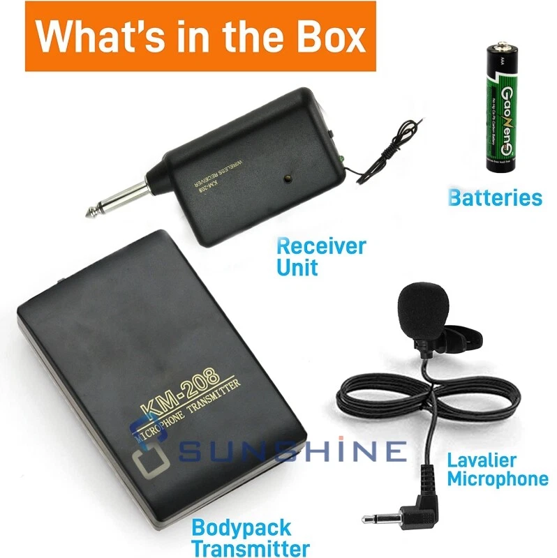 Wireless Microphone Transmitter Lavalier Lapel Clip Mic Receiver Headset System Specifications: Modulation: FM Frequency response: 80-12500Hz Effective distance: 20m Output impedance: 600 ohm Transmitter Power: 1 x 6F22 9V battery (Not Included) Receiver power: 1 x AAA 1.5 battery (Included) Transmitter size: 95mm x 60mm x 20mm Receiver size: 72mm x 44mm x 14mm Microphone cable: about 950mm Color: Black Package includes: 1 x Microphone Transmitter 1 x Wireless Receiver 1 x Clip-on Microphone 1 x Protective sleeve (for Clip-on Microphone) 1 x User instruction 1 x AAA Battery (Included) Payments Delivery details Return and exchange Feedback & Rating Contact us Payments Payments: Paypal, Google Pay, Visa, Master Card, Amerian Express, Discover. Delivery details All items are shipped from US warehouse located at NJ . We ship to your eBay or Paypal address. Please make sure your eBay or Paypal address is correct before you pay. Return and exchange Free return Feedback & Rating Pls contact our customer service firstly if have any problems , we will help to solve the issue, and could offer free return service for full refund or free replacement after confirming. You can buy from us with confidence Contact us If have any problems, please feel free to contact us.