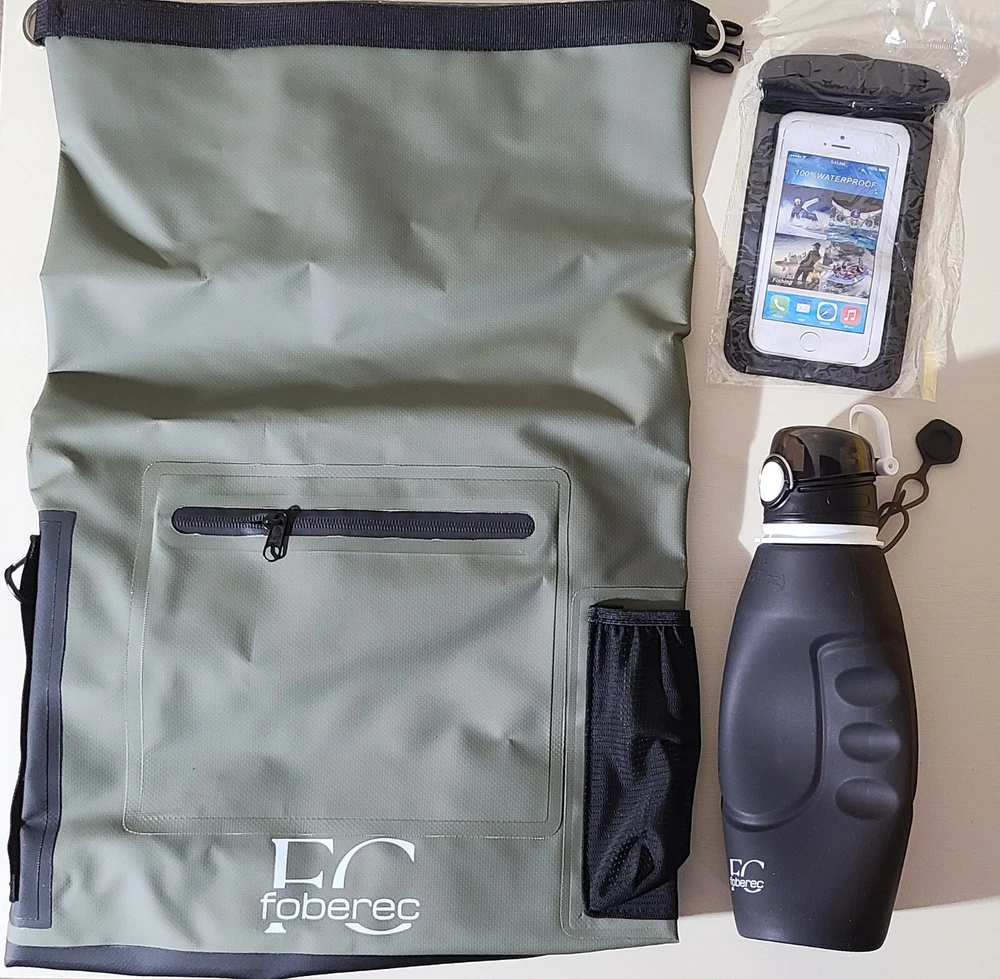FOBEREC Camping Essentials Gear Waterproof Dry Bag 30L w/Water Bottle Phone Case - Open Box - Unused, Brand New!!! 30L PVC-material Green & Black Waterproof Dry Bag comes with a Collapsible Silicone Water Bottle & Waterproof Phone Case. ** Item sold as is. All of our items come from a smoke-free home. We do not accept returns. **