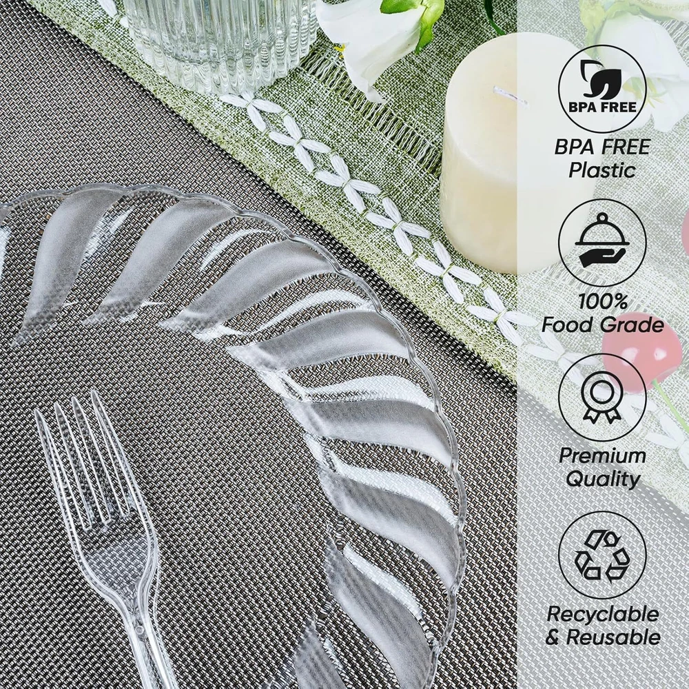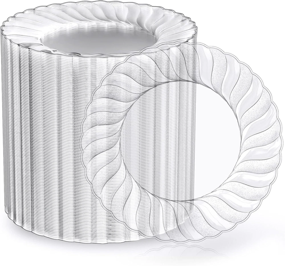 Health & Quality: Clear plastic plates are safe for you and your guests! Disposable plates are made of heavy duty 100% food-grade plastic, BPA-free. They are all very durable and won't scratch or break easily. Elegant & Stylish: These small 6 inch clear dessert plates have a slight depth and feature beautiful and elegantly designed curved edges. The crystal clear construction is designed to better showcase a variety of colorful dishes such as appetizers, cakes and gourmet salads. Convenient & Reusable: The clear plastic plates are disposable design, you can throw these disposable clear plates directly after the party, no need to clean up. Of course, if you want to keep using it, you can hand wash and line dry, ready for your next party. Ideal for Weddings, Birthday Parties, Graduations, Anniversaries, Catered Events, and All Occasions! Preferred party supplies for Halloween, Thanksgiving, Christmas and other festivals. Great Value Pack: 100 pack 6 inch clear hard plastic plates to meet your party needs!