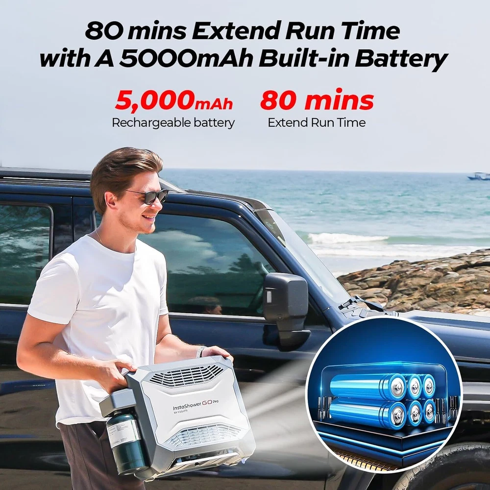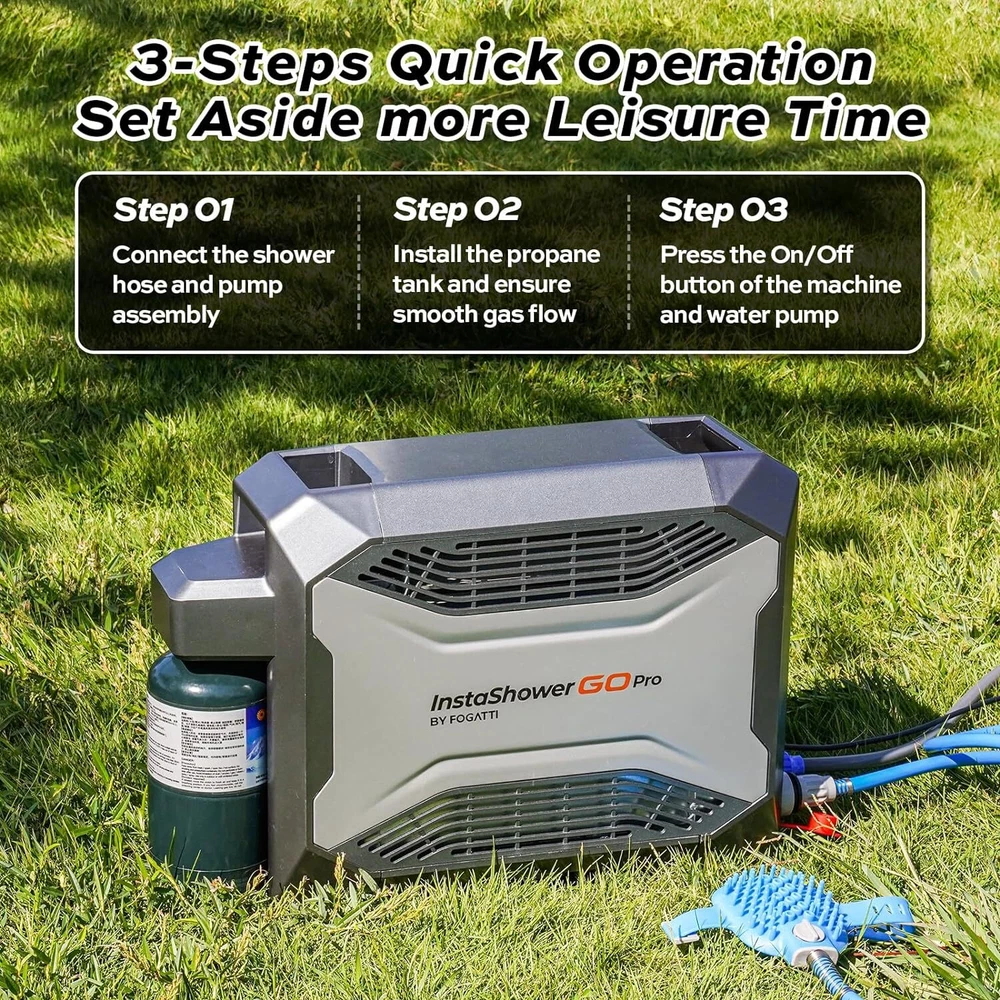 Specification Series: InstaShower GO Pro BTU: 22000 Battery: Rechargable (5000mAh ) Run Time (Full Charge): 80 Mins Charging Time: 4 Hours Wattage: 6.5 KW Maximum Flow Rate: 3.5 Liters Per Minute Voltage: 12 Volts (DC) Gas Supply Pressure: 11" W.C. (2.74kPa) High Temperature Control: 125 ℉ Ignition: Electric Ignition Product Dimensions: 18.2" X 6.5" X 13.5" Fuel Source: Propane Gas Connector Size: 1"-20UNEF Water Pump: 2 meters long, 30W, 8L/min Showerhead: 3 spray patterns Special Features: Portable, Digital Display, Lightweight, Overheat Protection, Tip-Over Protection Accessories: Water pump, showerhead, shower hose, magnetic base shower hook, 12V cigarette lighter power line, battery charger(120 VAC/60 Hz), Propane adapter hose, Pet shower sprayer About this item 【 Portable Shower System 】FOGATTI InstaShower GO Pro is a compact and portable shower system designed for outdoor use. Heated by propane, it provides hot water in seconds for showering, washing dishes, cleaning hands, and other tasks. It is lightweight and easy to store, making it an ideal companion for camping, hiking, and other outdoor adventures. 【 Easy Access to Hot Water 】With a heating output of 22,000 BTU, the InstaShower GO Pro Water Heater heats up fast within 8 seconds, and it can output 3.5 liters of hot water per minute. Set the temperature you need with the knob. The maximum temperature rise is 125°F. Innovative technology turns off the gas burner when water reaches 125°F to keep adults, kids, and pets safe from accidental scalds and burns. 【 Enjoy Showers Anytime, Anywhere 】The FOGATTI InstaShower GO Pro Portable Water Heater comes with a built-in 5000 mAh rechargeable battery, which eliminates the need for external power sources and can operate for 80 minutes on a full charge. This allows you to enjoy refreshing showers even at off-grid locations. It can also be charged by a 12V car cigarette lighter or a portable power station if you forget to recharge it, ensuring usability anywhere. *Please charge the battery for 4 hours at the first time to maximinize the performance of the battery. 【 All-in-one Solution 】The efficient brushless 12V pump with a 6.6 ft hose ensures reliable and consistent water pressure, delivering an enjoyable shower experience. Furthermore, the shower unit features an automatic ignition system for easy start-up and shut-down, allowing you to pause your shower without constantly turning the machine on and off, saving water and energy. The adjustable shower head with 3 spray pattern settings enables you to control the water flow according to your preference. A built-in gas regulator offers the flexibility to use either gas cartridges or gas cylinders via a hose (included). 【 Multi-Protections for Added Safety 】Besides overheat protection and flameout protection, the InstaShower GO Pro water heater is also equipped with tilt protection and dry burn protection. The flame will shut off if the tilt angle is too large or if it detects insufficient water flow. For added safety, the InstaShower GO Pro is constructed with flame-retardant materials, minimizing the risk of fire hazards. 【 Caution 】Exclusive for outdoor use. Not intended for residential or recreational vehicle purposes.