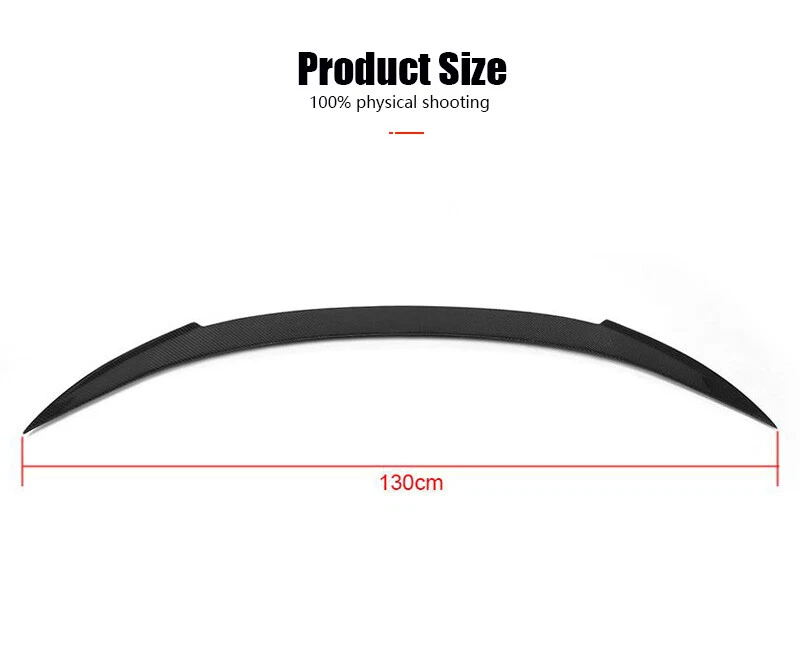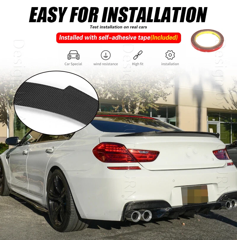 Fitment: Fit for BMW 6 Series F06 F13 640I 650I M6 Gran Coupe 4-Door 2013 2014 2015 2016 2017 2018 2019, not for F12 Convertible Models Specifications: Product Name: Rear Spoiler Material: Carbon Fiber Size:Length:130cm Package Size: 138*39*11cm Package Weight: 2.1kg Features: Made of High Quality Lightweight Carbon Fiber. Latest Design GT Wing Spoiler Completed Kit, Improve Handling And Make Tail More Stable in High Speed. Water Transfer Carbon Fiber for Highest Durability and Appearances. Adjustable Angles for Customizable Usages and Efficiencies, Enhances Aerodynamic. Reduces Drag, Increases Fuel Efficiency, Reinforces Downforce, Traction and Stability. Double-sided adhesive paste, Easy to Install. Package included: 1 x Spoiler with self-adhesive glue tape Carbon Fiber Spoiler The Rear Trunk Spoiler is one of the simplest mods you can do to the exterior of your car that will give your car that completely different look. Not only are spoilers meant for great looks, they also help with the aero dynamics of the car by lowering drag, or helping to put more downforce on the car making sure that the wheels stay grounded for maximum traction. Fitment: Fit for BMW 6 Series F06 F13 640I 650I M6 Gran Coupe 4-Door 2013 2014 2015 2016 2017 2018 2019, not for F12 Convertible Models Specifications: Product Name: Rear Spoiler Material: Carbon Fiber Size:Length:130cm Package Size: 138*39*11cm Package Weight: 2.1kg Features: Made of High Quality Lightweight Carbon Fiber. Latest Design GT Wing Spoiler Completed Kit, Improve Handling And Make Tail More Stable in High Speed. Water Transfer Carbon Fiber for Highest Durability and Appearances. Adjustable Angles for Customizable Usages and Efficiencies, Enhances Aerodynamic. Reduces Drag, Increases Fuel Efficiency, Reinforces Downforce, Traction and Stability. Double-sided adhesive paste, Easy to Install. Package included: 1 x Spoiler with self-adhesive glue tape Delivery details Payment and TAX Warranty Policy Return Policy Contact us Delivery details NOTE: The shipping fee is only for the mainland of each country, it does not include the overseas territories, such as Virgin Islands (U.S.) , Puerto Rico, Hawaii , French Reunion Island, etc. But on ebay, when buyers from Puerto Rico and overseas territories , the shipping fee is equal to United States, it is NOT correct,. please contact us for correct shipping fee, or we will cancel the order. Sorry for the inconvenience, and thanks for your cooperation. 1. If you want to upgrade the shipping, please contact us before making payment, we will revise the shipping fee. 2. We will ship according to your Ebay address. Please make sure it is correct and include phone number for delivery. If you want to know the exact shipping time , please contact us . Payment and TAX 1.We accept Multiple Payment Methods Available: Credit Card, Debit Card, Gift Card, Apple Pay, Goggle Pay, PayPal and PayPal Cred. 2.Please leave note for your special request (e.g. Colors or Size) in ebay note when you pay the order. 3.Your must complete the payment within 7 days or Ebay will automatically open unpaid item case For US Buyer:The invoice value of each item is less than 800USD ,so you no need to pay any tariff . NON-US Buyer Note: Most countries are tax free based on our invoices, if tax is required, which will be buyer's responsibility. Warranty Policy We Warranty Our Product Within the Limited Warranty Policy Specified on Ebay. Please Email us if ou have any question regarding the warranty policy on a specific item. Most of the items are Aftermarket Parts and they are intended for off-road usage only, therefore no installation instruction will be included, Professional installation are Highly Recommended. We are not responsible for any damages to the item or the vehicle that occur during the installation of the item.Also, Please Make Sure Proper Installation is Performed as we are not responsible for item being missing or flew off after the installation. if you don't think the item can stay on the car properly, please do not attempt to drive the car with it and please check with professional shops/mechanics or contact us for assistance. Return Policy We Accept Returns Within the Return Period On Ebay. Return Authorization/Return Approval is Required For Every Return. So If you Wish to Make a Return On Your Purchase. Please Contact us Before You Send The item back For any damages occured to the item upon arrival, Please notify us within 5 days of the delivery so we can take proper action to fix the issue. So Please Kindly inspect and check the item condition upon arrival.For Any other Return Inquries, You can contact us within the return period to obtain return authorization/return approval. In case of return, the merchandise needs to be returned in original condition with origi- nal packaging in order to be eligible for an exchange or a refund. Items must be not opened in their original package. Any mark of installation, mounting, cutting, scratch or using will not be allowed. Contact us 1.We are trying our best to explain all details of the products here! If you have any question, please feel free to contact us by Ebay message, and We will get back to you within 24-48 hours. 2.Customer satisfaction is our NO.1 priority. If you are not happy with the item that you purchase, please contact us first. We will try our best to solve the problem with you.Please leave us a positive feedback if you receive the item.Please do not leave negative or neutral feedback without any contact.If you haven't received item in 30 days, please contact us and we will arrange refund.We appreciate your business.Happy Bidding & Have a nice day! 3.Working hours: From 8 a.m. to 6 p.m. from Monday to Friday. From 8 a.m. to 12 a.m. on Saturday morning Holiday/Rest time: Saturday afternoon and Sunday