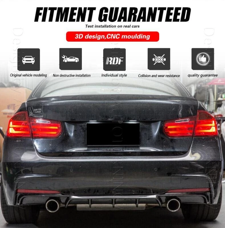 Fitment: Fit for BMW 3 Series F30 318i 320i 328i 330i 335i 340i M Sport Sedan 4 Door 2012-2018,Not for BMW F30 Base Models Specifications: Product Name: Rear Bumper Lip Material: Carbon Fiber Package Size: 143*30*15cm Package Weight:2.6kg Features: • Made of High Quality Lightweight Carbon Fiber. • Improve the aerodynamic characteristics by enhancing the transition between the high-speed airflow below the vehicle and the free airflow in the surrounding atmosphere. • Provide space for the airflow under the vehicle to decelerate and expand, thereby providing pressure recovery by providing a degree of "wake fill" or more accurately. • Does not cause excessive airflow separation and resistance and keep driving safety. Carbon Fiber Rear Bumper Lip The Rear Bumper Lip is one of the simplest mods you can do to the exterior of your car that will give your car that completely different look. Not only are spoilers meant for great looks, they also help Prevent the rear of the car from scratching. Fitment: Fit for BMW 3 Series F30 318i 320i 328i 330i 335i 340i M Sport Sedan 4 Door 2012-2018, Not for BMW F30 Base Models Specifications: Product Name: Rear Bumper Lip Material: Carbon Fiber Package Size: 143*30*15cm Package Weight:2.6kg Features: • Made of High Quality Lightweight Carbon Fiber. • Improve the aerodynamic characteristics by enhancing the transition between the high-speed airflow below the vehicle and the free airflow in the surrounding atmosphere. • Provide space for the airflow under the vehicle to decelerate and expand, thereby providing pressure recovery by providing a degree of "wake fill" or more accurately. • Does not cause excessive airflow separation and resistance and keep driving safety. • Sport style rear diffuser, perfect for decoration, increase both road safety and racing style. Package included: • Car Rear Lip Bumper Body Kits • Mounting Accessories Delivery details Payment and TAX Return Policy Warranty Contact us Delivery details NOTE: The shipping fee is only for the mainland of each country, it does not include the overseas territories, such as Virgin Islands (U.S.) , Puerto Rico, Hawaii , French Reunion Island, etc. But on ebay, when buyers from Puerto Rico and overseas territories , the shipping fee is equal to United States, it is NOT correct,. please contact us for correct shipping fee, or we will cancel the order. Sorry for the inconvenience, and thanks for your cooperation. 2. If you want to upgrade the shipping, please contact us before making payment, we will revise the shipping fee. 3. We will ship according to your Ebay address. Please make sure it is correct and include phone number for delivery. If you want to know the exact shipping time , please contact us . Payment and TAX 1.We accept Multiple Payment Methods Available: Credit Card, Debit Card, Gift Card, Apple Pay, Goggle Pay, PayPal and PayPal Cred. 2.Please leave note for your special request (e.g. Colors or Size) in ebay note when you pay the order. 3.Your must complete the payment within 7 days or Ebay will automatically open unpaid item case For US Buyer:The invoice value of each item is less than 800USD ,so you no need to pay any tariff . NON-US Buyer Note: Most countries are tax free based on our invoices, if tax is required, which will be buyer's responsibility. Return Policy 1.Customer satisfaction is our top goal. We believe our items are so outstanding. All products are quality checked. They are new and in good condition when shipped to our customers. We are convinced you will be happy with your Purchase. 2.If product is defective or damage upon arrival, or wrong product shipped, please contact us immediately. Returns accepted within 30 days of delivery date and item must be in original new condition, not worn or altered in any way with attached tags & wrap. Otherwise deal is final. Return shipping must be paid by buyer. Please always contact us to resolve any problems, we will do our best to satisfy you. Thanks very much. Warranty 30 Days Money Back It is our goal to provide 100% satisfaction and peace of mind to our customers. If you are not satisfied with the products for any reason within 30 days of receiving the item. (Items must be not opened in their original package. Any mark of installation, mounting, cutting, scratch or using will not be allowed.) Please be free to contact us first if you have any problems.thanks. Contact us 1.We are trying our best to explain all details of the products here! If you have any question, please feel free to contact us by Ebay message, and We will get back to you within 24-48 hours. 2.Customer satisfaction is our NO.1 priority. If you are not happy with the item that you purchase, please contact us first. We will try our best to solve the problem with you.Please leave us a positive feedback if you receive the item.Please do not leave negative or neutral feedback without any contact.If you haven't received item in 30 days, please contact us and we will arrange refund.We appreciate your business.Happy Bidding & Have a nice day! 3.Working hours: From 8 a.m. to 6 p.m. from Monday to Friday. From 8 a.m. to 12 a.m. on Saturday morning Holiday/Rest time: Saturday afternoon and Sunday eBay Cross Border Trade powered by ChannelEffect