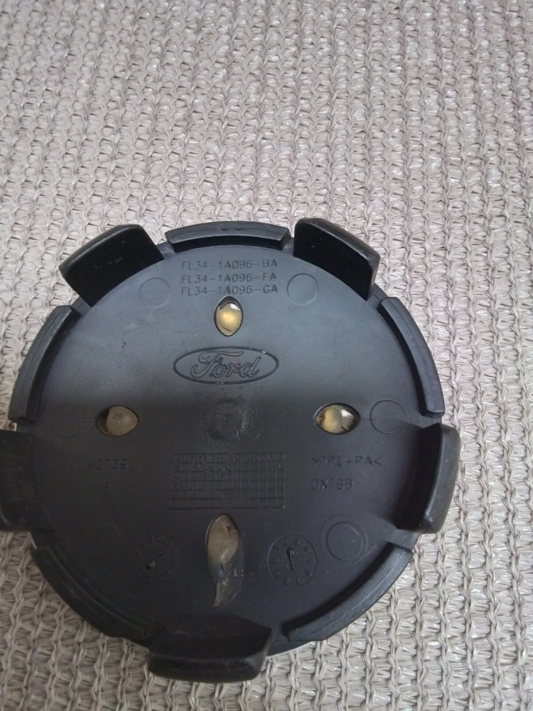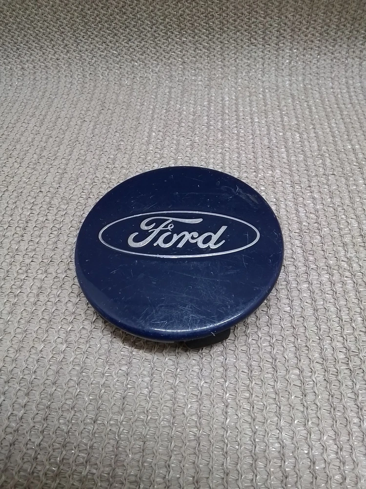 This is a Ford Expedition / F-150 OEM alloy wheel center cap in dark blue with silver letters. Made of plastic, this glossy finish cap features the Ford emblem and measures approximately 3 inches in outside diameter. It is designed for easy installation without the need for tools, car wash safe, and suitable for placement on the rear, left, front, or right side of the vehicle. The manufacturer part numbers include FL34-1A096-BA, FL34-1A096-GA, and FL34-1A096-FA, with interchange part number 560-3995 and OE/OEM part number FL3Z-1130-B.
