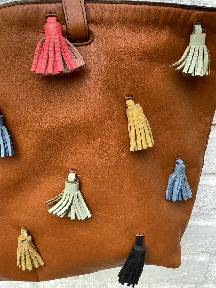 FOSSIL Leather Tote Bag Purse Brown Multi Colored Tassels EUC RARE! Very Nice!