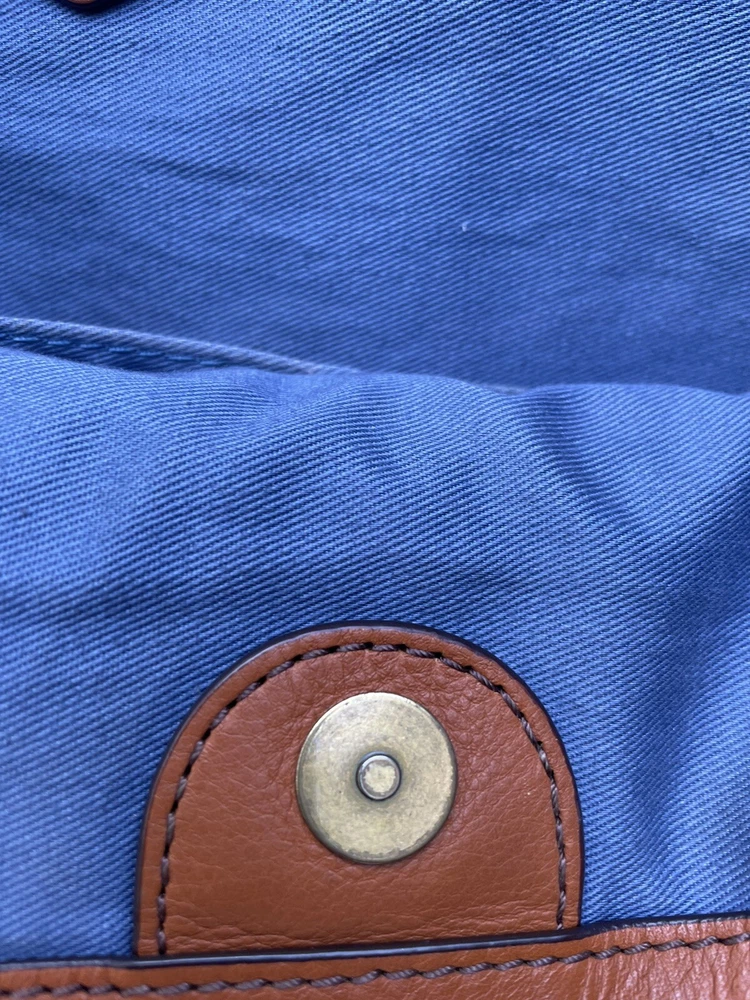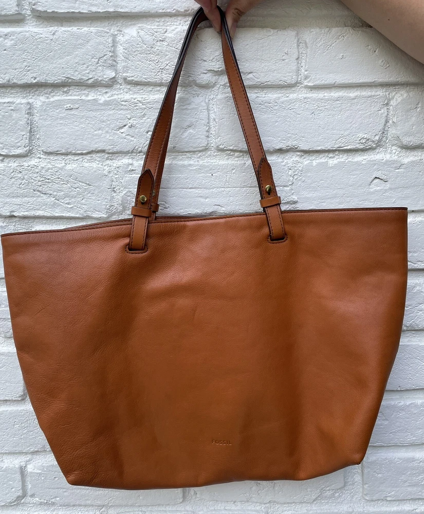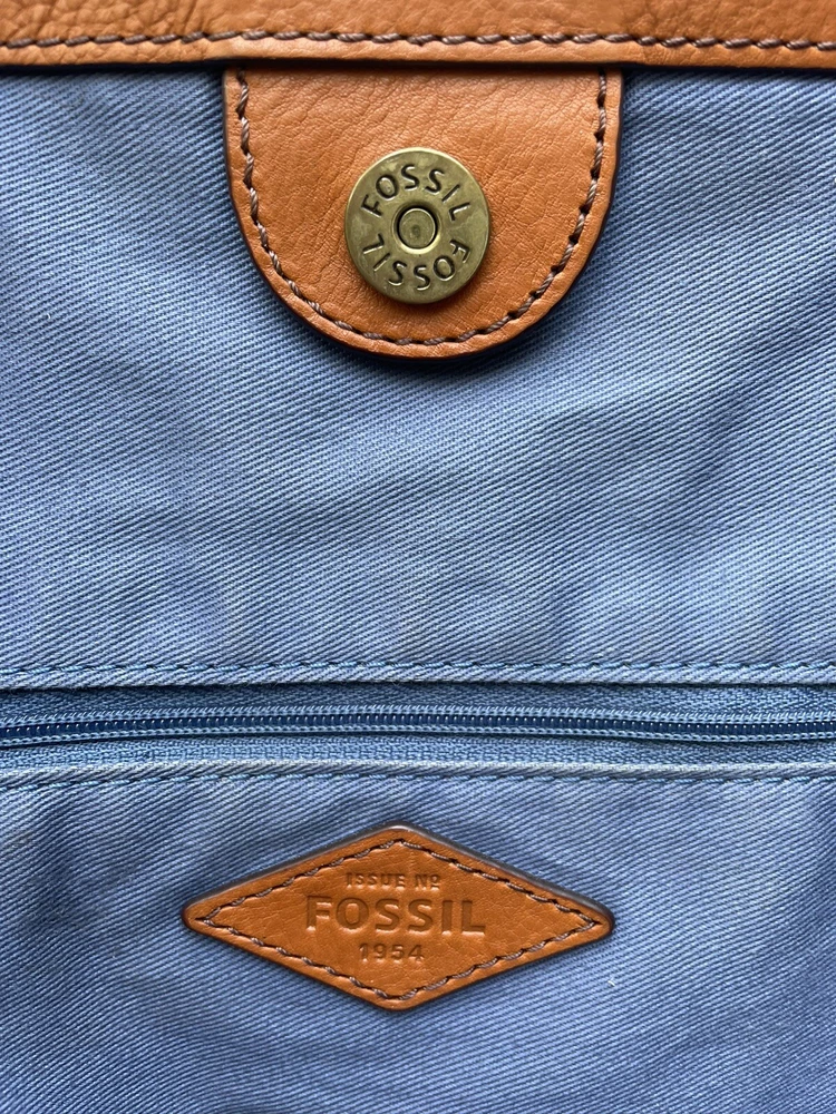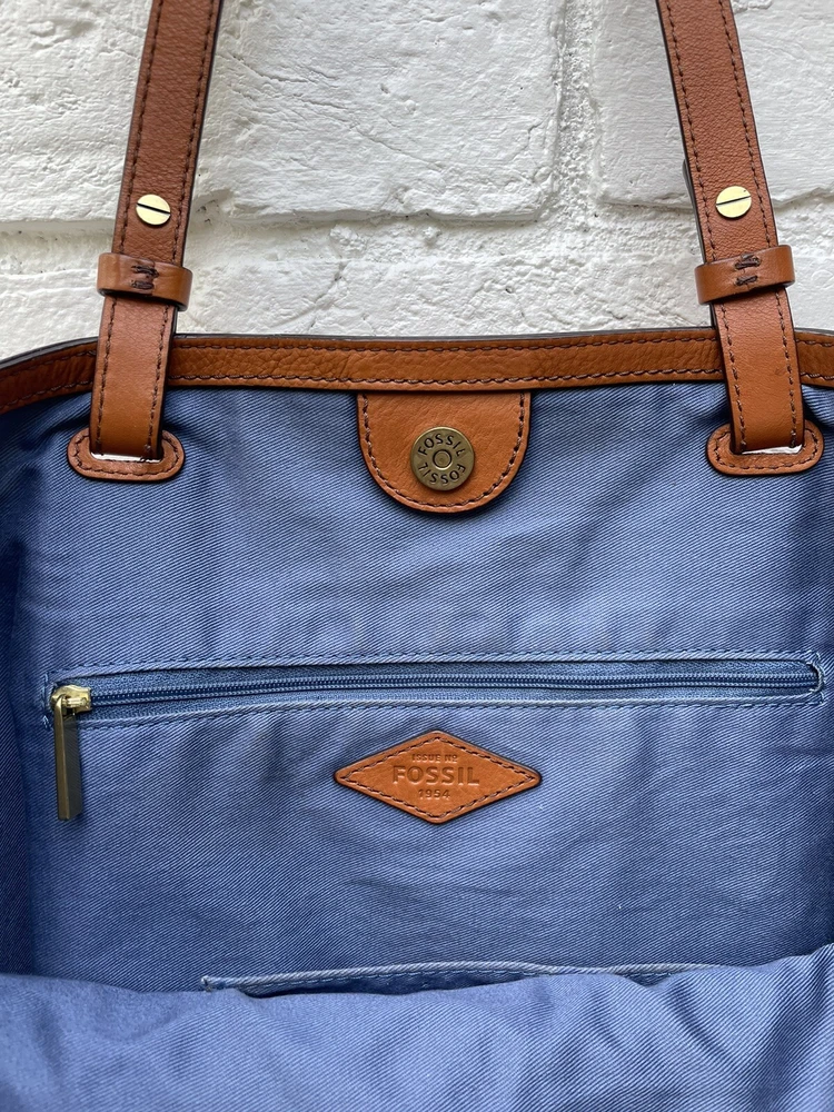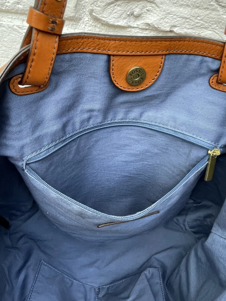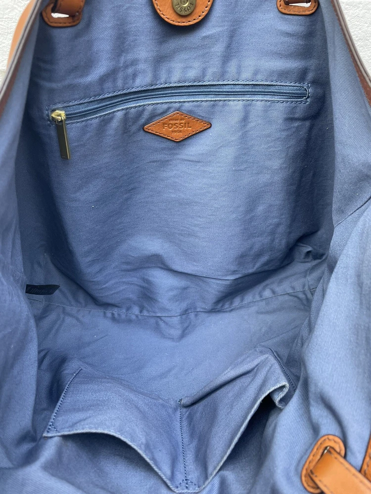 Handle/Strap Material: Leather Bag Depth: 4.5 Hardware Color: brass Handle Style: Double Handles Handmade: No Closure: Magnetic Personalize: No Theme: Art, Classic, Colorful, Hippie, Hipster, Preppy, Retro, Rock, Western Brand: Fossil Style: Tote Exterior Material: Leather Handle/Strap Color: Brown Bag Height: 10 in Exterior Color: Brown Caramel Size: Large Accents: Tassel Lining Color: Blue Occasion: Business, Casual, Party/Cocktail, Travel Handle Drop: 9" Hardware Material: Brass Features: Inner Pockets, Lined, Pockets Department: Women Bag Width: 17 in