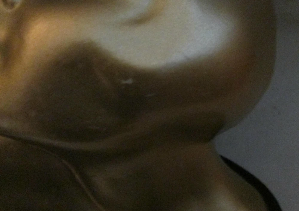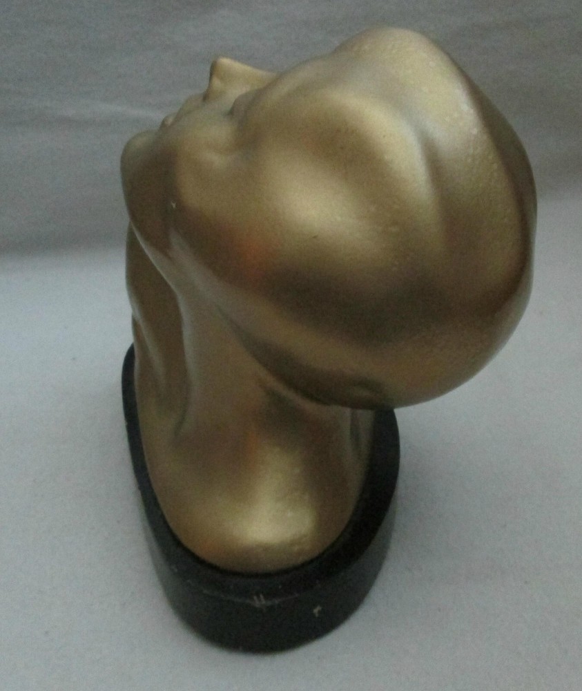 Art Deco era metal, with a gold exterior, bust, woman looking upward, 5 1/2" high and about 6 1/4" wide. The base is wood, painted black. Green felt on the base. Another eBay listing said that this is a piece made by Frankart but there are no markings on the bust. I didn't removed the base to check for a signature there. The exterior finish is in good condition for the age, probably the 1920's. One tiny spot, shows the metal below the exterior. See the last digital. The wood base has some paint loss. Those can be seen in the photos. One area of the base, on the back, shows that the wood has splintered. See photo ten. Since it is wood, and painted, it could be easily restored. Please view all of the digitals and use magnification, as needed, so that you are comfortable with the condition of the item before bidding. The photos are an important part of the item's description. Expedited Shipping. Shipping costs are based on the distance from Arizona to your home address. No international shipping. Shipping only to your confirmed eBay shipping address. USPS prices the cost of shipping. I provide the weight and size of the box. No local pick up. Thanks.