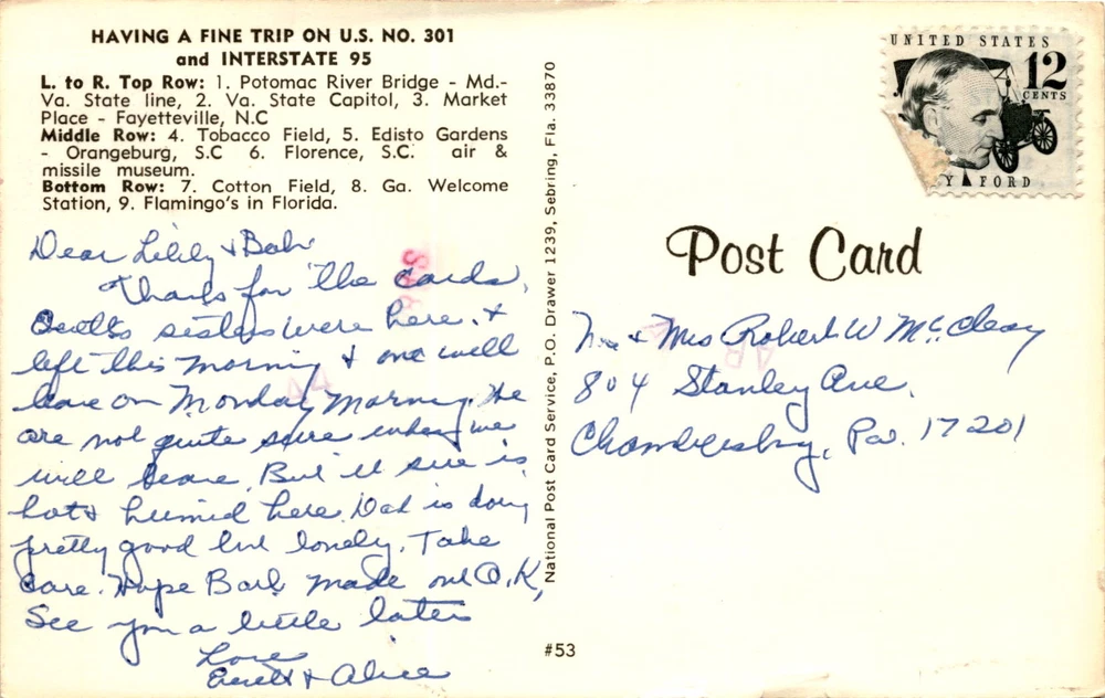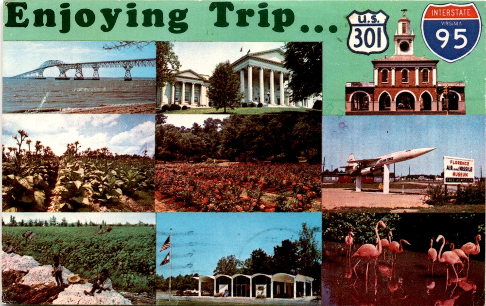 MAKE AN OFFER. THE MORE YOU BUY THE BETTER DEAL I WILL ACCEPT The postcard showcases various attractions and landmarks along U.S. Route 301 and Interstate 95 in Virginia and other states. It mentions the Florence Air and Missile Museum, offering free admission.