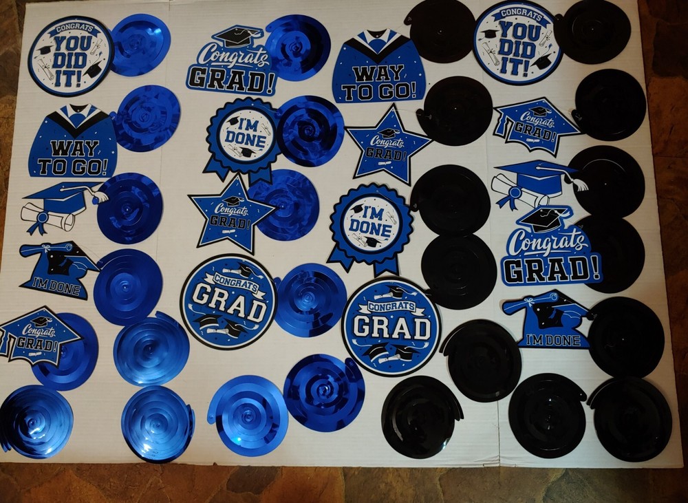 Blue Graduation All Party Paper goods Any Year Serves 50 & Extras Total 277 New New in Package BONUS: FREE shipping in the US despite the high cost of shipping This listing includes: 1 Pkg of 50 dinner plates measuring 8 1/2" in diameter 1 Pkg of 50 desert plate measuring 7" in diameter 1 Pkg of 50 small square beverage napkins 5" x 5" 1 Pkg of 50 large square luncheon napkins 6 1/2" x 6 1/2" 2 Pkg of 25 cups totaling 50 cups measuring 4 1/2" high and 3" across top diameter Sub-Total 250 pieces 26 Congratulations Paper bags with handles . Bags measure 8" high * 6" wide * 3" deep 1 Pkg of 27 decorative hanging swirls as you can see in photo FINAL TOTAL 277 pieces NOTES: This is a heavy box but we have included FREE Shipping in the US If you have a graduation coming in the future with these colors, now is the time to buy We do have other graduation items in our eBay store with these colors and other colors section BR-A This comes from a smoke free and pet free home Please email any questions Thank you for looking
