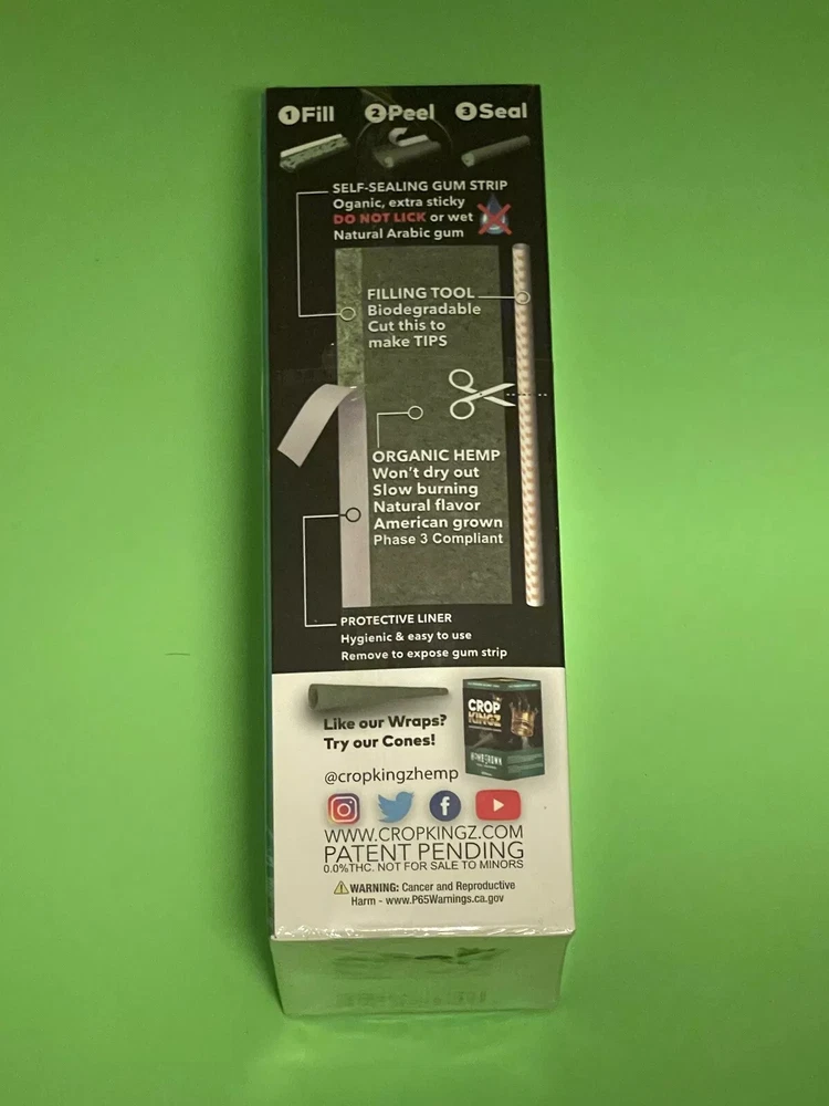 Free Gifts 🎁 with Purchase Fast shipping WE USUALLY PACK & SHIP THE SAME OR NEXT BUSINESS DAY Tobacco free Contains = 15 Sealed Packs 2 Organic Premium Wraps per pack Total = 30 Organic Premium Wraps Crop Kingz 👑 Home 🏡 Grown Plain / Unflavored Made in USA 🇺🇸 New!!! Self-Sealing Wraps 1. Fill 2. Peel 3. Seal Organic Hemp Won’t dry out Slow Burning 🔥 Natural Flavor American 🇺🇸 grown Phase 3 Compliant Self-Sealing Gum Strip Organic, extra sticky DO NOT LICK 👅 or wet 💧 Natural Arabic gum Filling Tool Biodegradable Cut ✂️ to make tips Protective Liner Hygienic & easy to use Remove to expose gum strip