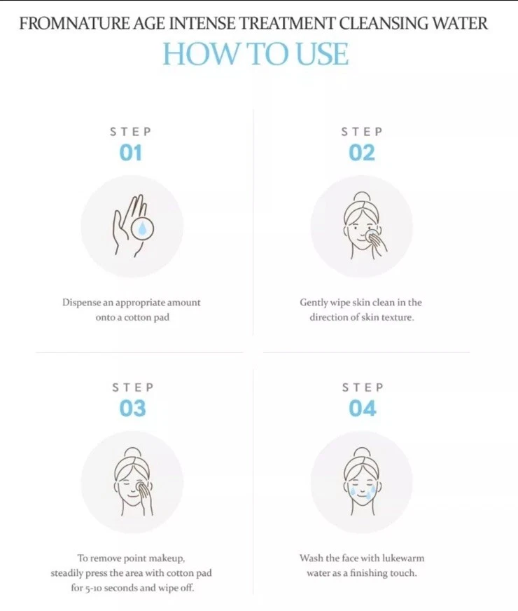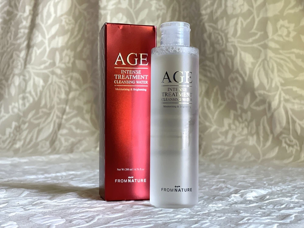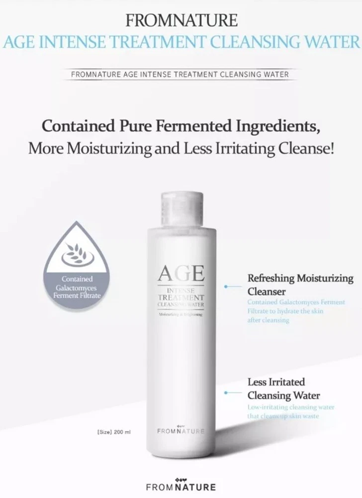 FROM NATURE Age Intense Treatment Cleansing Water 200ml ▶ Brand : FROM NATURE ▶ Target Area : Face ▶ Skin Type : All Skin Types ▶ Condition : 100% Brand-new ▶ Capacity : 6.76 FL. OZ. / 200ml ▶ Product description The galactomyces fermentation filter moisturizes the skin, making it moist even after washing your face. The AHA component removes dead skin cells and wastes to improve the skin to be soft and refreshing. Skin irritation test completed. ▶ How to use 1. Wet it with a cotton pad and apply it according to the skin texture. 2. Raise the area around the eyes and mouth for about 10 seconds and wipe it lightly. 3. Wash it with lukewarm water.