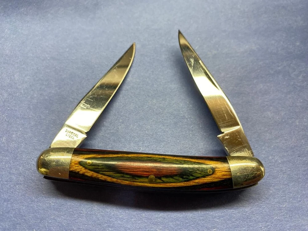 Handle Material: Wood Number of Blades: 2 Color: Multi Blade Range: Under 2.75in. Opening Mechanism: Manual Blade Type: Clip Point Type: Pocketknife Original/Reproduction: Original Lock Type: Slipjoint Model: Mini-muskrat Blade Material: Stainless Steel Blade Edge: Plain Brand: Frost Cutlery