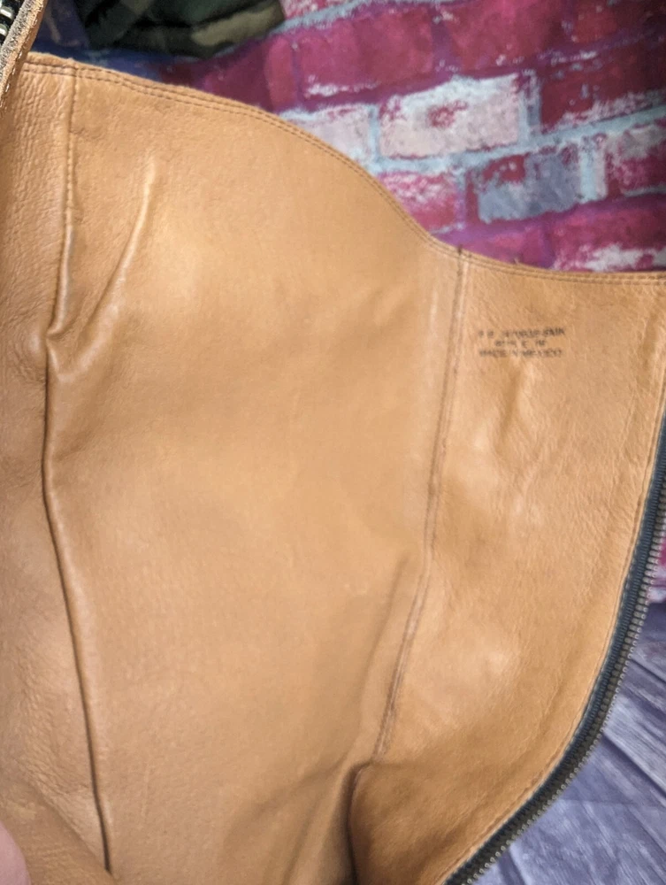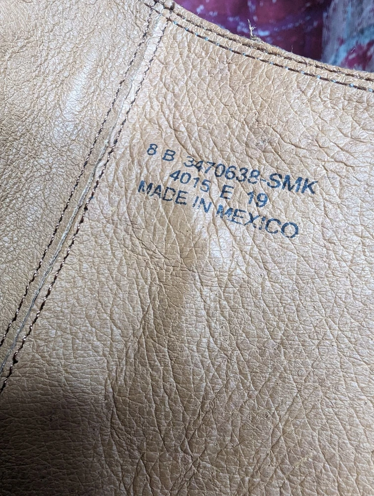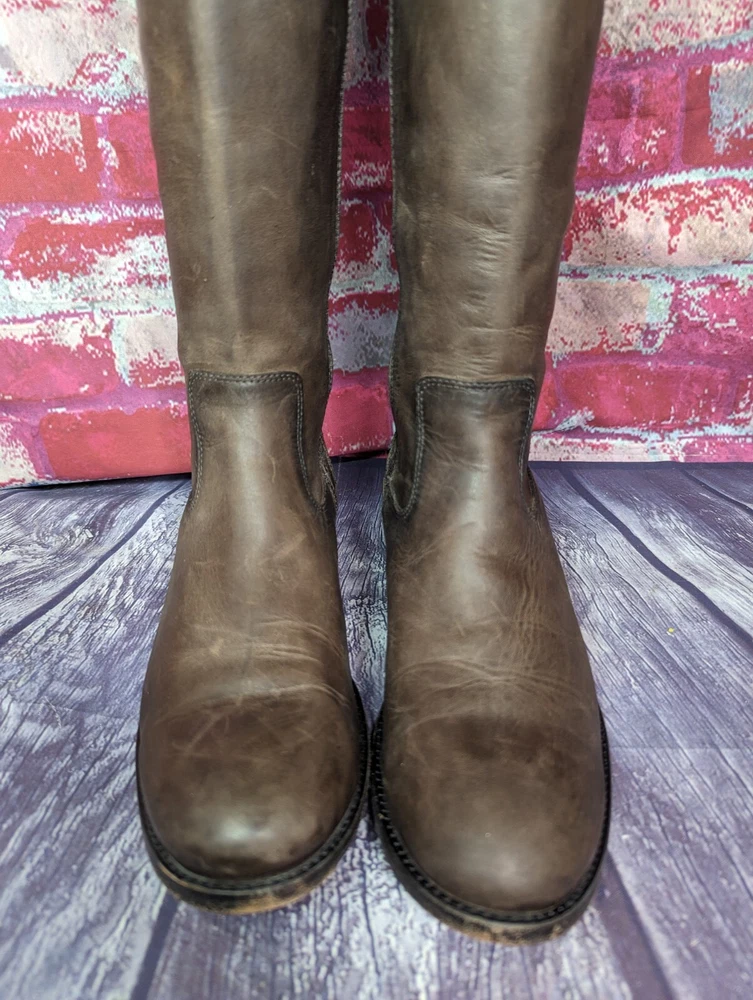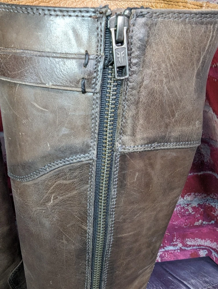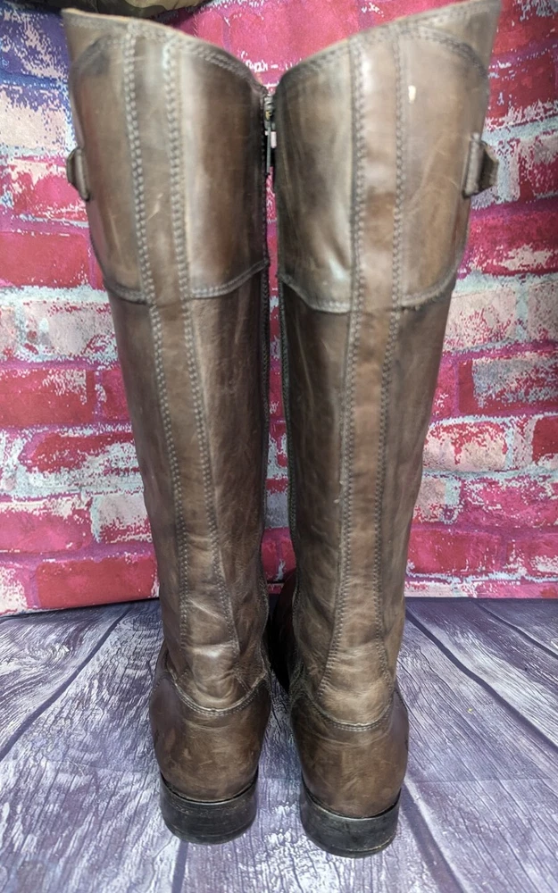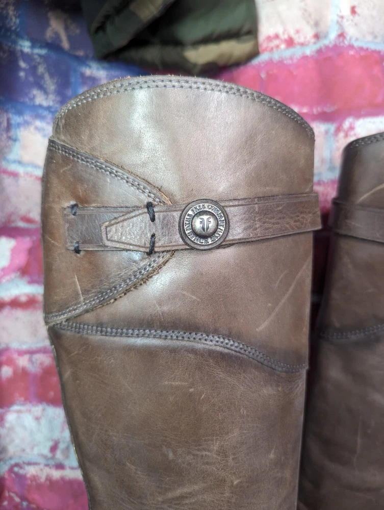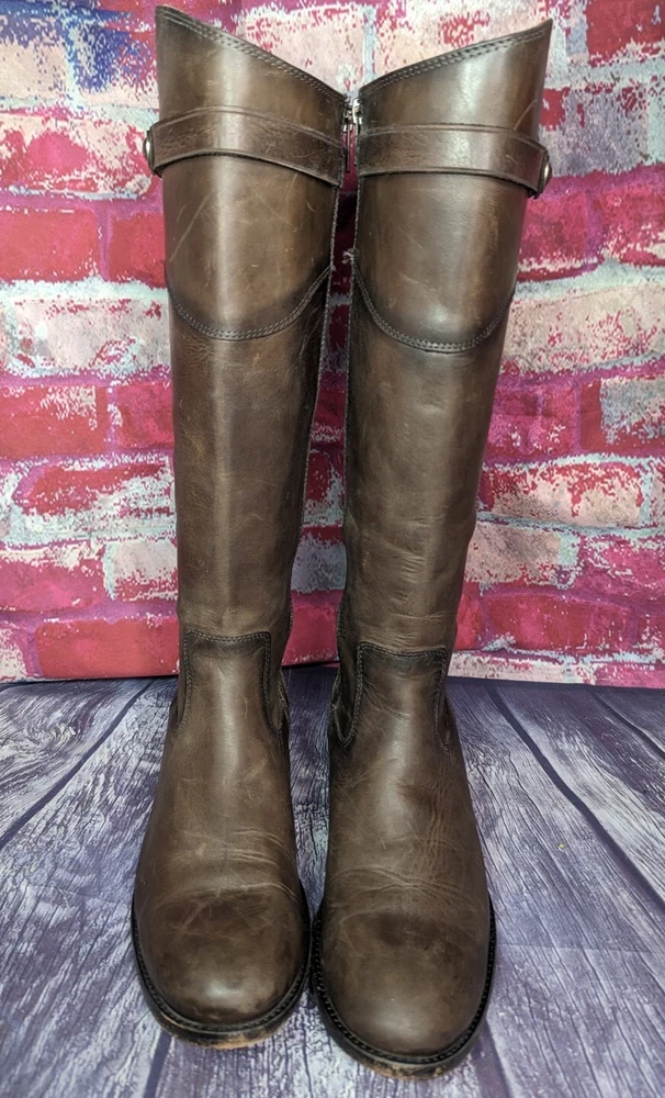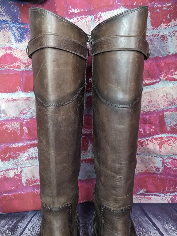 FRYE MOLLY BUTTON KNEE HEIGHT RIDING BOOTS - SIZE 8 B 100% Leather Imported Leather and Rubber sole Shaft measures approximately 15" from arch Heel measures approximately 1" 14" Circumference Knee-high riding boot with asymmetric opening and curved cuff with decorative logo buckle strap Full-length instep zipper