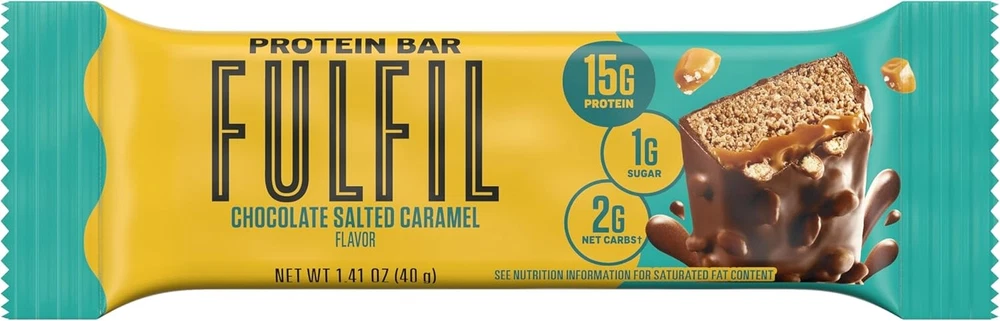 FULFIL Protein Snack Bars, Chocolate Salted Caramel 1.41 Ounce (Pack of 12) Product Details Product Dimensions : 7.56 x 4.75 x 2.44 inches; 1.06 Pounds Item model number : 01-100-00833 Manufacturer : Hershey Type: Protein Flavor: Chocolate Salted Caramel Diet Type: Gluten Free Product Benefits: High Protein Number of Items: 1 WE SWEAR, IT'S A PROTEIN BAR: Enjoy a 12 count of our 40g FULFIL Chocolate Salted Caramel Flavored Protein Bars with 15g protein that's so good you'll think it is candy EVERYDAY PROTEIN: Enjoy your Chocolate Salted Caramel flavored protein bar full of flavor at work, before or after the gym, on the go, hiking, traveling, at the office, and all the ordinary days in-between! GLUTEN FREE: This gluten free protein bar will become your new favorite pantry staple with a soft and chewy nougat center surrounded by miniature crispies and covered in two layers of chocolatey goodness HIGH QUALITY INGREDIENTS: Enjoy the sweet and salty combination of salted caramel and chocolate flavors by biting into FULFIL snack bars all year long GOOD SOURCE OF PROTEIN: Treat yourself with our delectable protein bars packed with 15g of protein, 2g of net carbs, and 1g of sugar. You are getting benefits that fulfill! COLD PACK SHIPPED: items will be shipped with cold packs to prevent the product from melting during the summer months if needed Fuel your everyday adventures with a heavenly blend of salted caramel and chocolate flavors. FULFIL protein bars aren't just for the gym crowd. Catching an early flight? Heading out on a hike with friends? Taking a much needed coffee break? Simply having a busy day? Grab a gluten free FULFIL bar and discover protein snackfection at home, at the office or on the go. Wherever your day takes you, you'll be prepared with sweet and salty chocolate caramel flavor and 15 grams of protein all in one convenient bar. Your gym buddies, friends, family and co-workers will all want to try one whether they've just finished a tough workout or are simply having a busy day at work. FULFIL snack bars feature a soft and chewy nougat center surrounded by miniature crispies and covered in two layers of chocolatey goodness. Best of all, each protein bar contains 15 grams of protein, 1 gram of sugar and 2 grams of net carbs. Stock your pantry or desk drawer or grab a bar on the go for a fulfilling snack full of chocolate salted caramel flavor. Gluten free FULFIL snack bars offer rich flavor wherever your day takes you, from the office to the gym and back home again.