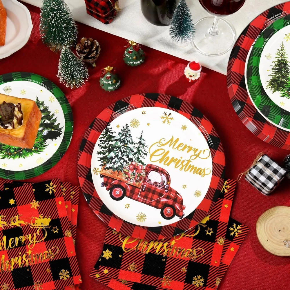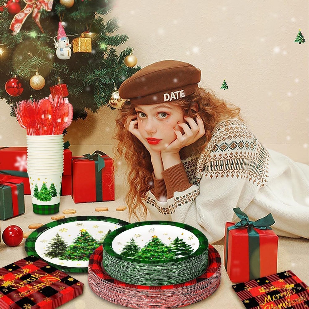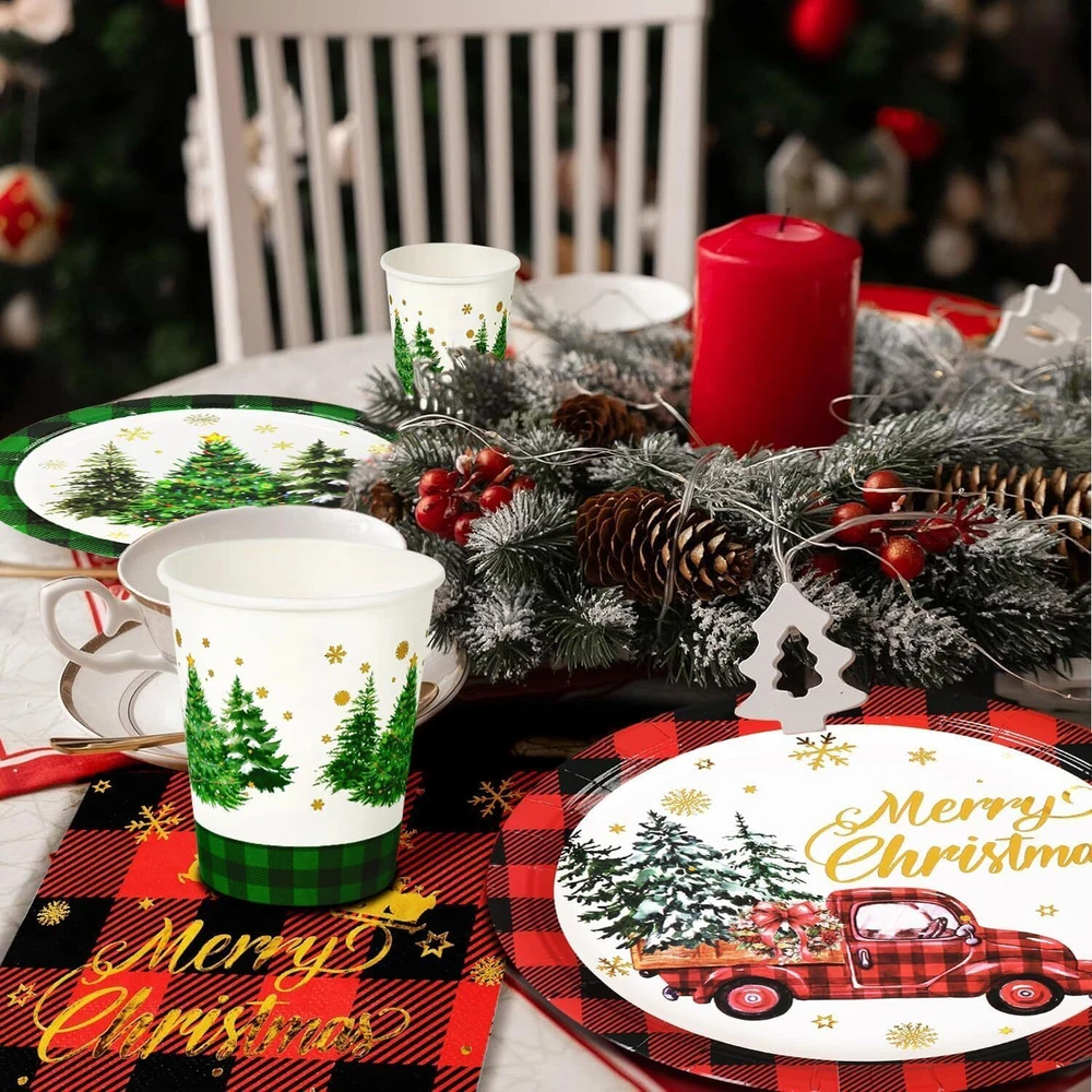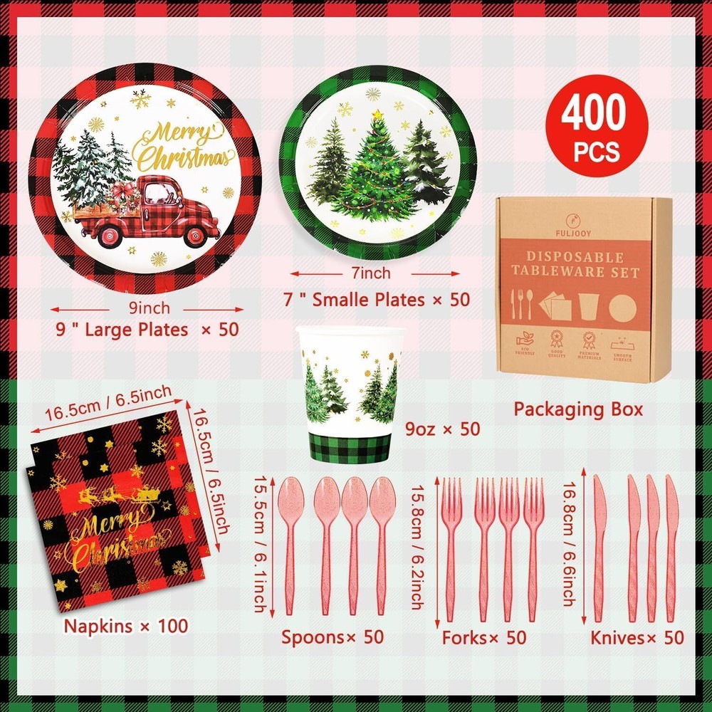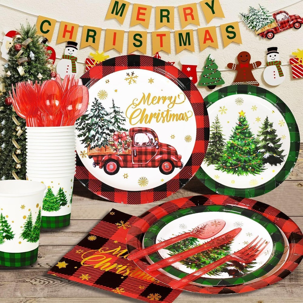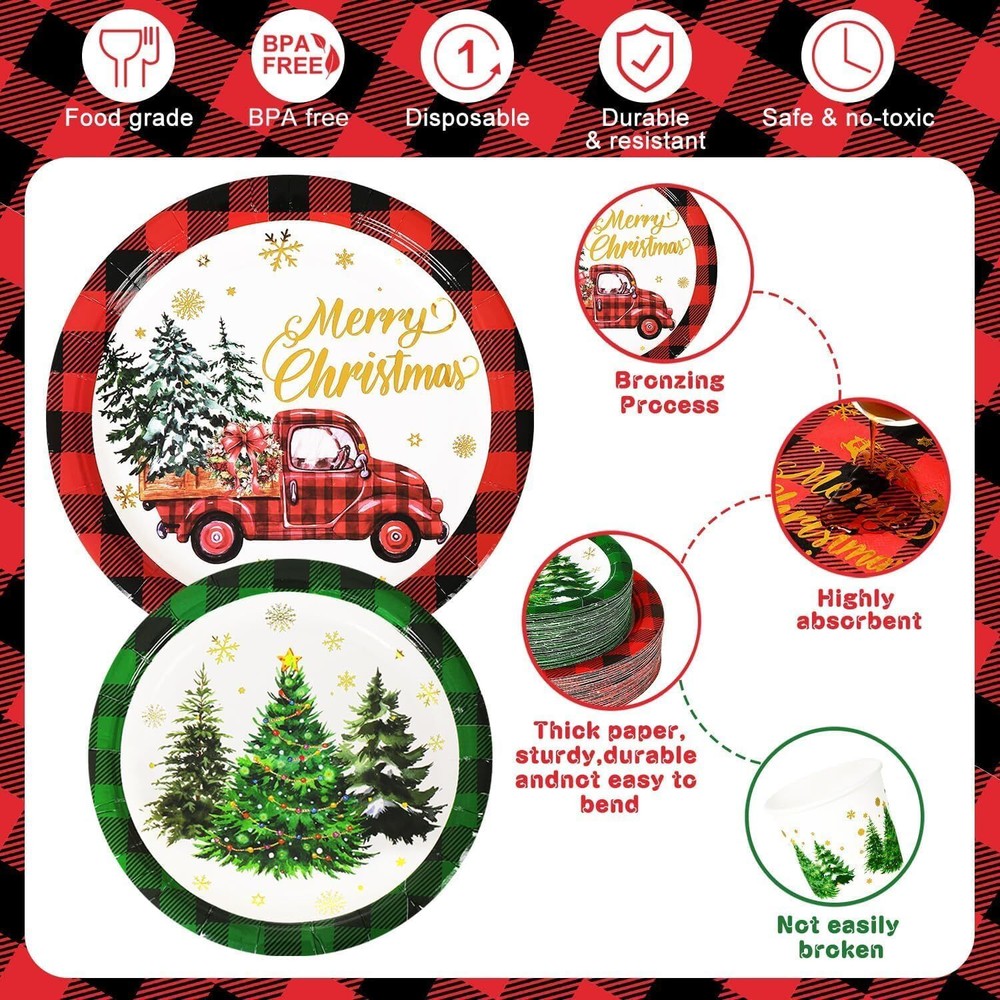 Features: This set provides an ample quantity of party essentials, designed to be waterproof, lightweight, and easy to carry and store. Please confirm the size before purchasing. Specifications: Material: Paper Color: Red and Green Size: 7-inch and 9-inch paper plates Package Includes: 50 x Poinsettia Tree 7-inch paper plates 50 x Poinsettia Truck 9-inch paper plates 100 x Napkins 50 x 9oz Paper cups 50 x Plastic knives 50 x Plastic forks 50 x Plastic spoons TIPS: Manual measurements may cause slight size discrepancies. Color differences may exist due to different displays. Generous Quantity for Holiday Needs: This party set includes 50 pieces of dinnerware, ensuring you have more than enough plates and napkins to accommodate your guests during festive occasions. With 50 paper plates, 50 cups, 100 napkins, and 150 plastic utensils (50 each of knives, forks, and spoons), you can host a grand celebration without worrying about running out of supplies. Perfect for holiday parties, family gatherings, and special events. Gold Foil Charming and Vintage Aesthetic: Our Christmas party dinnerware set features a classic red and green buffalo check design paired with festive elements that create a delightful and sophisticated look. Each piece is printed with “Merry Christmas” in elegant gold foil, adding a luxurious touch to your holiday celebrations. This set not only provides practicality but also enhances the festive mood, making it perfect for family gatherings, holiday parties, and seasonal festivities. Durable Materials for Holiday Entertaining: This packaging includes high-quality dessert plates, cups, and napkins featuring vintage truck designs, crafted from robust paper and sturdy plastic utensils. This set guarantees a reliable and attractive option for your holiday gatherings, ensuring that your celebrations are both stylish and practical. Effortless Cleanup, Maximum Enjoyment: Nobody enjoys cleaning up after a party, which is why we designed this Christmas set for ultimate convenience! Featuring disposable paper, all items including the festive plates, cups, napkins, and cutlery are meant to be thrown away after use. Save time and effort, allowing you to focus on enjoying every moment of your celebration. These Christmas-themed supplies are perfect for winter gatherings, ensuring relish in the joy without the cleanup stress! Multi-Purpose Use for Festive Celebrations: Whether you're planning a lively Christmas party or just give your table a seasonal makeover, our red and green buffalo check set includes disposable dessert plates, cups, napkins, and cutlery can energize any occasion. With their charming truck print and vibrant colors, these supplies effortlessly elevate the appeal of various events and festivities, making them a perfect addition to holiday dinners, festive gatherings, and cozy family celebrations.