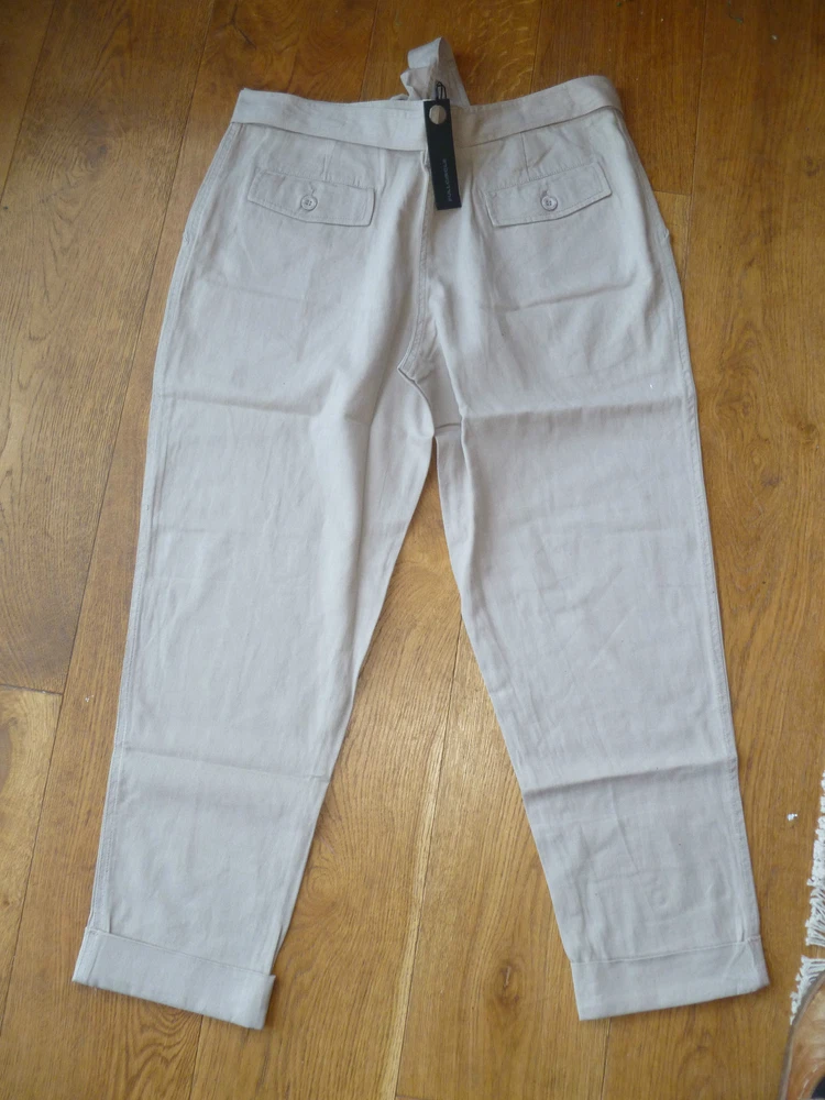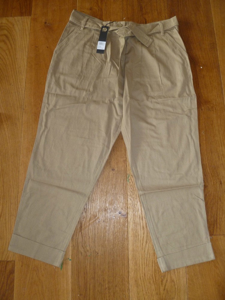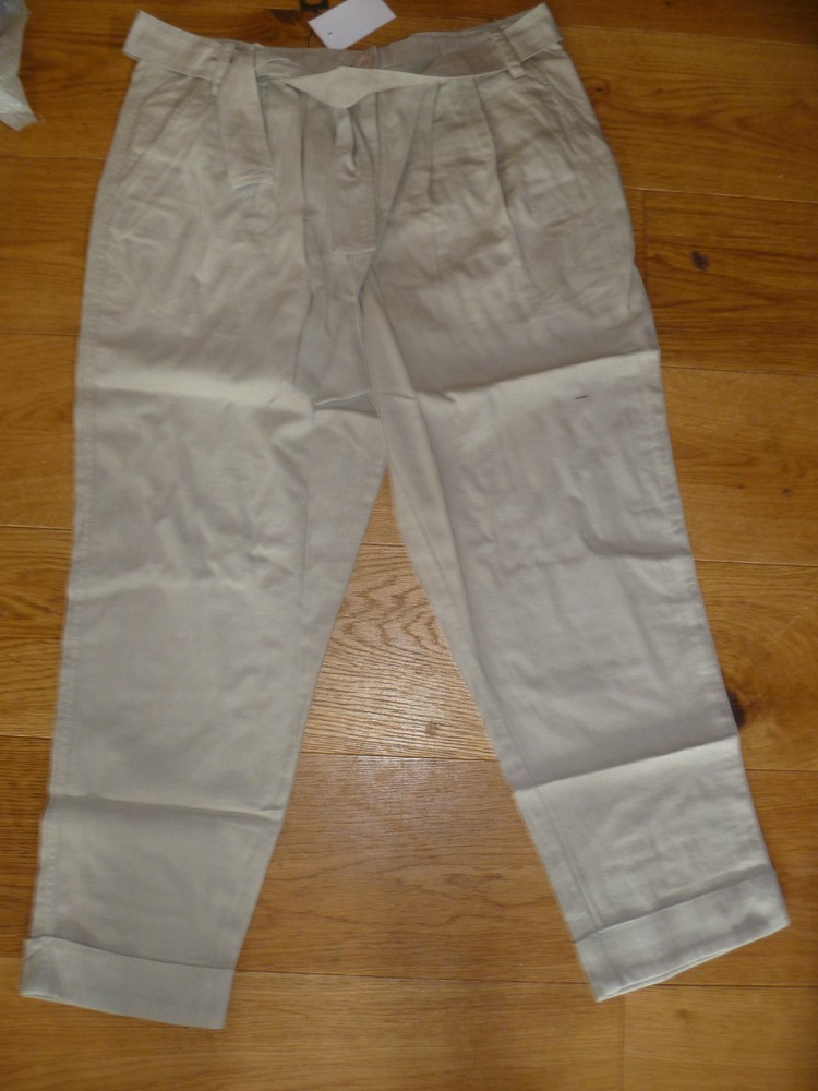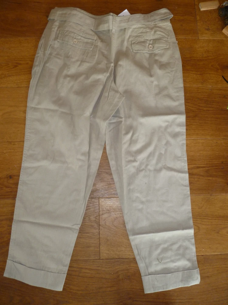 FULL CIRCLE LOOSE BELTED PLEATED PAPERBAG TROUSERS LIKE A GENTLE HAREM STYLE SIZE 32 WAIST, 32 LEG APPROXIMATES TO UK 14 CHOOSE COLOURS...BEIGE CALLED BISCUIT, LIGHT SAGE CALLED KHAKI, LIGHT TAUPE CALLED DONKEY BRAND NEW UNWORN WITH TAGS these are fabulous trousers constructed from durable lightweight cotton fabric, like a lightweight denim in 3 subtle colours biscuit which is beige khaki which is a light grey sage green and donkey which is a light taupe brown colour they are designed to sit low on the hips they have a loose fit and dropped rise like harem trousers they have a waistband with belt loops and a same colour same fabric tie belt there are 2 pleats either side of midline on the front there is a central button and zip fly the buttons are all branded 2 side pockets upper front 2 flapped buttoned pockets at the back the leg ends are fixed turn ups please note, one or two of the trousers do not have internal labels, most do the following measurements are approximate and taken fro the outside of the garment it is a good idea to compare with another pair of trousers you have for idea of fit and style SIZE 32 WAIST, 32 LEG waistband seam to seam 17.25 INCHES rise 12.25 INCHES width top of thigh 13.5 INCHES width lower leg end 7.25 INCHES inside leg 27 INCHES any questions please ask i am human and friendly smoke and pet free and accept unworn returns within 14 days LIMITED STOCK SO BUY IT NOW BEFORE ITS TOO LATE!!
