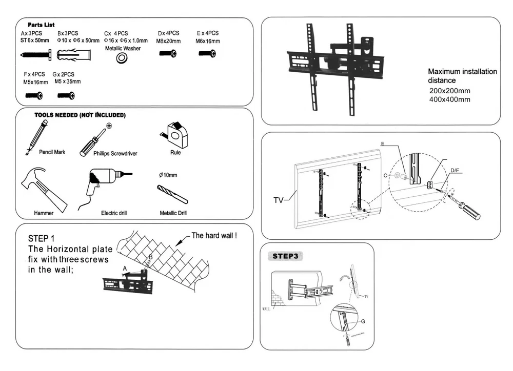 Double Layer Cat Litter Mat Trapping Honeycomb Soft Waterproof Kitty Litter Mat 12.34 USD 12.99 USD Free shipping 5% off BBQ Brush Scraper 18" Stainless Steel Oven Grill Tool Cleaning Three-Head New 11.39 USD 11.99 USD Free shipping 5% off 100 - 200 pcs 4" to 20" INDUSTRIAL WIRE CABLE ZIP UV NYLON TIE WRAPS 8.11 USD 8.54 USD Free shipping 5% off 100-200 X CABLE ZIP TIES Heavy Duty UV Resistant UL 4" 6" 8" 12" 15" 18" 24" 36" 6.64 USD 6.99 USD Free shipping 5% off Full Motion TV Wall Mount Bracket Swivel Tilt for 26 32 36 37 40 42 46 49 50 55" 19.94 USD 20.99 USD Free shipping 5% off Holder Kitchen Roll Towel Paper Rack Under Cabinet Wall Toilet Self Adhesive 10.44 USD 10.99 USD Free shipping 5% off 2/4 Pack Solar Firefly Lights 64 LED Solar Garden Lights for Outside Waterproof 17.09 USD 17.99 USD Free shipping 5% off Full Motion TV Wall Mount Bracket Swivel Tilt for 26 32 36 37 40 45 49 50 55 60" 23.74 USD 24.99 USD Free shipping 5% off Pop Up Privacy Shower Tent Portable Outdoor Shower Tent Camp Toilet Rain Shelter 31.34 USD 32.99 USD Free shipping 5% off 50× Disposable Shower Drain Hair Catcher Mesh Sticker Strainers for Shower Drain 12.63 USD 13.29 USD Free shipping 5% off Rectangle 3D Mesh Bath Pillow Spa Pillow With Suction Cup For Hot Tub Bathtub 13.53 USD 14.24 USD Free shipping 5% off 6 Pack Metal Wonder Closet Hanger Organizer Hook Space Saving Clothes Rack NEW 11.72 USD 12.34 USD Free shipping 5% off Product Description FULL MOTION SWIVEL TILT LCD LED TV WALL MOUNT BRACKET 26 32 40 42 43 47 50 55 Universal TV Mount - This TV wall bracket fits most 26,30,32,37,40,42,46,47,50,55 inch TVs with VESA patterns from 100x100mm to 400x400mm and holds up to 77 lbs. /35kg. Please CHECK TV weight, size, VESA, wood stud location, and input access before purchase. Optimised Viewing Experience - The full motion TV mount can swivel left or right 90°, tilts up 5°, tilts down 13°, and has +3°/-3° screen level adjustment capability. The swivel TV wall mount gives you the maximum flexibility to point your TV where you want. Perfect Center Design - Single stud TV mount is easy to center the TV or mount in the corner to save space. Articulating wall mount made of heavy duty steel ensures the strong arms to hold your TV stable. Automatic robot welding tech makes the whole TV mounting bracket sturdy and safe. Easy Installation - The wall TV mount comes with hardware mounting kit and step-by-step instructions for easy installation within 10 minutes. Concrete Anchors will be sent per request. All our wall mount TV brackets can not be installed on drywall alone. About Us Payment Shipping Returns Contact Us My friend, What a beautiful day! Thank you for choosing my store. Welcome to my store and see if you like these products. You are not just our customer, but our friend. If there is any product you need that we don't have, you can tell me, and I will update the product for you. In the process of purchasing the product, if you are satisfied, please give me a positive feedback, your encouragement will let me move on. If you have any dissatisfaction with my products or services, please let me know once and please do not leave bad feedback. If you have any questions, please contact me first. Best regards to you and your family. Thank you and have a great day! We accept PayPal and all forms of credit card. We will only ship to the confirmed Paypal shipping address given with the payment. We do not offer local pick up service. The shipping rates listed are only for residential or commercial destinations in the continental 48 United States. All international sales will go through eBay Global Shipping Program.please ask us if there are any questions. We only ship the item to the address that is sent to us at the time of checkout. Please verify the correct shipping address in your PayPal account before making your payment. If we ship your item to an old or invalid address and you are not able to locate the item, we are not responsible for shipping a replacement.Currently, we do not ship to Hawaii, Alaska, Puerto Rico,APO/FPO/PO Boxes. We use USPS, UPS & FedEx as shipping method. Payments cleared before 12 PM PST, will be shipped on the same day. 30 days Money Back Guarantee. If any package that needs to be returned, please contact our customer service first to receive a RMA form. All return items MUST be in brand new condition. Your five-star reviews help us grow and improve our business, and help us keep eBay fees down. Please give us positive feedback when the item arrives and you are satisfied. Please contact us before leaving any neutral or negative feedback. We always consider our customers to be our number one asset. Please feel free to let us know if there are any problems or inquiries with an item and we will take care of it for you. so that we can resolve the issue in the best way possible without having to open a case through eBay and without negative feedback. About Us My friend, What a beautiful day! Thank you for choosing my store. Welcome to my store and see if you like these products. You are not just our customer, but our friend. If there is any product you need that we don't have, you can tell me, and I will update the product for you. In the process of purchasing the product, if you are satisfied, please give me a positive feedback, your encouragement will let me move on. If you have any dissatisfaction with my products or services, please let me know once and please do not leave bad feedback. If you have any questions, please contact me first. Best regards to you and your family. Thank you and have a great day! Payment We accept PayPal and all forms of credit card. We will only ship to the confirmed Paypal shipping address given with the payment. We do not offer local pick up service. Shipping The shipping rates listed are only for residential or commercial destinations in the continental 48 United States. All international sales will go through eBay Global Shipping Program.please ask us