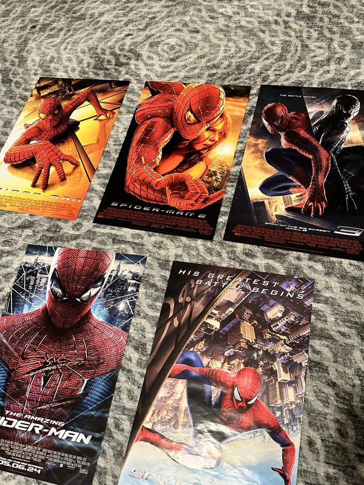 This lot includes authentic 11x17 posters of all of the 2024 Spiderman rereleases, featuring one poster from each movie. These original posters are a must-have for any movie memorabilia collector, and are sure to add some excitement to your collection. The posters are in great shape and ready to be displayed in your home or office. Don't miss out on this opportunity to own a piece of movie history. I was lucky enough to have one extra duplicate of each movies posters when I went to each and every screening myself. I took a full month and a half going to each movie to make this lot happen. Hope it’s worth it to the lucky fan who get’s it!
