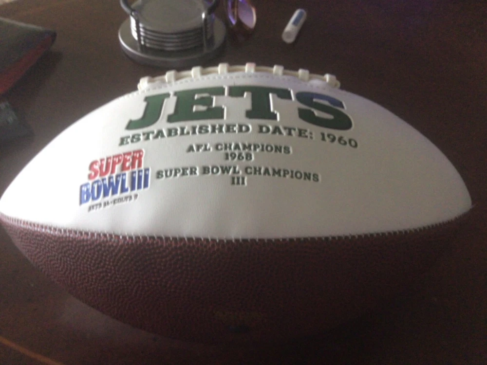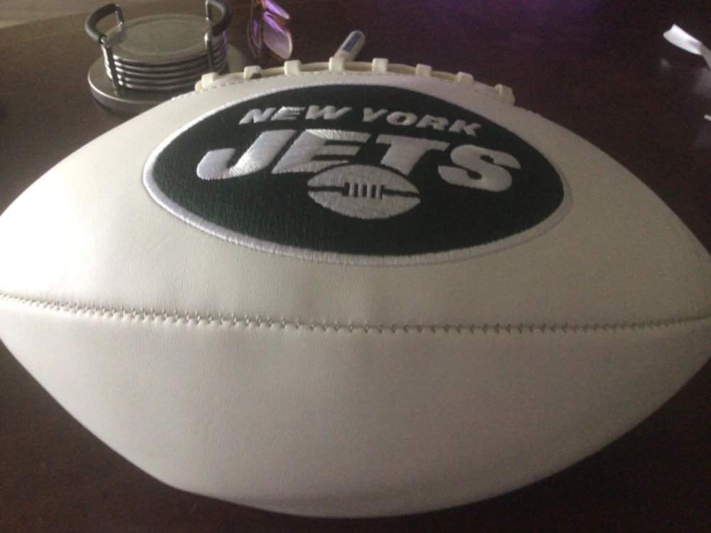Get ready for game day with this full-size NY Jets white panel football! This high-quality fan apparel and souvenir is perfect for any die-hard football fan. Show off your team spirit and love for the National Football League (NFL) with this officially licensed product. Whether you're using it as a decorative piece or to play a game, this football is sure to impress. Its sleek design and white color make it a great addition to any sports memorabilia collection. Don't miss out on this opportunity to show your support for the NY Jets and add this unique item to your Sports Mem, Cards & Fan Shop collection today!