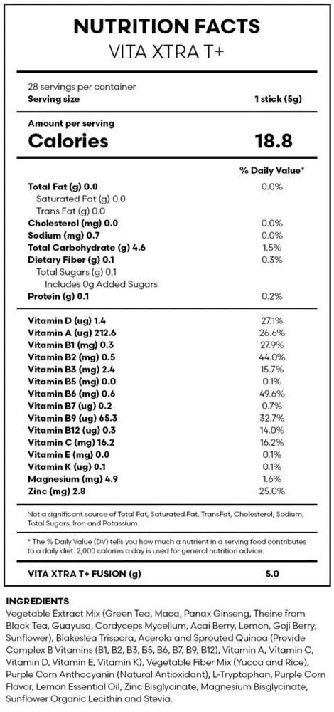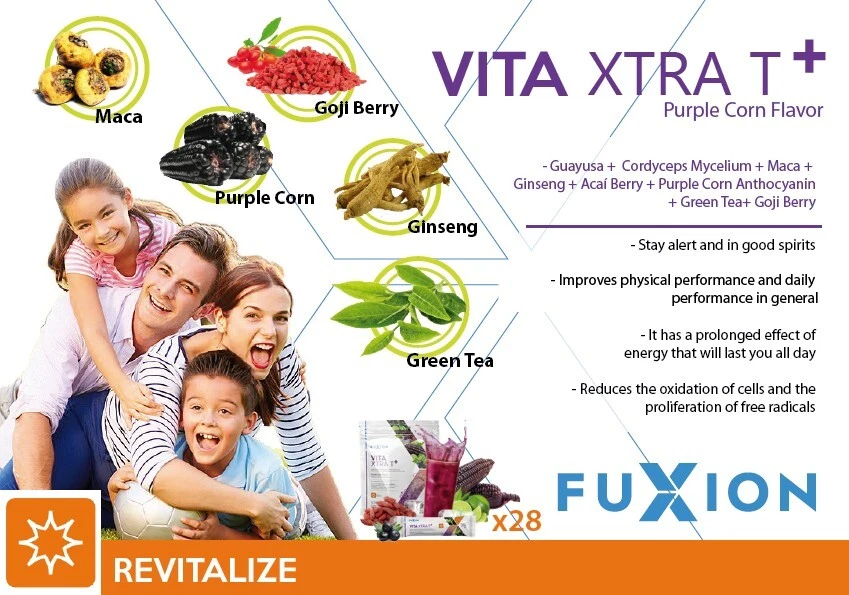 FUXION VITA XTRA T-Support Whole Day Energy W. MACA & GINSENG-1 Bag (28 sachets). VITA XTRAT This unique antioxidant, multivitamin and multimineral drink is a powerful nutritional source to give you physical energy and vitality. This incredible Clean Label formula will help you to receive a long-lasting energy boost that will last the whole day, while reducing cellular oxidation. These statements have not been evaluated by the Food and Drug Administration. This product is not intended to diagnose, treat, cure, or prevent any disease.