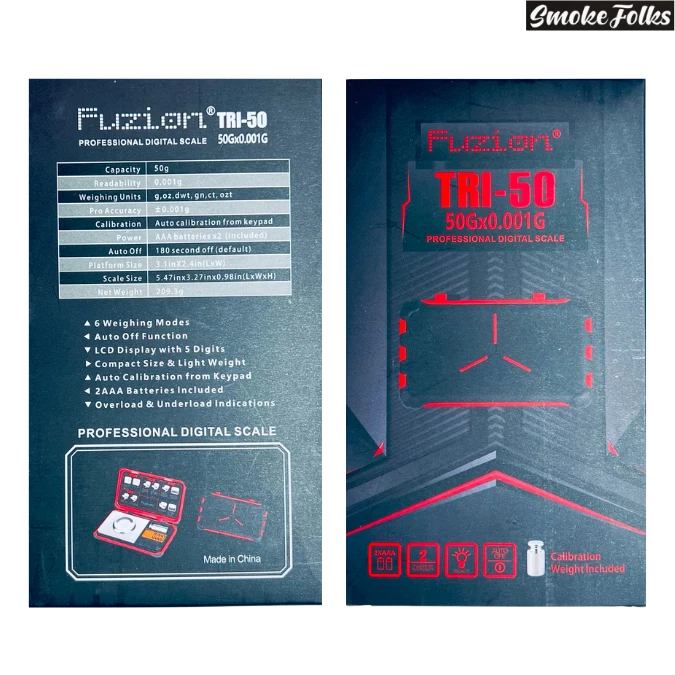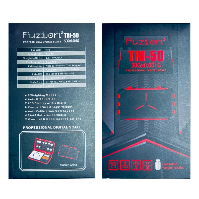 FUZION TRI-50 X 0.001G PROFESSIONAL DIGITAL SCALE – PRECISION MEETS STYLE The Fuzion TRI-50 is the perfect blend of functionality, precision, and vibrant style. Designed for professionals and enthusiasts alike, this scale offers ultra-fine accuracy of 0.001 grams while supporting six versatile weighing modes. Compact, lightweight, and available in four stunning colors (red, green, orange, and blue), the TRI-50 is as reliable as it is stylish. KEY FEATURES High Precision Performance: Delivers outstanding accuracy with a readability of 0.001 grams and a maximum capacity of 50 grams , perfect for weighing jewelry, powders, and more. 6 Weighing Modes: Easily switch between grams (g), ounces (oz), troy ounces (ozt), pennyweight (dwt), carats (ct), and grains (gn) to meet diverse weighing needs. Tare Full Capacity: Effortlessly weigh items by subtracting the container weight using the tare function , allowing full capacity use. Energy-Saving Auto-Off Feature: Automatically shuts off after 180 seconds of inactivity to preserve battery life. Compact and Portable: Measuring 5.6″ x 3.3″ x 0.9″ , the scale is easy to carry, store, and fit into your workspace or travel kit. Vivid Color Options: Choose from red, green, orange, or blue , adding a stylish touch to your workspace or personal setup. LCD Display with 4.5 Digits: A clear, bright display ensures easy readability, even in low-light conditions. SPECIFICATIONS Feature Details Capacity 50 grams Readability 0.001 grams Weighing Modes g, oz, ozt, dwt, ct, gn Tare Function Full Capacity Auto-Off Timer 180 seconds Net Weight 174 grams Dimensions 5.6″ x 3.3″ x 0.9″ (compact design) Power Supply 2 AAA batteries (included) Calibration Weight 50 grams (included) Display LCD with 4.5-digit clarity Available Colors Red, Green, Orange, Blue WHAT’S INCLUDED IN THE BOX? Fuzion TRI-50 Digital Scale 50g Calibration Weight for easy recalibration 2 AAA Batteries to power the scale out of the box User Manual WHY CHOOSE THE FUZION TRI-50 DIGITAL SCALE? Unmatched Precision: Perfect for weighing tasks requiring fine accuracy up to 0.001 grams . Stylish Design: Available in four vibrant colors , it adds a splash of personality to your workspace. Compact & Portable: Lightweight and travel-friendly, making it ideal for professionals on the go. User-Friendly Features: Tare function, auto-off, and clear LCD display simplify your weighing experience. Reliable Build: Includes a calibration weight and operates on AAA batteries for long-lasting use. With the Fuzion TRI-50 X 0.001G Professional Digital Scale , you get precision, style, and portability in one perfect package. Elevate your weighing experience today!