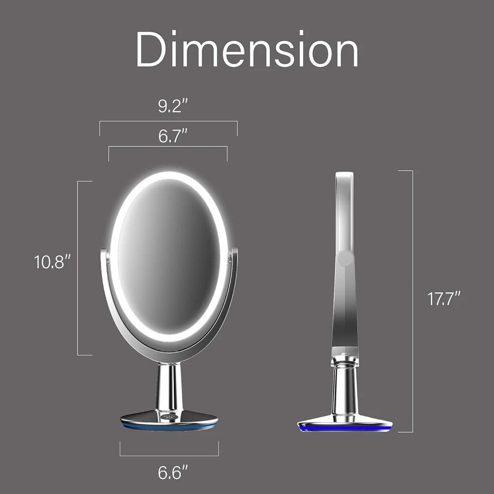 FVLFIL Biomax Superstar Oval Shaped Dual-Sided Lighted Makeup Mirror, 1X/5X Magnifying Vanity Makeup Mirror, 360 Degree Rotating Adjustable Brightness Mirror, Brushed Nickel Product Details Brand: FVLFIL Room Type: Bedroom Shape: Oval Product Dimensions: 17.7"L x 6.7"W Frame Material: Premium Pearl Nickel Brushed, Shiny & Smooth Brand: FVLFIL Room Type: Bedroom Shape: Oval Product Dimensions: 17.7"L x 6.7"W Frame Material: Premium Pearl Nickel Brushed, Shiny & Smooth Style: Modern Mounting Type: Floor Mount Finish Type: Brushed Surface Recommendation: Glass Special Feature: dual_sided, magnifying, lighted Color: Silver Theme: Space Specific Uses For Product: Dressing, Makeup Number of Pieces: 100 Number of Items: 1 Material: Glass, Plastic Frame Type: Framed Item Weight: 5 Pounds Assembly Required: No Frame Color: brushed nickel Magnification Maximum: 5 Manufacturer: Lomak Industrial Company Ltd UPC: 704078999593 Item Weight: 5 pounds Country of Origin: China Item model number: 552000018 Is Discontinued By Manufacturer: No Date First Available: March 25, 2020 SUPERSTAR is an elegantly designed, oval-shaped, dual-sided lighted makeup mirror with a brushed nickel finish on plastic, effectively preventing moisture and condensation. It features the True Lux lighting system, offering ultra-clear, distortion-free mirrors for a flawless beauty experience. Equipped with 192 high-quality, long-lasting LEDs, SUPERSTAR delivers optimal daylight effects at a brightness level of 875 LUX, ensuring even illumination across the face. The brightness is adjustable between 60% and 100%, controlled by holding the on/off switch. A short press turns the light on or off, catering to various makeup needs for a more refined look. The signature touch switch, combined with an intelligent memory function, allows for simple brightness adjustments and retains the users preferred light level. Additionally, the smart timer automatically turns off the light after 30 minutes. Dual-Sided Mirror: The 360-degree rotating, dual-sided oval mirror offers 1X and 5X magnifications, providing superb reflection, clarity, and distortion-free viewing. Nightlight: SUPERSTAR includes an ambient light setting that projects a blue halo in night environments, creating a romantic and warm atmosphere. It is powered by an AC adapter. The SUPERSTAR Dual-sided Lighted Vanity Mirror features an elegant chrome finish designed to resist moisture and condensation. Equipped with the True Lux lighting system, it provides ultra-clear, distortion-free mirrors for a flawless beauty experience. The mirror boasts 192 long-lasting, high-quality LEDs that can operate up to an impressive 100,000 hours during regular use. The package includes an AC adapter, user manual, and warranty card.