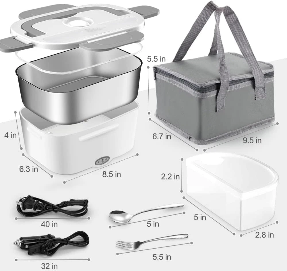 FVW Electric Lunch Box Food Heater, 3 in 1 Portable Warmer Gray Product Details Color: Gray Material: Stainless Steel Brand: FVW Recommended Uses For Product: Office Age Range (Description): Adult Special Feature: Leak Resistant, Microwave Safe Capacity: 1.5 Liters Theme: Car Pattern: Solid Product Care Instructions: Hand Wash Included Components: Electric lunch box, Insulated lunch carry bag, Plastic additional compartment, Leak-proof seal ring, Stainless steel spoon & fork, 304 stainless steel inner box, Dishcloth, 12V-24V power cord for cars/trucks, 110V for home/office use Number of Compartments: 1 Style: Portable Shape: Car Product Dimensions: 7"L x 9"W x 4"H Unit Count: 1.0 Count Number of Items: 1 Item Form: Rectangular Item Weight: 1.96 pounds Country of Origin: China 【3 IN 1 ELECTRIC LUNCH BOX】No need to looking for a microwave and wait in line for heating, now simply plug in and heat up your food with the electric heating lunch box at home/office or in car/truck using the 110/12V/24V power cables. keep constant heating between 60°C and 70°C when plugging in, always serving you a hot meal. 【SAFTY & FAST PTC HEATING TECHNOLOGY】Using PTC original constant temperature heating, low-consumption heat cycle to keep food at a suitable temperature and keep the moisture of the food. It normally takes 20-30 minutes to warm the food, super efficient and energy-saving. (If the food was taken out of the fridge or where the ambient temperature is low, the heating time should be extended appropriately). 【LEAK PROOFING】Improved cover design, the cover will not move during use, more tightly covered. Because leak-proof seal ring design is added, it improves the defect of food leakage. Prevent fluid leakage in sloshing car environments. 【EASY TO CLEAN & PORTABLE】 It contains a removable stainless steel tray, which you can clean it easily. No Leaks!! Sealed outer container to retain heat and keep foods fresh, built-in utensils tray, and anti-scalding handle to make it easy to carry the box. 【PACKAGE LIST】Electric lunch box warmer includes: 1x electric lunch box ( FVW ), 1x insulated lunch carry bag, 1x plastic additional compartment,1x leak-proof seal ring, 1x stainless steel spoon & fork,1x 304 stainless steel inner box, 1x dishcloth, 1x 12V-24V power cord for cars/trucks, 1x 110V for home/office use. Capacity 1.5L.
