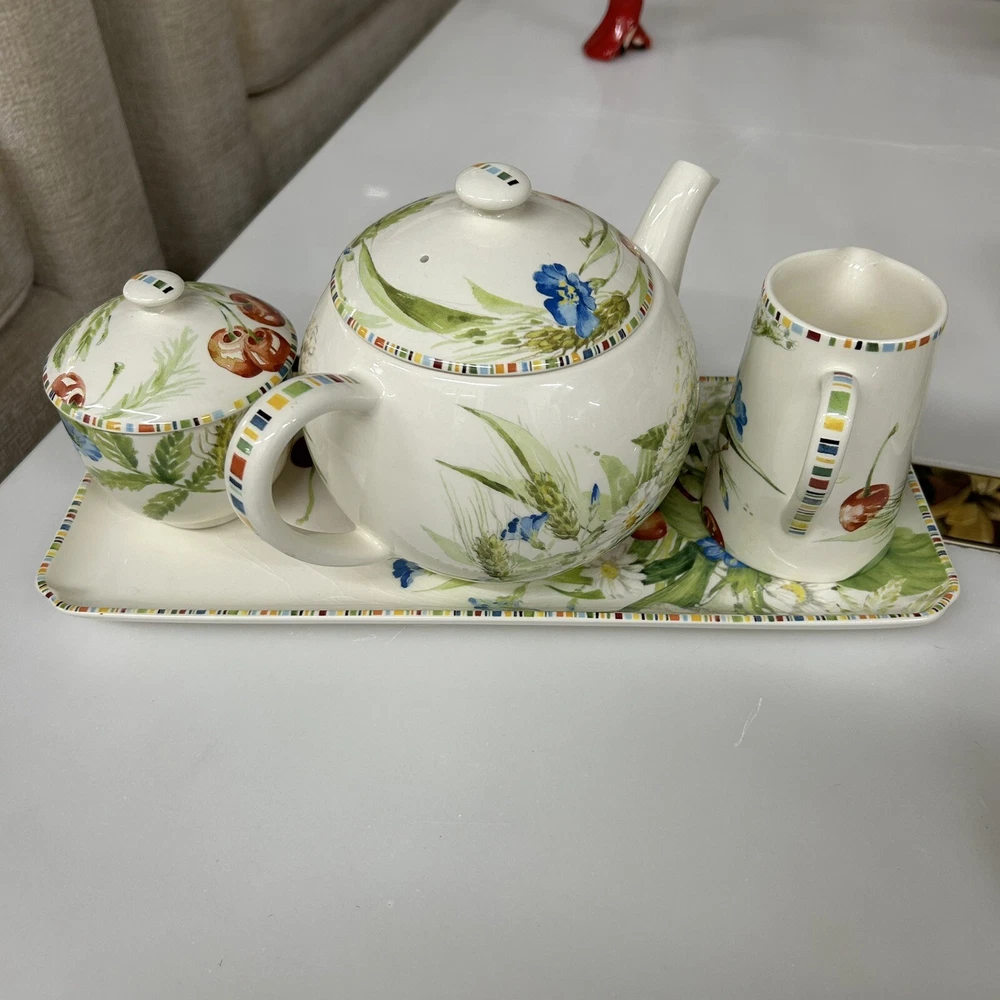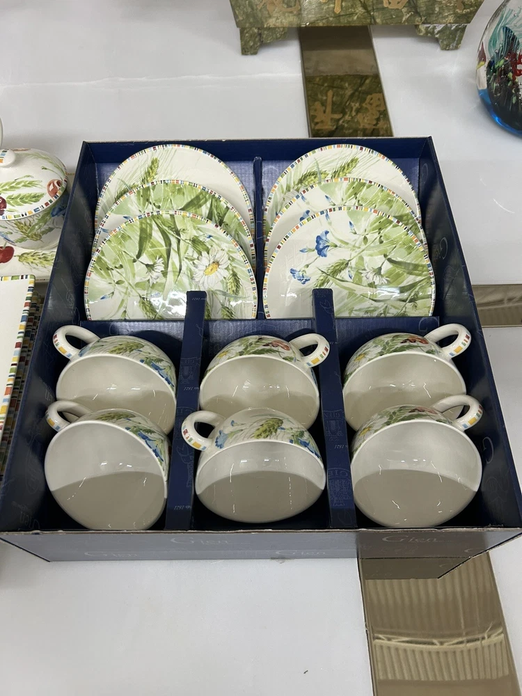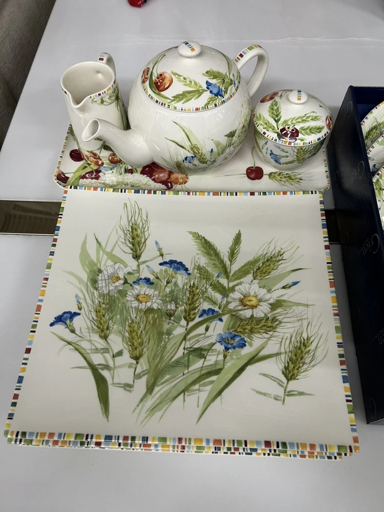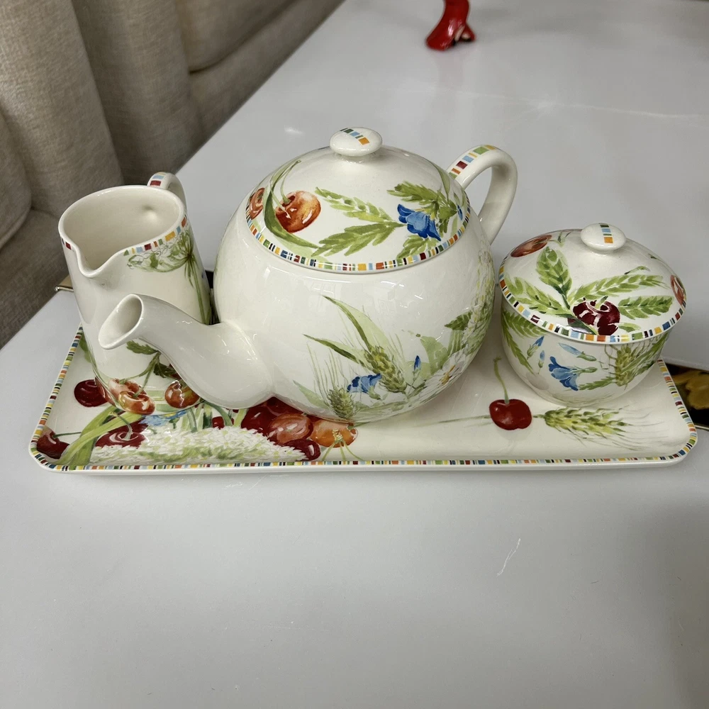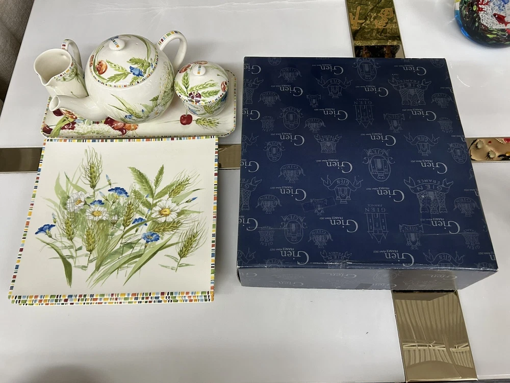This beautiful Faïencerie de Gien Cherry Full Breakfast Set in the GIECHER pattern is the perfect addition to any collector's kitchen. Made in France using traditional pottery techniques, this vintage set includes a round plate, cup, and plate set. The multicolor design features a charming cherry motif that adds a touch of whimsy to any table setting. Crafted from a combination of porcelain and ceramic, this set is both durable and functional. Ideal for breakfast or any special occasion, this Gien brand set is sure to impress. In perfect condition no damage