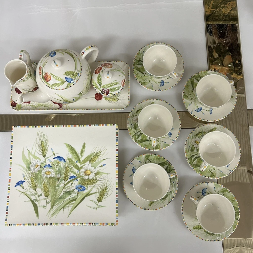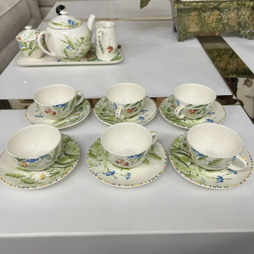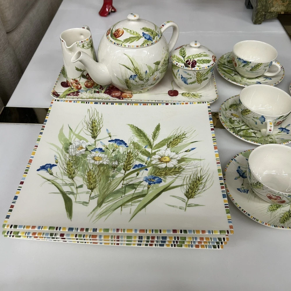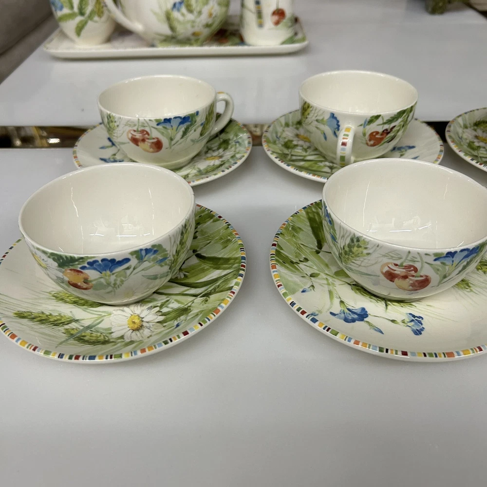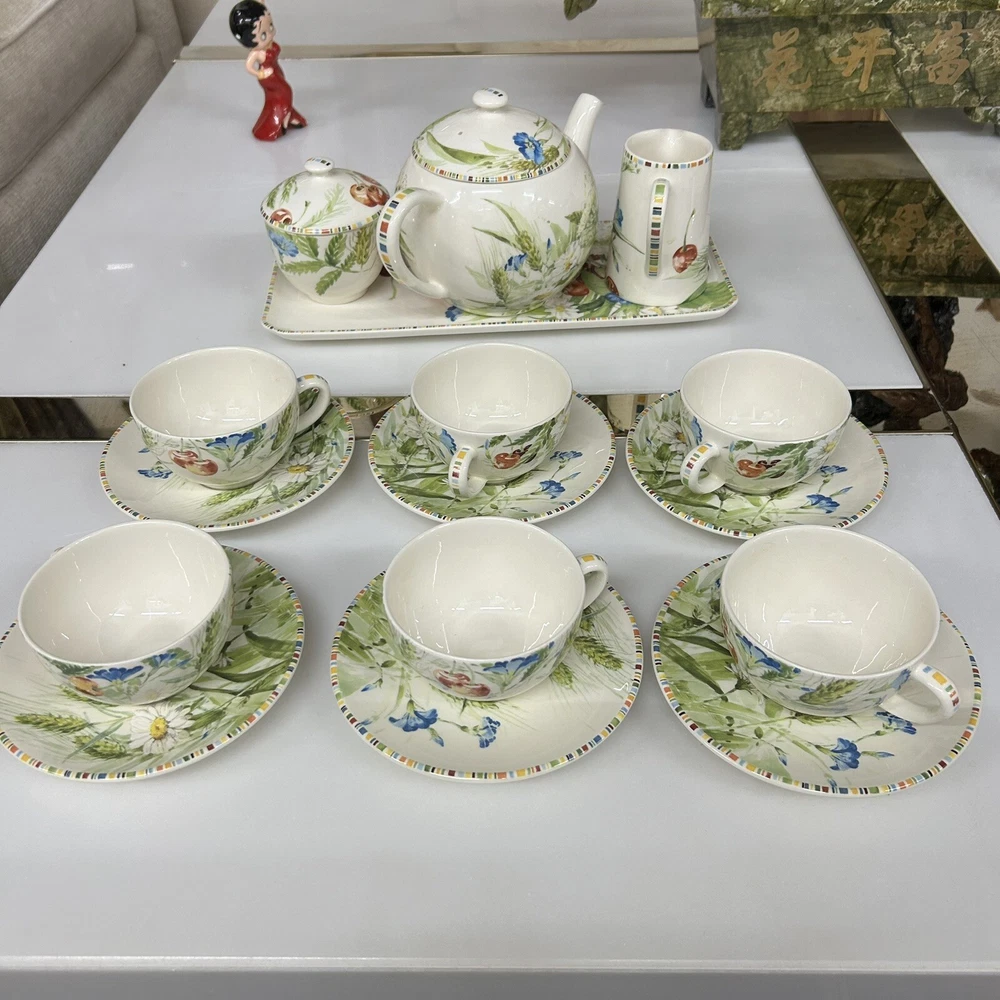 This beautiful Faïencerie de Gien Cherry Full Breakfast Set in the GIECHER pattern is the perfect addition to any collector's kitchen. Made in France using traditional pottery techniques, this vintage set includes a round plate, cup, and plate set. The multicolor design features a charming cherry motif that adds a touch of whimsy to any table setting. Crafted from a combination of porcelain and ceramic, this set is both durable and functional. Ideal for breakfast or any special occasion, this Gien brand set is sure to impress. In perfect condition no damage