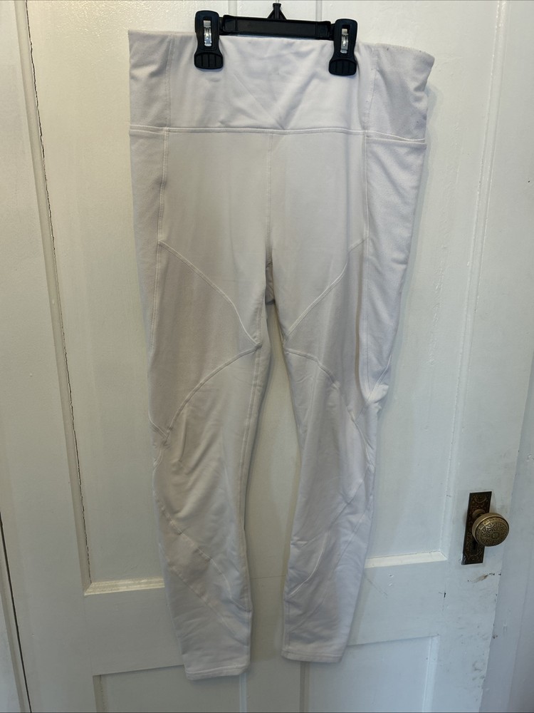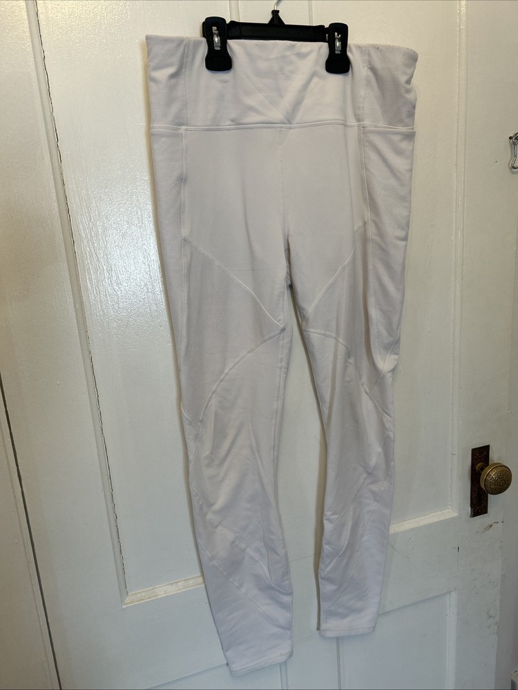 Fabletics High waisted, white winter straightleggings, double sided pocket , fleece lined , waist compression , tight fit spandex size large preowned wonderful condition .