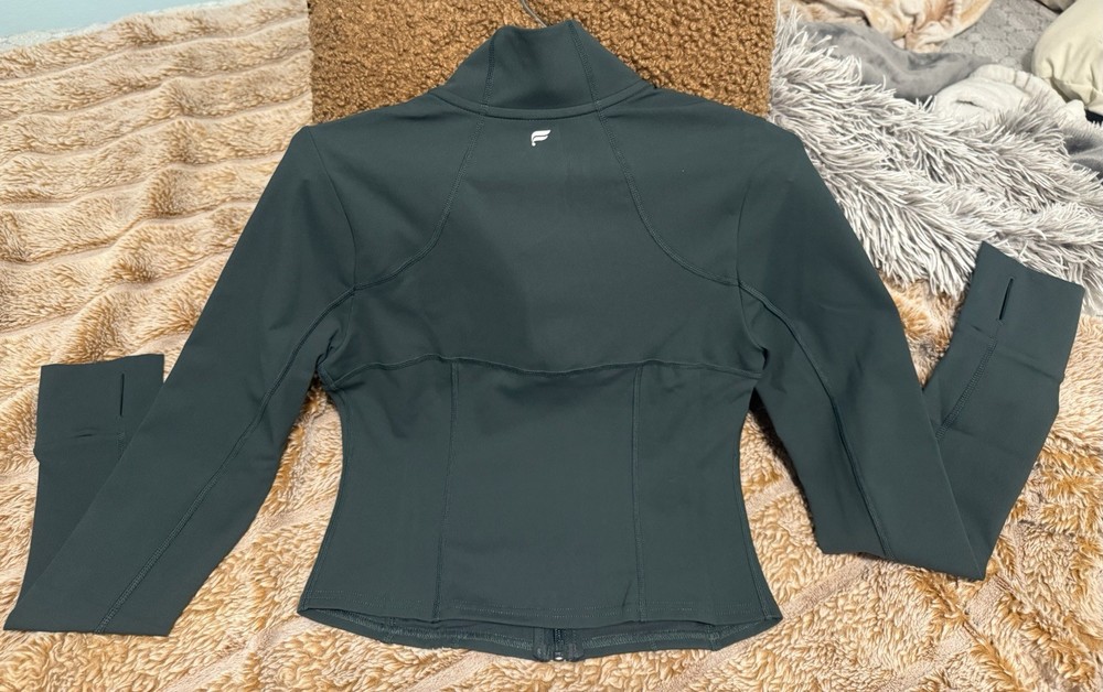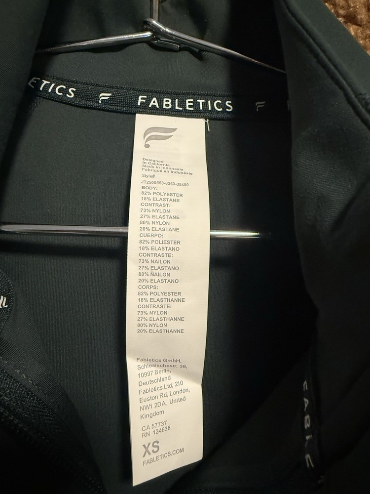 The Fabletics XS Corset Crop Hunter Green Long Sleeve Top Activewear . Original price $114.95 Made of polyester, this zipper top features a solid green color and a cropped style, ideal for summer, fall, and spring seasons. The long sleeves and compression area in the back provide support and comfort during workouts. Machine washable.