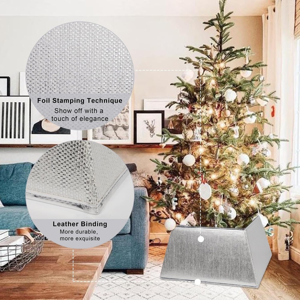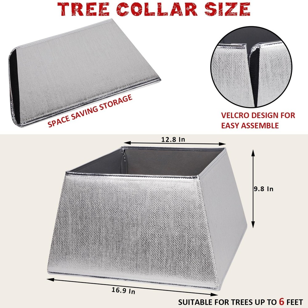 GREAT MATERIAL: This fabric tree collar Christmas decor consists of high quality polyester and cardboard inside, with foil stamping finishing on surface, will have a sparkling effect under light, add a subtle elegance to your Christmas tree. EASY ASSEMBLE: This Christmas tree ring comes in 1 piece, easy assembly by sticking Velcro. With the quick fold in no time after the holiday season is over, space saving storage guaranteed! ALTERNATIVE TO TRADITIONAL TREE SKIRTS: This fabric tree ring is a whole new twist on the traditional tree skirt, it completely hides the trunk of your Christmas tree while covering the tree stand, it's no appealing toy for toddlers, and there's no need to rearrange any cloth or get rid of the wrinkles. DIMENSIONS: 12.8 inch (top) diam. x 16.9 inch (bottom) diam. x 9.8 H inch. Note: We recommend using it for pencil trees and slim tree. Please measure your tree before purchasing to ensure it fits the collar. CHARMING CHRISTMAS DECOR: This beautiful Christmas tree collar offers long-term durability and beautiful elegant style to step up your holiday decorations, adds a unique atmosphere to your home.