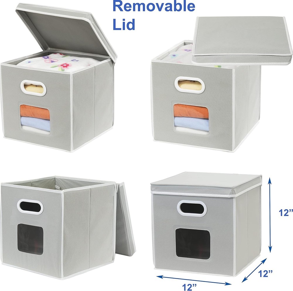 Clear Window Design: Front window makes it easy to see what's inside, perfect for quick access and organization Removable Stick-On Lid: Lid can be easily attached or removed with a self-adhesive strip for flexible storage Lightweight but Sturdy: Reinforced with 6 heavy-duty cardboard panels, including the lid and bottom, to hold shape well Stackable & Foldable: Stack to save space or fold flat when not in use Practical Size: Measures 12" L x 12" W x 12" H, great for storing clothes, toys, books, and more