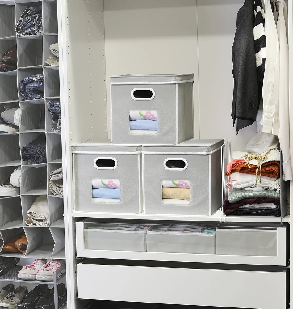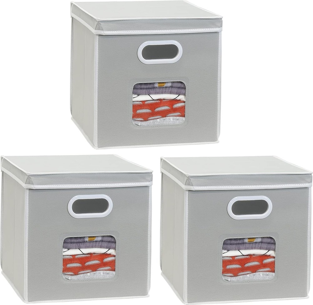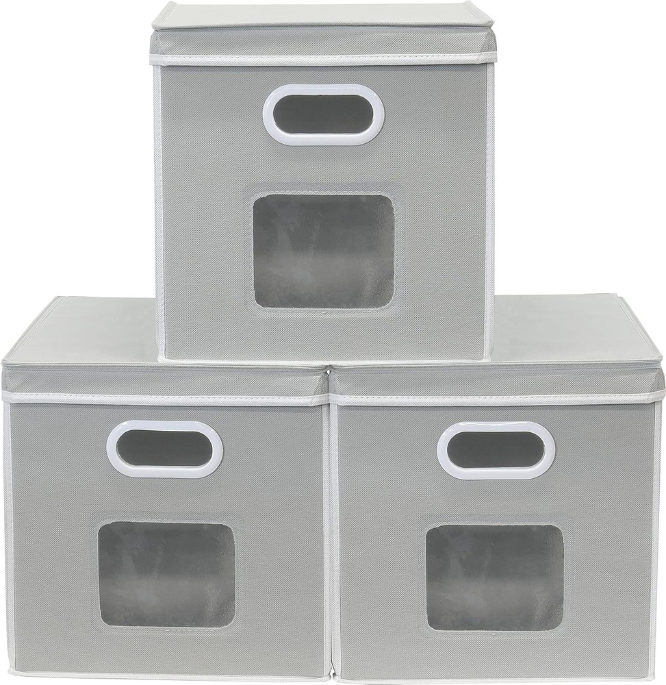 Fabric Clear Window Storage Cube with Lid 12x12 3-Pack Gray