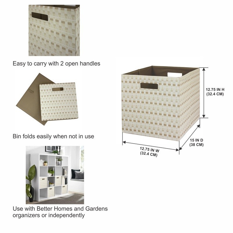 You may also like Durable Jute Storage Baskets Set of 4 Resin Cube Bins W/ Handles Organizing New 42.69 USD 44.94 USD Free shipping 5% off Natural Wood Stacking Bins 2-Piece Storage Baskets W/ Handles Home Organization 27.27 USD 28.71 USD Free shipping 5% off Handwoven Rattan Storage Basket Modern Weave Round Decorative Home Decor New 20.96 USD 22.06 USD Free shipping 5% off 6-Drawer Plastic Storage Cart Office Storage Bins with Organizer Top and Wheels 40.37 USD 42.49 USD Free shipping 5% off Closed Weave Polyester Black Decor Storage Basket Home Storage Organizer Bin 41.54 USD 43.73 USD Free shipping 5% off These Better Homes and Gardens Cube Storage Bins are a versatile and indispensable item for your home, office or small business. You can use them to store documents, files, toys, electronics, supplies, small equipment, kids to adult clothes and much more. This storage bin measures 12. 75" x 12. 75" x 15" with two handles to make it easy to carry and transport them. With a variety of colors to choose from, you'll be able to perfectly match your home decor when you get organized with our Fabric Cube Storage Bins. Includes 2 storage cube Ideal for storing books or kids and adult clothing in the bedroom, living room, laundry room or dorm rooms Can be used with our cube organizers (sold separately) or independently Folds flat for storage when not in use Dimensions of storage bin: 12. 75" Wide x 12. 75" Height x 15" Deep 2 Pack 21 Inch Moss Poles Stackable Coir Support Stakes Climbing Plants Indoor 19.12 USD 20.13 USD Free shipping 5% off Dish Drying Rack for Kitchen Counter - Large Dish Rack with Drainboard, Black 42.68 USD 44.93 USD Free shipping 5% off Super Stretch Non Slip Sofa Cover Spandex Washable Couch Protector Kids Pets New 32.38 USD 34.08 USD Free shipping 5% off 15 Pack Meal Prep Containers 32oz, Plastic Food Prep Containers, Leakproof 22.07 USD 23.23 USD Free shipping 5% off 10 Pack Fridge Organizer, Stackable Refrigerator Organizer Bins w/Lids, BPA-Free 39.73 USD 41.82 USD Free shipping 5% off Set of 4 Throw Pillow Inserts Decorative Pillows Sofa Couch Bed Plush Filling US 32.38 USD 34.08 USD Free shipping 5% off 5Pack Decent Metal Plant Stands, Heavy Duty Flower Pot Stands for Multiple Plant 30.9 USD 32.53 USD Free shipping 5% off Bird Feeder, Bird feeders for Outdoors Hanging Metal Bird Feeder with Perches 35.32 USD 37.18 USD Free shipping 5% off Food Containers For Airtight Takeout Meal Prep Storage, BPA-Free, Dishwasher 60.45 USD 63.63 USD Free shipping 5% off 120 Pack Galvanized Landscape Staples Garden Stakes Plant Cover Stakes 6 Inch 26.49 USD 27.88 USD Free shipping 5% off Easy-Going Stretch Sofa Slipcover 1Pce Sofa Cover Furniture Protector Couch Soft 39.74 USD 41.83 USD Free shipping 5% off 2 Cup Glass Storage Containers with Lids, Set of 4 Glass Food Storage Container 23.54 USD 24.78 USD Free shipping 5% off