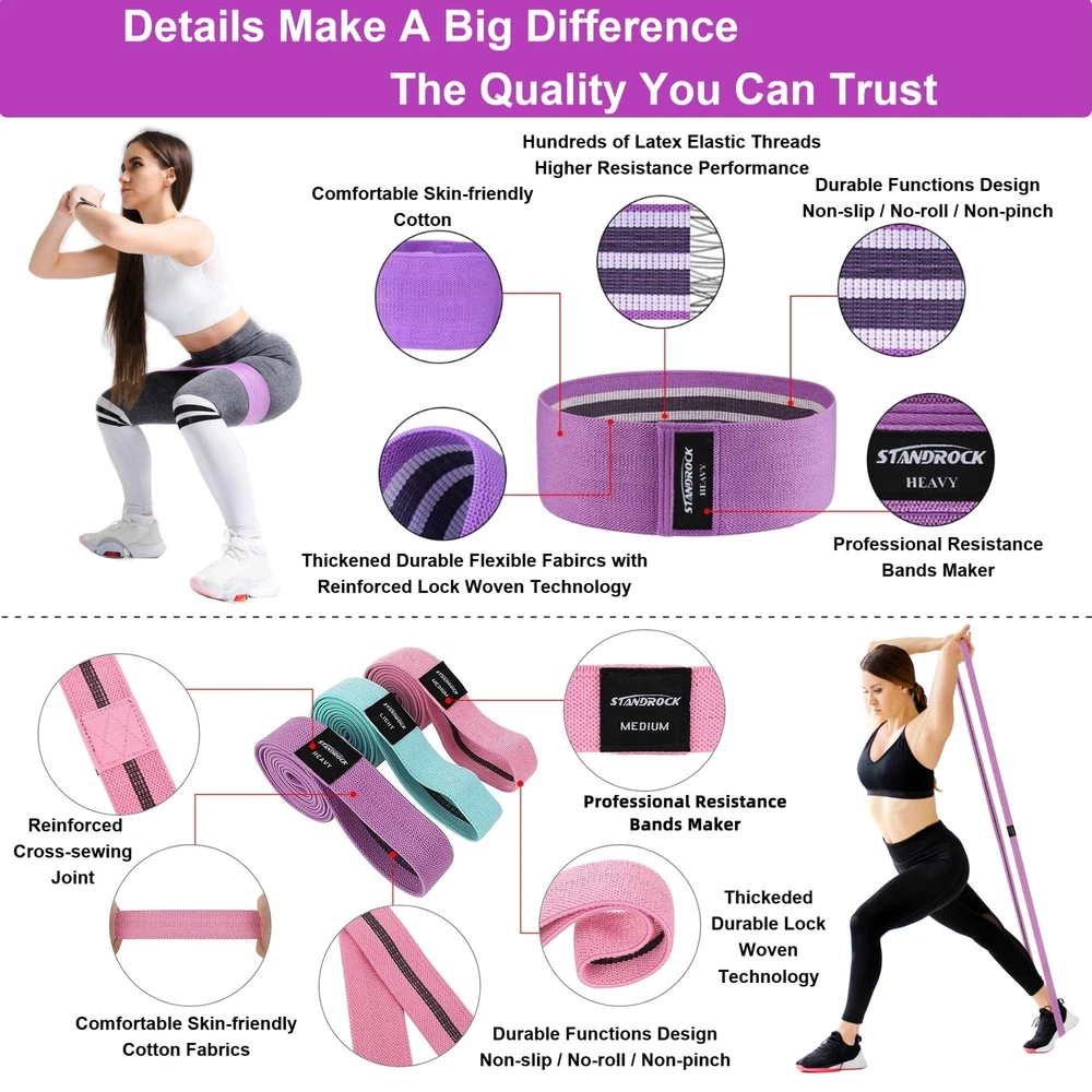 ✅【New Upgraded Resistance Band with Exercise Guide】Fabric booty bands for working out help to exercise your glute and legs. long resistance bands for working out focus on upper body, chest, shoulders and back. the perfect 6pcs cloth resistance bands work together to help you shape a beautiful figure,and relieve pressure and fatigue effectively. ✅【Perform Better Exercise Bands】Traditional rubber & latex loop bands or pull up bands are harsh to your skin, and break completely after using some time. But our fabric resistance band made of quality thickened durable skin-friendly cotton fabric woven with thousands of high elastic threads inside, which won't break,and create more excellent performance of nonslip and non roll-up than rubber resistance loops bands. With Improved elasticity and comfortability, maximize comfort and avoid hurt. ✅【6 in One Multi-function Workout Bands】6pcs of exercise bands resistance bands set is Equal to A Gym. Our each strength bands with a different amount ranges from 15 to 135 lbs (3pcs together used) to workout different body parts. The leg bands for working out improve your legs,hips and thighs. The long excersize bands resistance can be used as stretching bands,physical therapy bands,weight bands,cross training bands,yoga band,pilates bands etc. The most powerful fitness bands for women & men! ✅【Workout Anywhere Anytime】The elastic bands for exercise are lightweight and portable. It comes with two carry bags to go anywhere with you.you can put the stretch bands for exercise in your gym bag without taking up much space. Applicable for resistance training at travel, home, gym, office, outdoors etc. This versatility expands your workout needs whether they be at the gym or at the comfort of your home or on the go. ✅【What You Get】The Gym In Your Pocket. 6pcs of resistance bands with 2pcs carry bag. our worry-free 18-month warranty, and friendly customer service. always stand behind the quality of our products. ORDER NOW NO RISK!