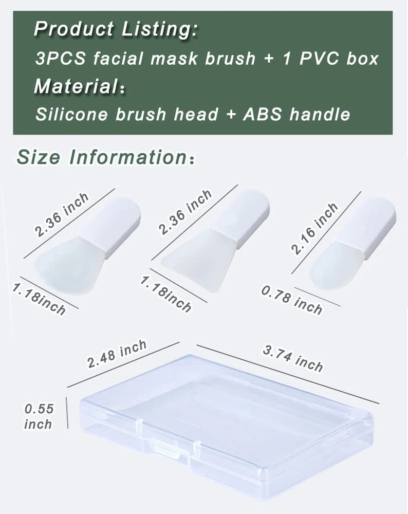 Store New Arrivals Add to Favorite View Feedback Contact Fast deliveries to the customer's home Quality customer service John Make the customers happy! Face Mask Applicator Brushes, Mini Makeup Spatula Portable Beauty Tools Set for Facial Mud, Cosmetic Mask, Facial Clay, Eye Mask, Body Lotion, Body Butter, Serum, Cream. 3PCS Soft Silicone Brush Suit Description Tiny and Portable: Our silicone face mask brush is a compact ,convenient, handheld mini jelly brush for applying facial, eye, other skincare products. This facial mask tool set can easily fit in a small makeup bag or handbag, no matter for travel or a short leave, never to be worried too big that can’t be carry with you (Contains a transparent pvc storage box). Silicone Brush Head: The brush head is made of soft silicone, safe and non-toxic, soft and not easy to break, and can be reused.easy to clean, quick drying. Different shape heads to meet your different mask needs; The sector-shape head fits Apply mask ,The small tongue-shape head fits nose edge and other details, The shovel-shape head fits thick mud mask or scraping mask. Comfortable Handle:The handle is made of high-quality smooth ABS Material, Waterproof and long use without cracking; Stick firmly, you don't need worry the brush head comes apart from the handle. Wide Application:As as DIY makeup tool and skin care tool, these soft silicone mask brushes are suitable for clay mask, mud mask, powder mask, ointment, cream, body lotion, facial essence and DIY mask making and mixing. How to Use: 1. Scoop out your skincare with the brush. 2. Use the brush to apply a thin layer of skincare products evenly on the face. 3. Rinse off remaining product with lukewarm water and store in a dry place until next use. Product Description Tiny and Portable Our silicone face mask brush is a compact ,convenient, handheld mini jelly brush for applying facial, eye, other skincare products. This facial mask tool set can easily fit in a small makeup bag or handbag, no matter for travel or a short leave, never to be worried too big that can’t be carry with you (Contains a transparent pvc storage box). Silicone Brush Head The brush head is made of soft silicone, safe and non-toxic, soft and not easy to break, and can be reused.easy to clean, quick drying. Different shape heads to meet your different mask needs; The sector-shape head fits Apply mask ,The small tongue-shape head fits nose edge and other details, The shovel-shape head fits thick mud mask or scraping mask. Comfortable Handle The handle is made of high-quality smooth ABS Material, Waterproof and long use without cracking; Stick firmly, you don't need worry the brush head comes apart from the handle. How to Use Scoop out your skincare with the brush. Use the brush to apply a thin layer of skincare products evenly on the face. Rinse off remaining product with lukewarm water and store in a dry place until next use. Wide Application As as DIY makeup tool and skin care tool, these soft silicone mask brushes are suitable for clay mask, mud mask, powder mask, ointment, cream, body lotion, facial essence and DIY mask making and mixing. Color white Bristle Material Silicone Product Dimensions 2.36 x 1.18 x 0.26 inches; 1.06 ounces Material Silicone, Acrylonitrile Butadiene Styrene Country of Origin China Brush Length 3 Centimeters Age Range (Description) Adult Recommended Uses For Product Makeup Spatula Skin Type All Item Form Stick Number of Pieces 3 ABOUT US We offer the best prices around on high quality products. Our E-store includes media such as books, movies, music and games while offering electronics, toys, sporting apparel, clothing, tools, general home, garden items and more. SHIPPING We are always working hard to ensure your package arrives as soon as possible. Please understand that some factors like weather, high postal traffic, and the performance of shipping companies are outside of our control. We offer free shipping to the lower 48 states and ship within 2 business days of payment, usually sooner. We do not accept P.O. Boxes. Please provide a physical address. For shipping outside of the continental USA, we only use eBay's Global Shipping Program. The item is shipped to KY and then sent to the rest of the world. International customers are responsible for all duties and taxes. Continue to 'check out' to calculate costs for shipping the item to your country. Messages regarding eBay's Global Shipping Program MUST be directed at eBay EXCLUSIVELY. RETURNS We offer a 30-Day Return Policy on items in which you are not completely satisfied with. You have the option of a full-refund or an exchange of the item. No returns are available on items shipped outside of the USA PAYMENT We accept PayPal. CONTACT US This page content is yet to come Please ad us to your favorite seller and visit again later Thank You CUSTOMER SATISFACTION We try our very best to make sure every customer is completely satisfied. If there's a problem, message us! We're happy to help. WE ACCEPT