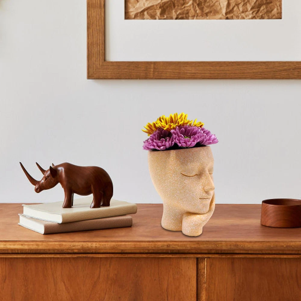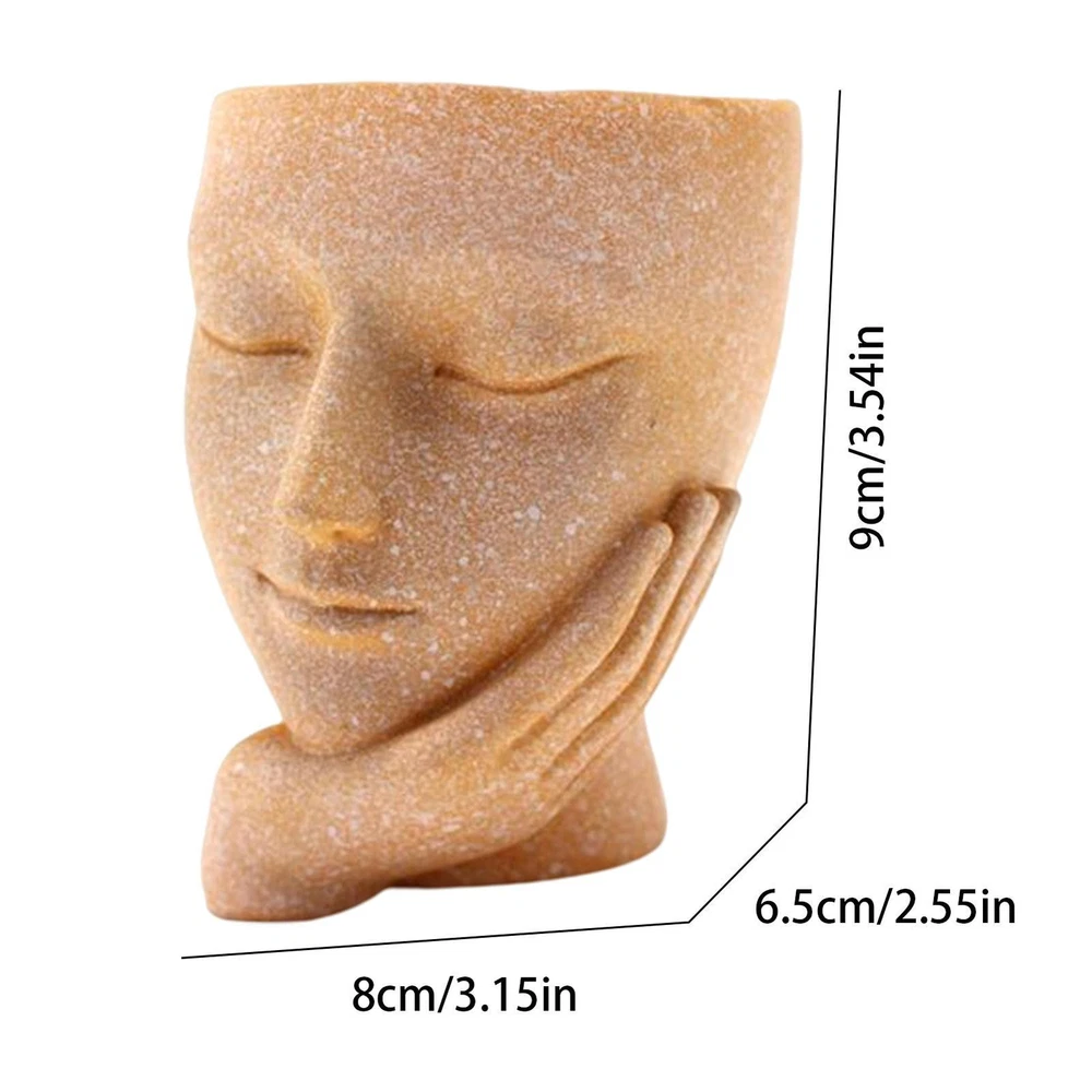Bullet Points: Durable Construction: Face planter are made of high-quality resin, which is different from ceramic textures, resin textures planter is more durable and sturdy. Drainage Hole Design: This pot heads for plants is with Drainage Hole inside the tree stump. The drainage hole opens at the Bottom of The Pots To Keep Your Plants Grow And Breath In Health. Adorable Lady Style: Head Planter makes the whole home full of strong artistic style. With a super cute lady shape with eyes closed, it is very small and cute. It is perfect as a home decor. Versatile In Use: A simple and sleek contemporary petite Beautifully glazed with an elegant, attractive color plant pot.Gardening props, suitable for decorative gardening, desk Best Gift: Creative face planters pots head is the best gift to kids, parents, lovers, and friends, shows the passion for life for a touch of clean, modern style in your living space. Features: High-quality material: made of high-quality resin. Flower pots are light weight and durable. Function:Decorative succulent plant pot with drainage holes to drain excess water Scope of application: Perfect for succulents, cactus plants, small plants, and be used as candle holders Material: resin Size: 6.5*8*9CM\2.55x3.14x3.54in Style: as shown in the picture Product List Girl's face flower pot *1